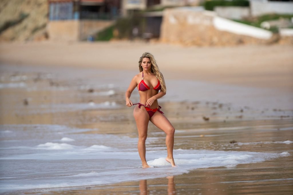 Bianca Gascoigne (32) aparece mostrando sus habilidades con la pelota en un bikini rojo en Portugal (noviembre de 2018). Esto ocurre después de que el padre de la estrella de reality fuera acusado recientemente de agresión sexual en un tren. Bianca ha estado recientemente en un campamento de entrenamiento en Portugal y los resultados se pueden ver claramente.