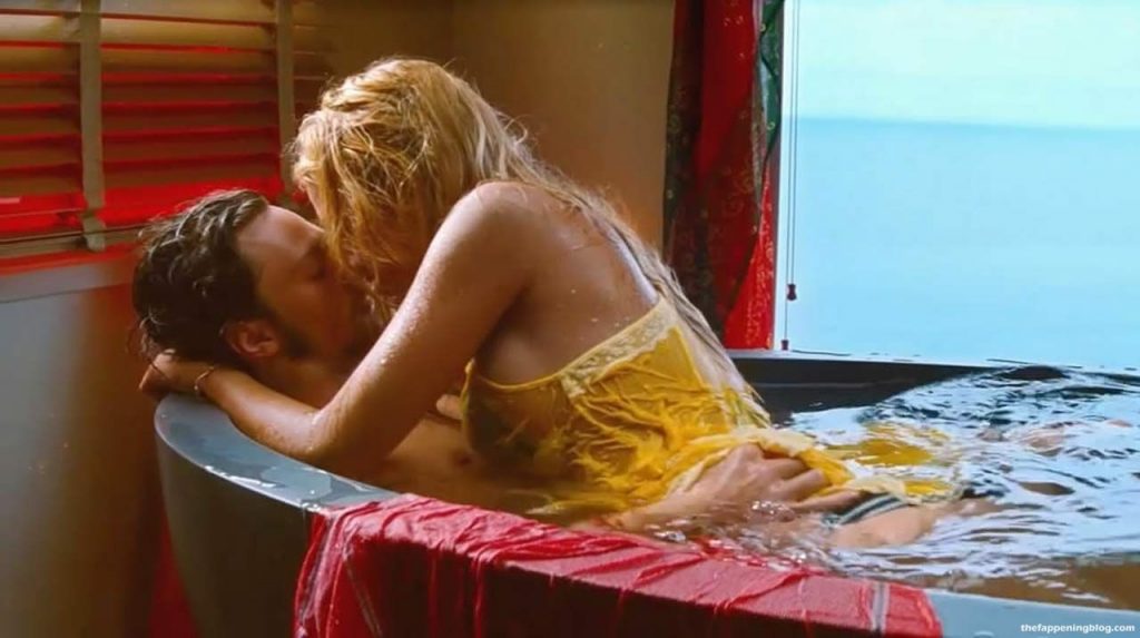 In the first scene, you can see Blake Lively on her back underneath a guy. Her legs are wrapped around him, and they are having hot intensive sex on the couch! Then there’s the other scene. Next, Blake is climbing into a bathtub with a guy and kissing him! Then her yellow dress is getting wet, and we can see the bikini underneath! The guy then carries her to a bed, where he lifts her legs and takes her panties off to fuck her hard!