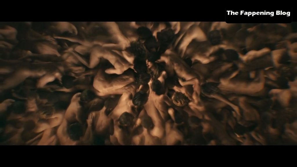 Blake’s breasts are visible in a kaleidoscopic image of her naked body intertwined with many others!