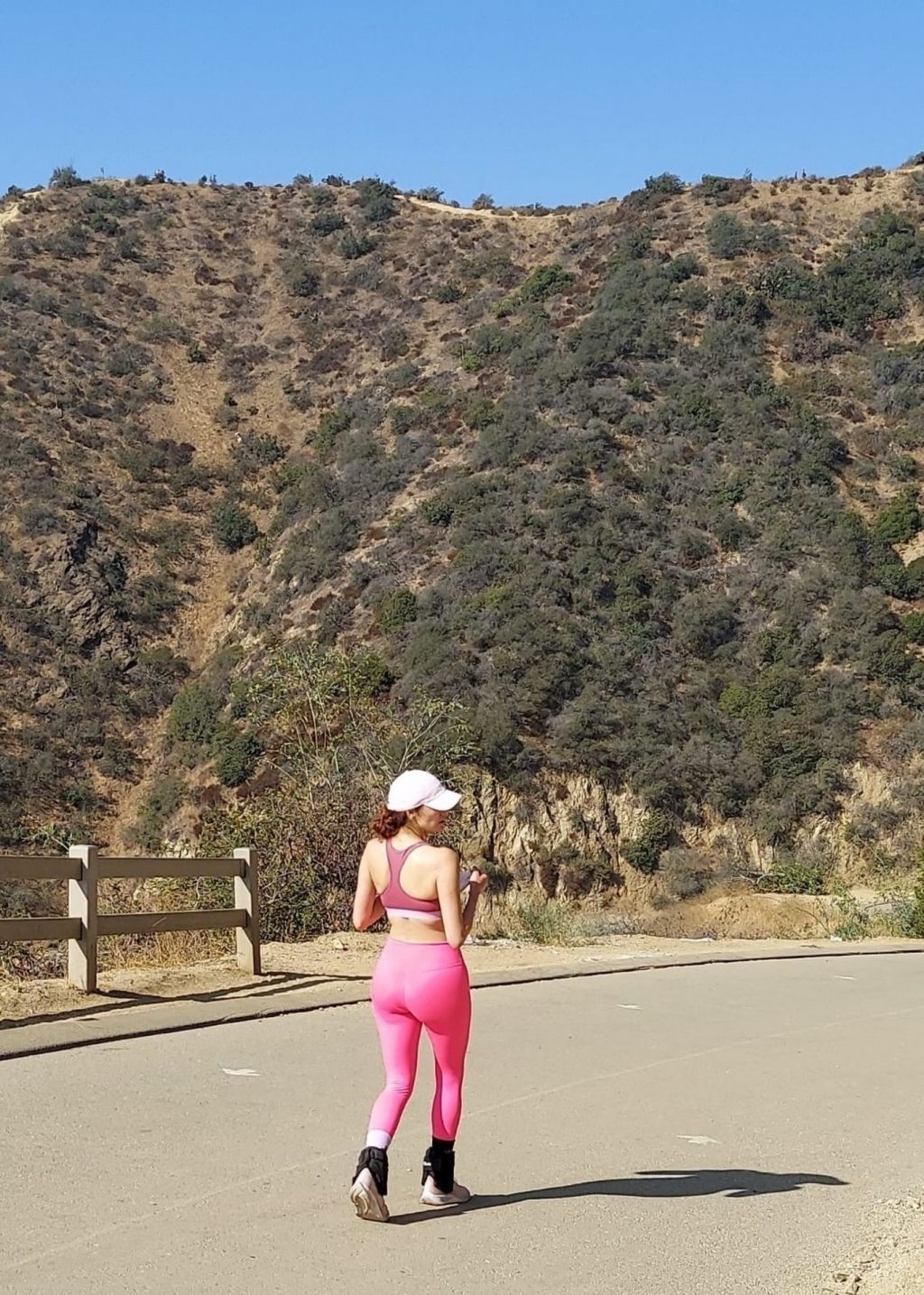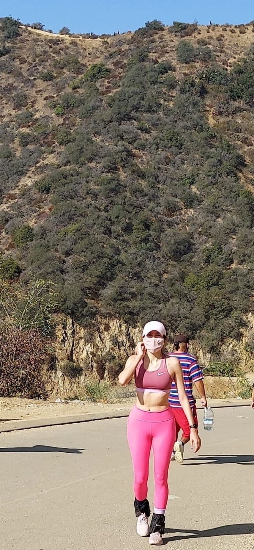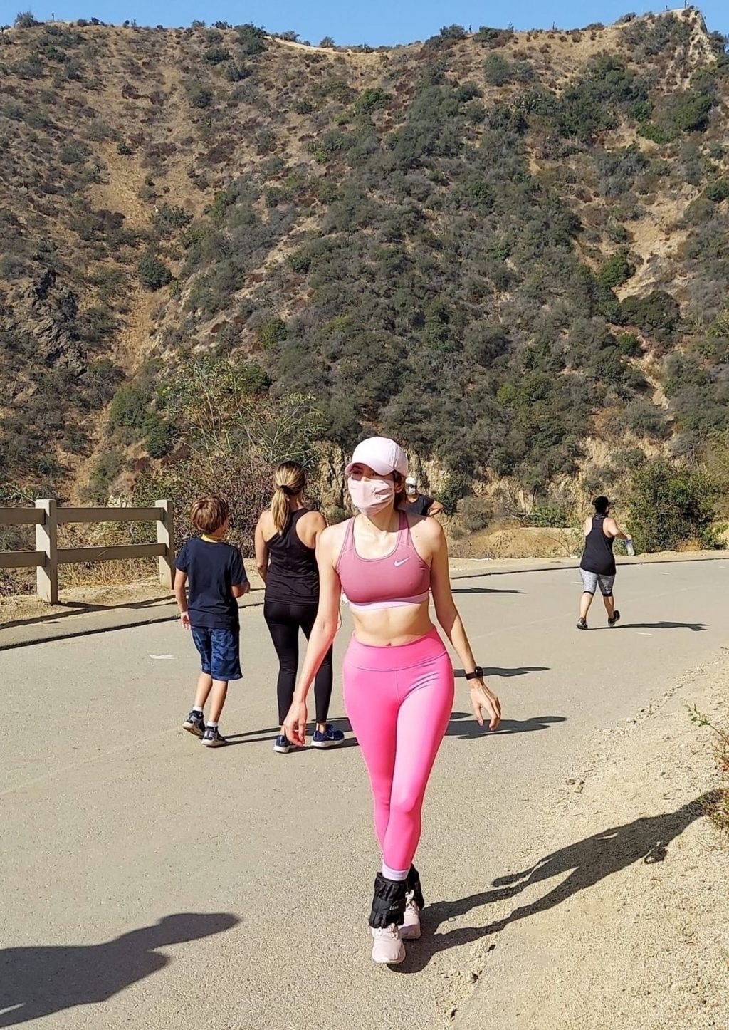 Sexy actriz Blanca Blanco es vista haciendo senderismo en las colinas de Hollywood usando leggings rosa brillante, top deportivo Nike y pesas en los tobillos, 22/09/2020.