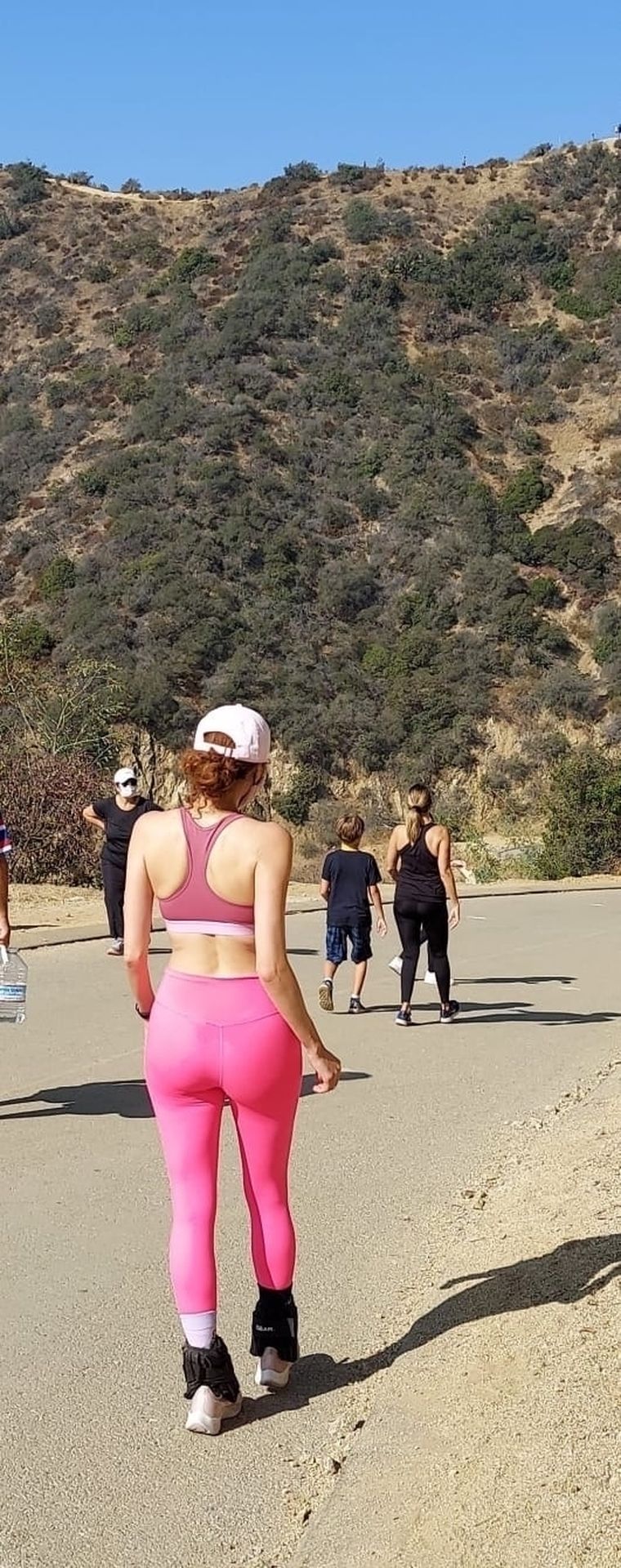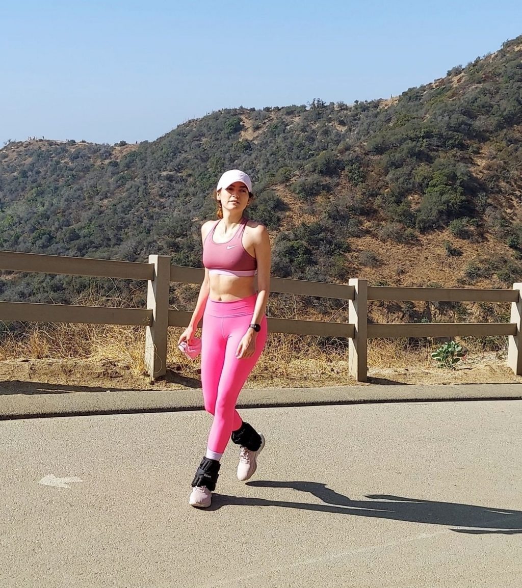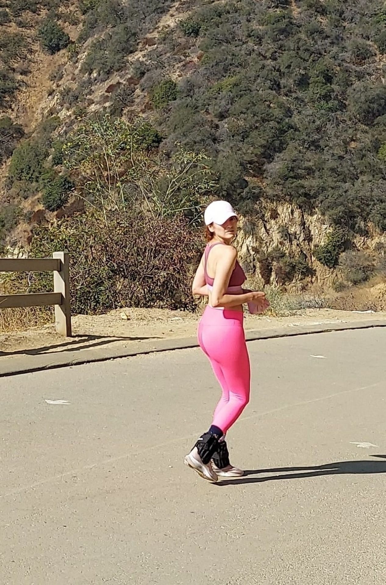 Sexy actriz Blanca Blanco es vista haciendo senderismo en las colinas de Hollywood usando leggings rosa brillante, top deportivo Nike y pesas en los tobillos, 22/09/2020.