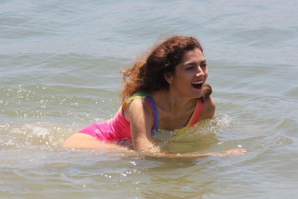 Blanca Blanco fue vista mientras se divertía en Paradise Cove en Malibu usando un traje de baño de una pieza a rayas con los colores del arcoíris, 23/07/2018.