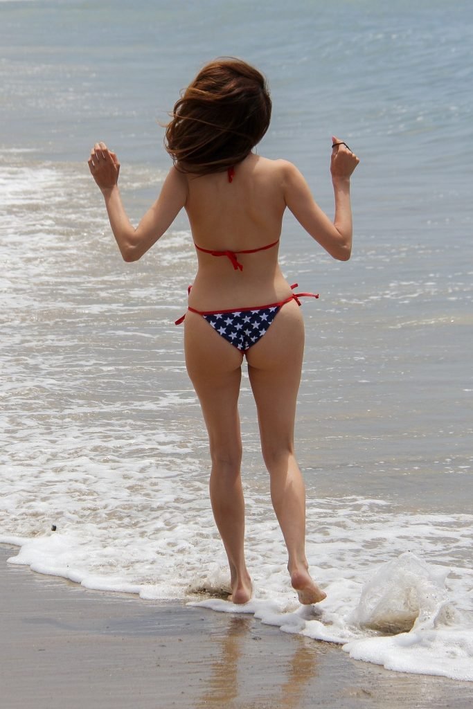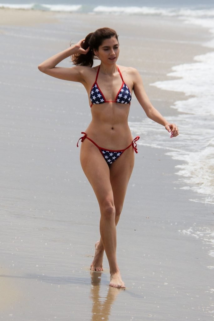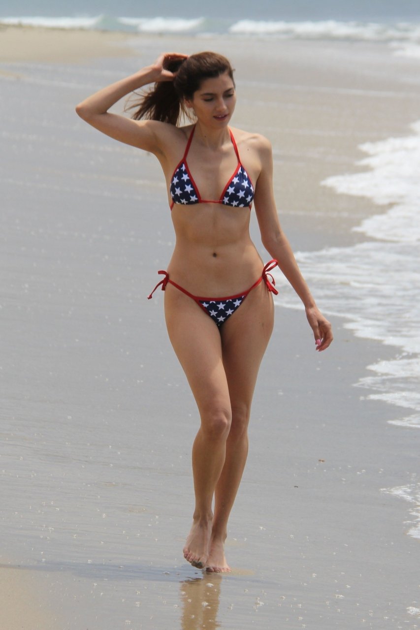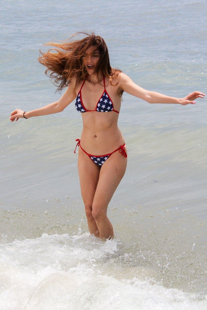La actriz Blanca Blanco celebra el Día de la Independencia en Malibu, vistiendo un bikini con estrellas mientras juega en las orillas del océano, 04/07/2018.