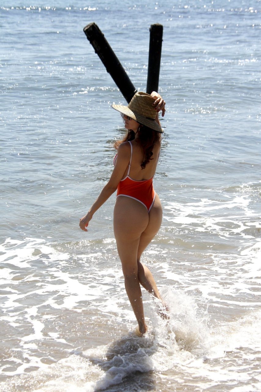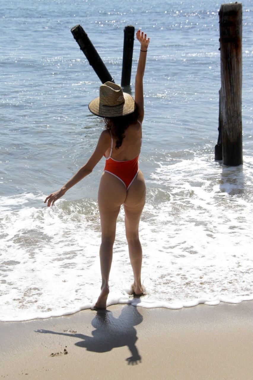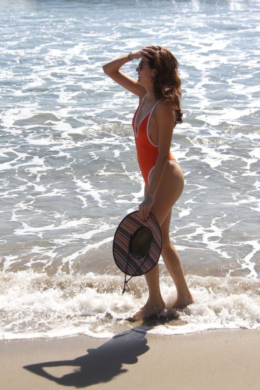Actriz Blanca Blanco lleva un traje de baño de una pieza naranja sexy mientras da un largo paseo por la playa en Malibu, 10/10/2019.