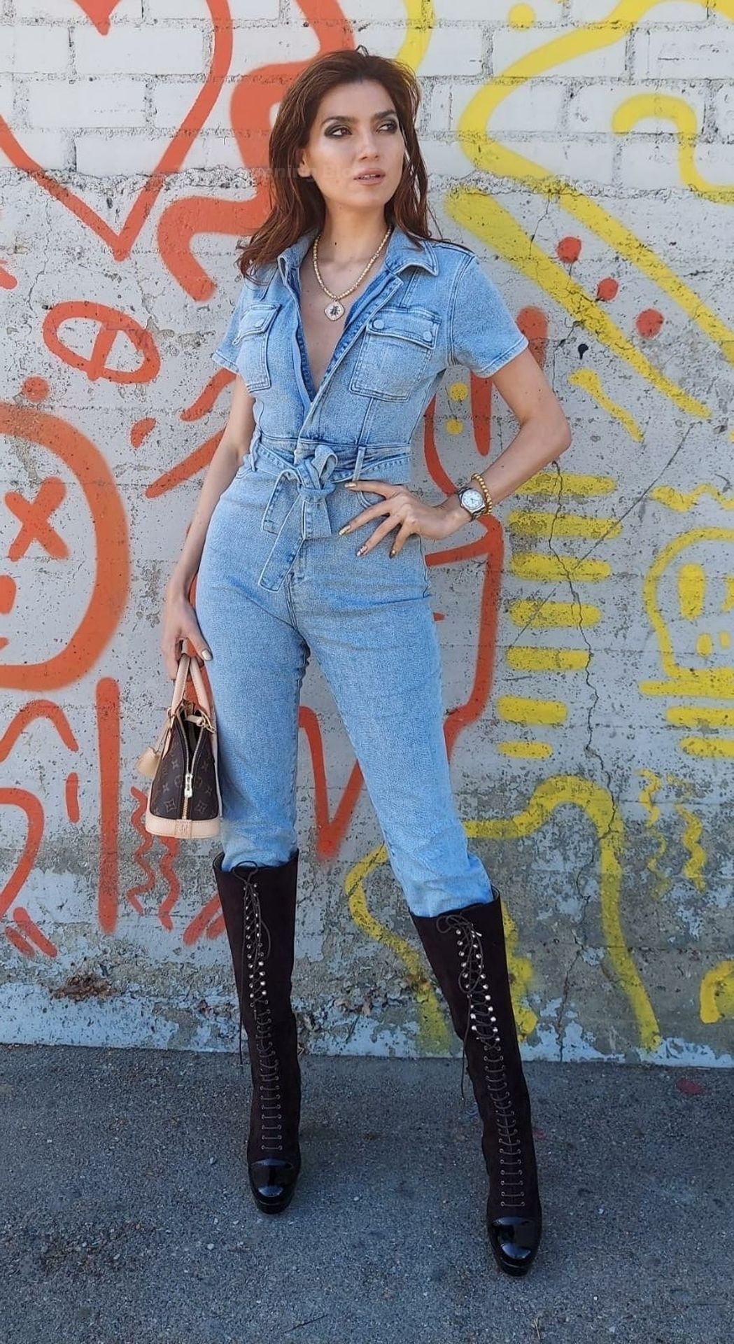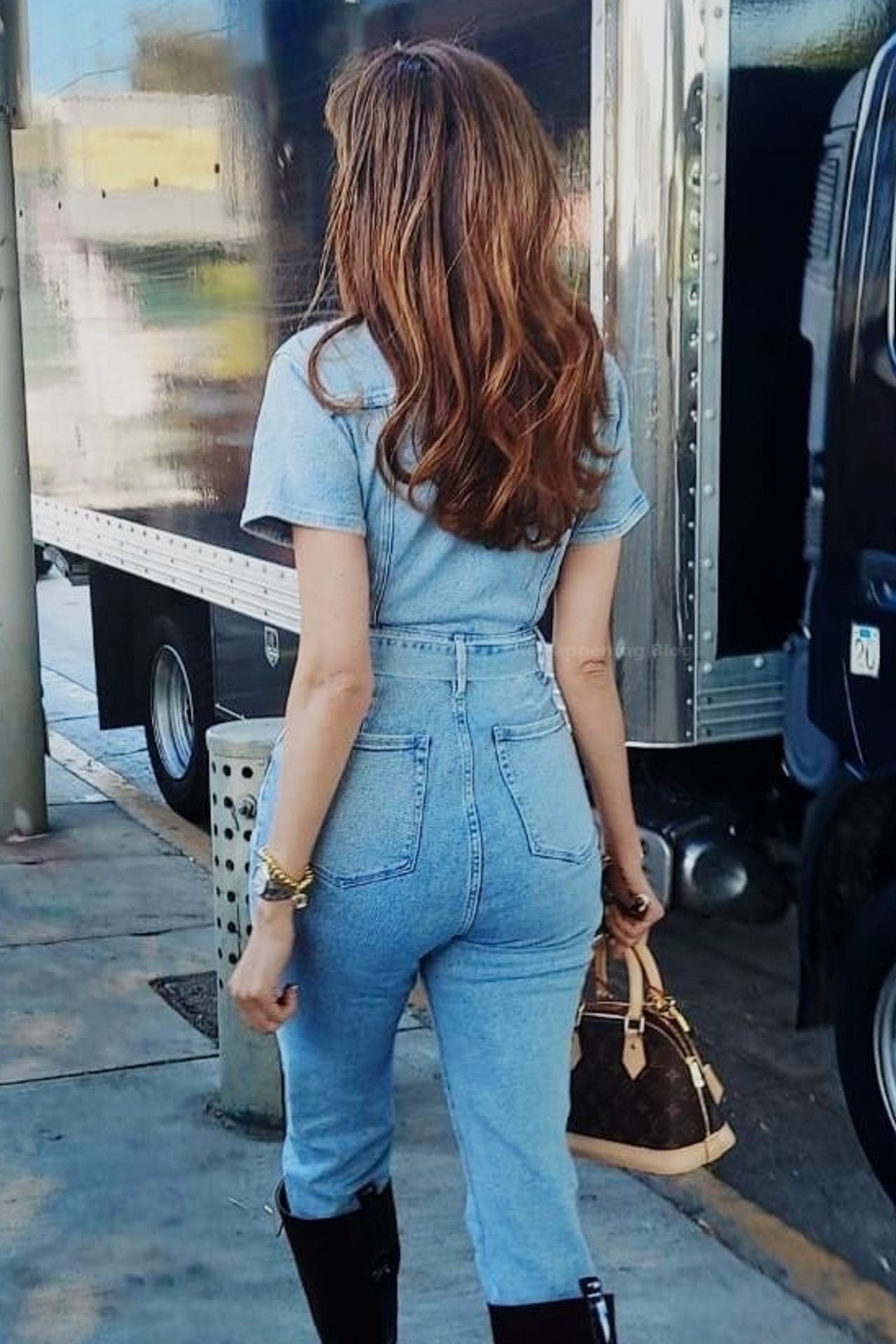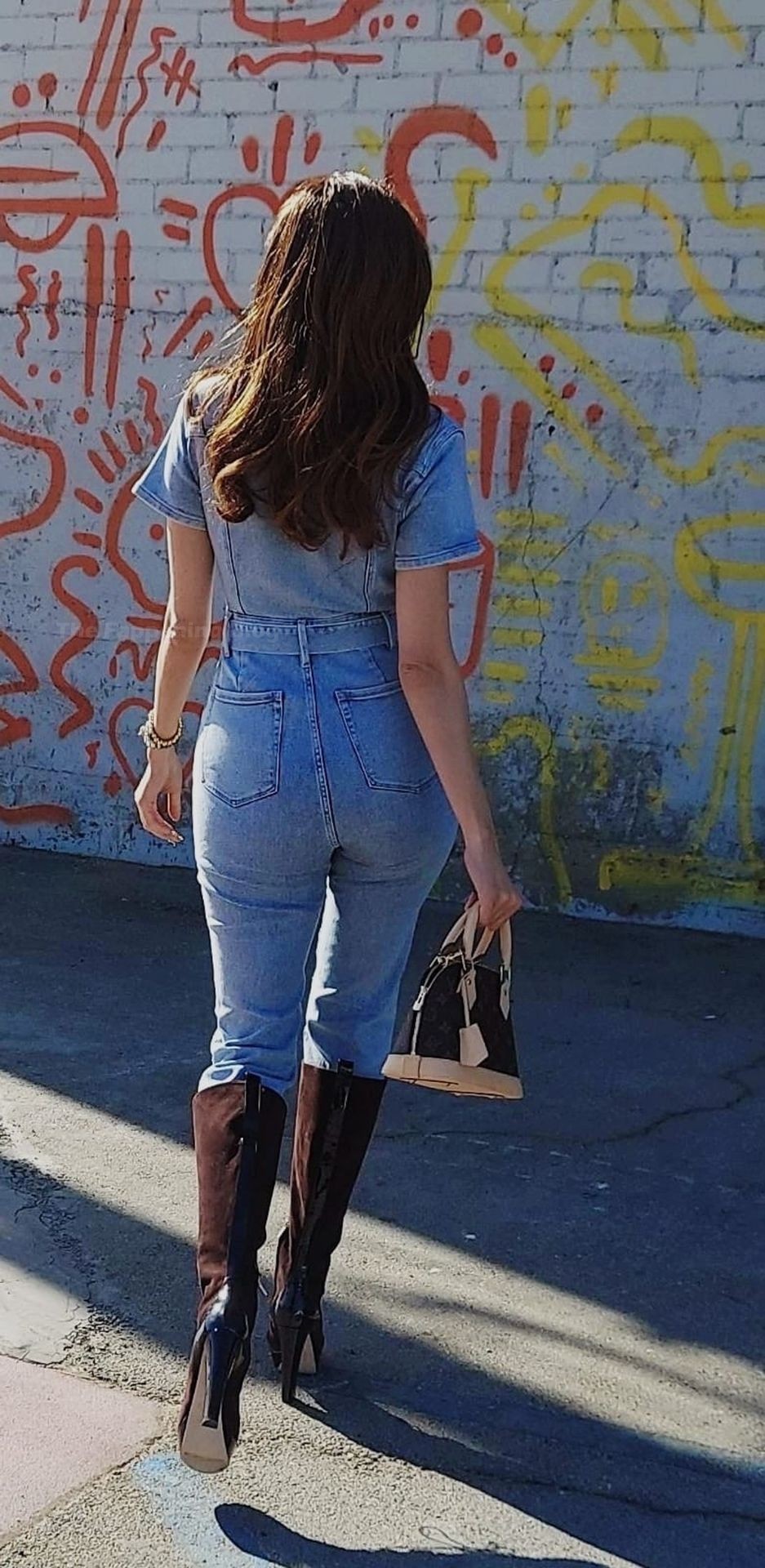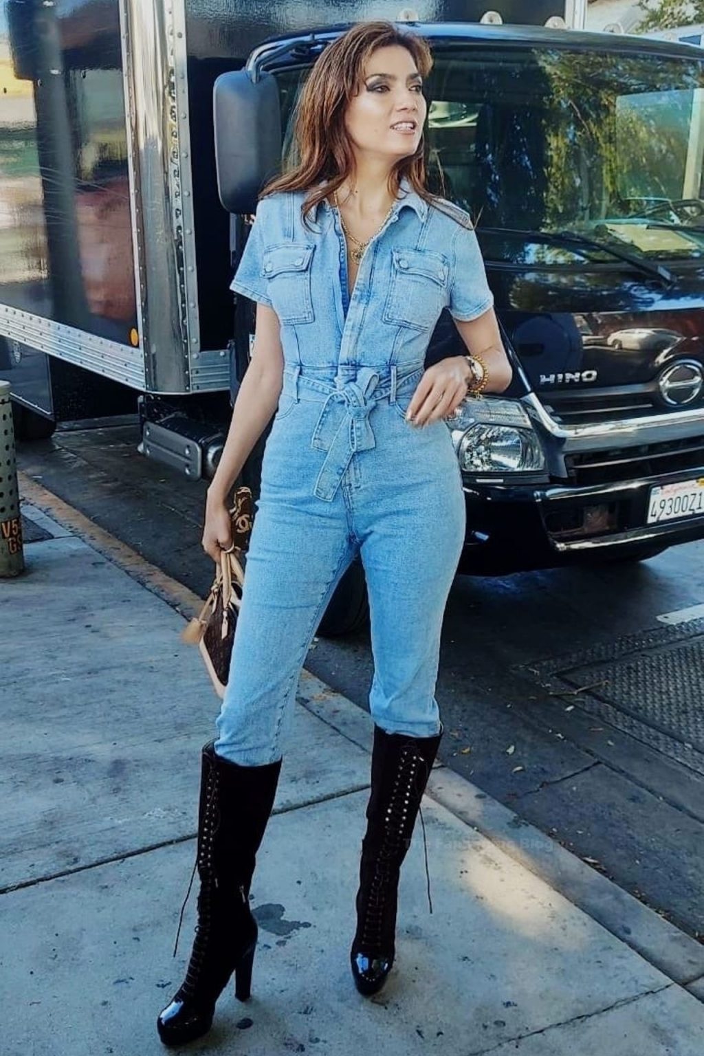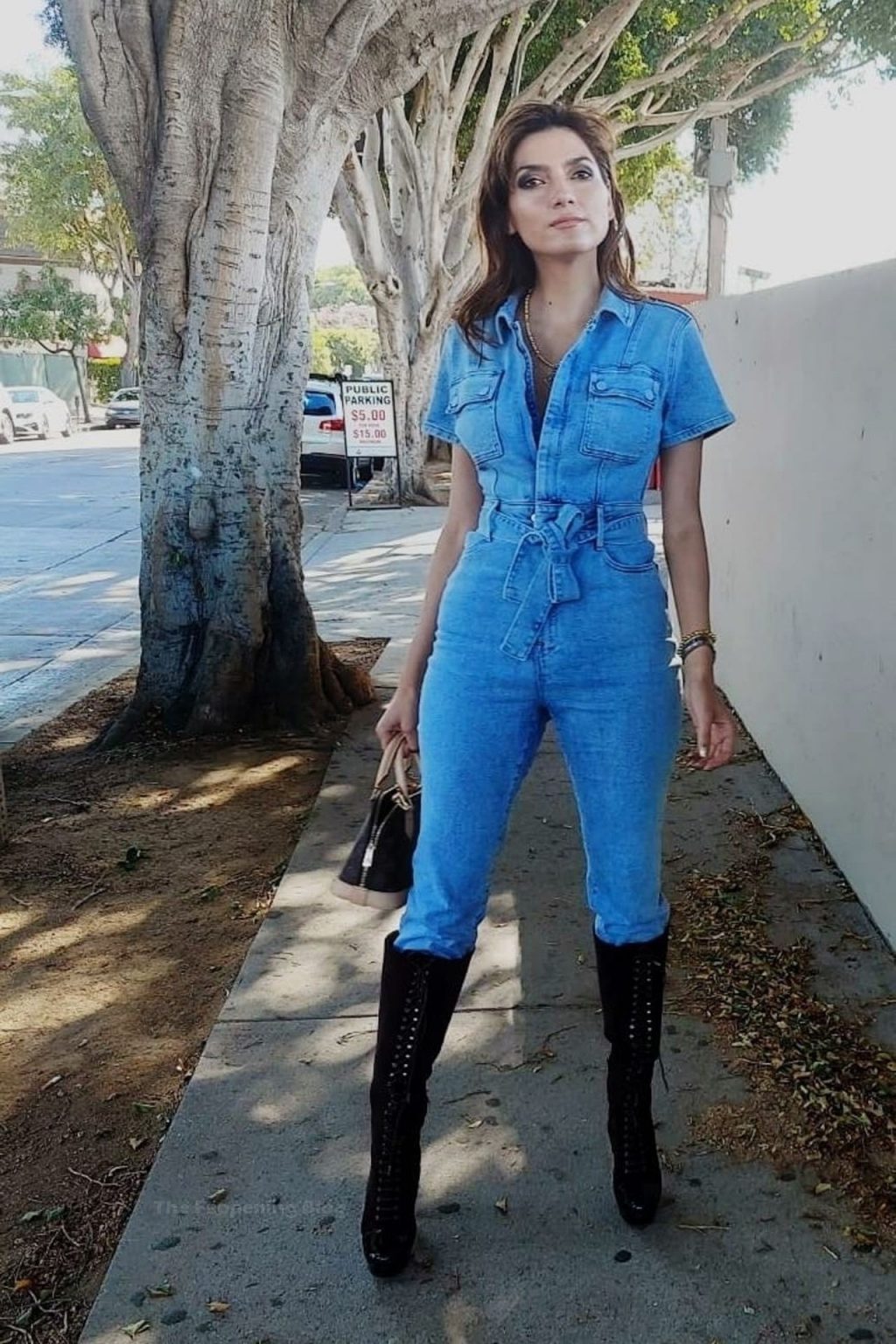Actriz Blanca Blanco lleva un mono vaquero para una sesión de fotos en la calle en Los Ángeles, 11/09/2020.