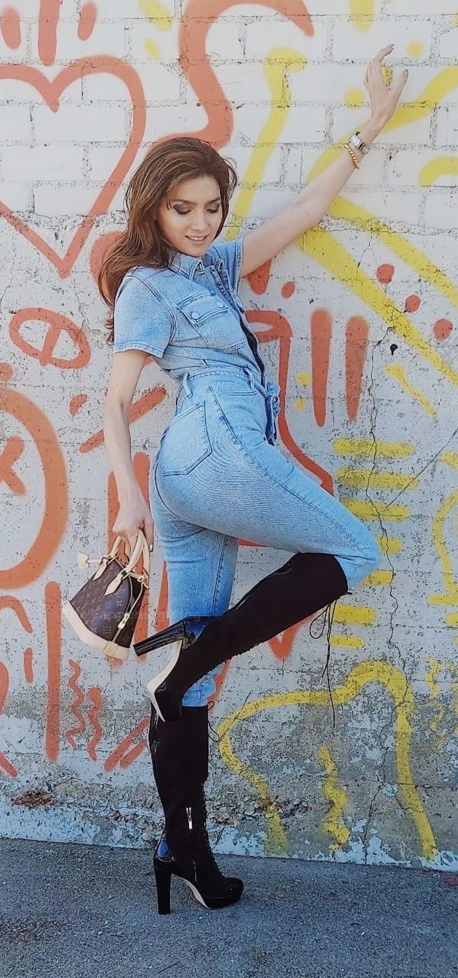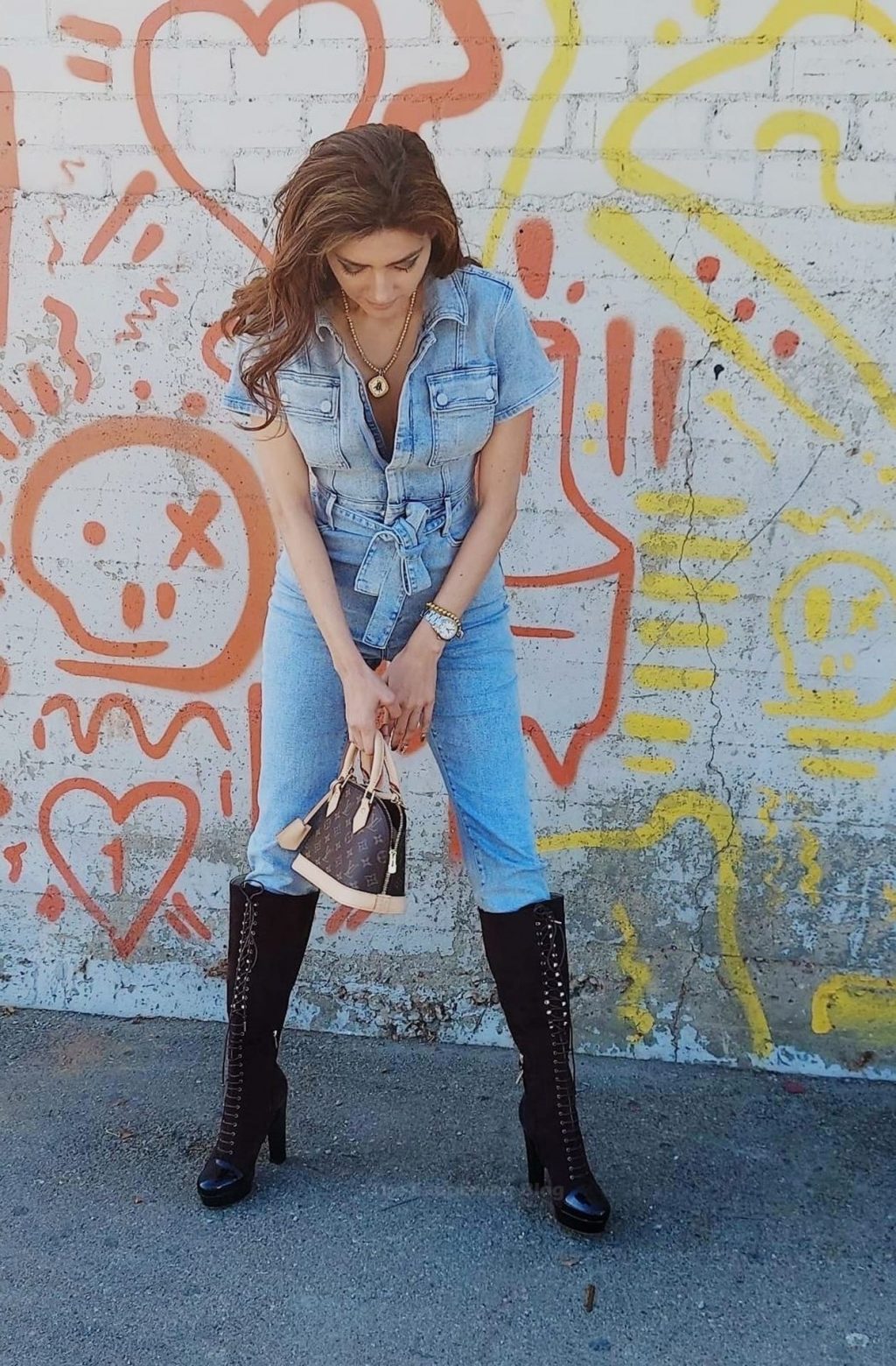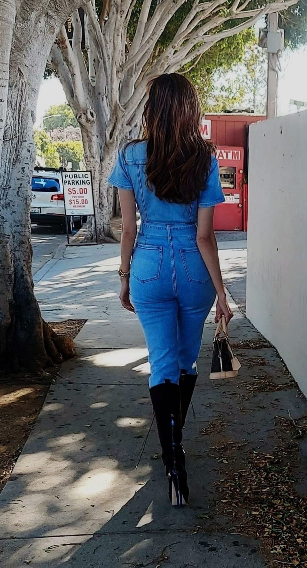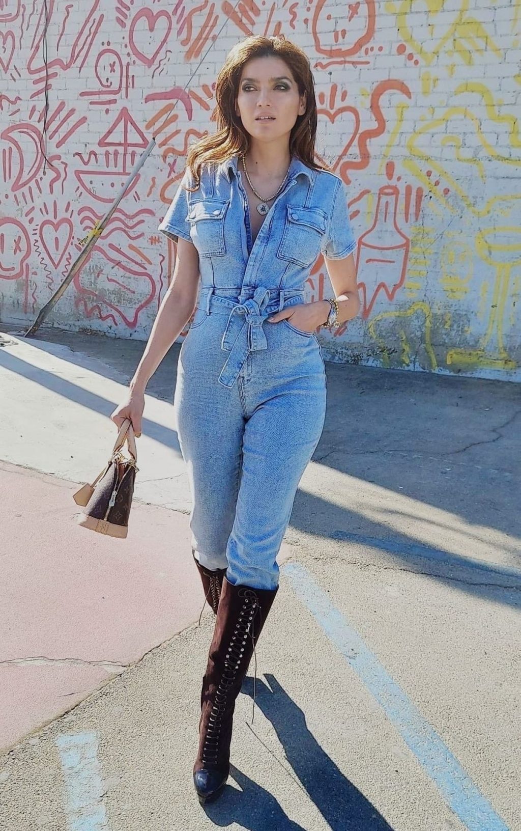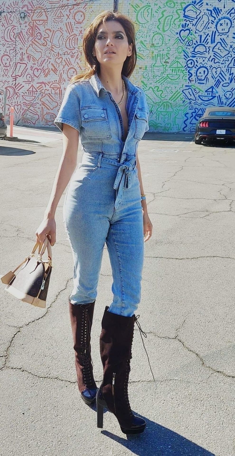 Actriz Blanca Blanco lleva un mono vaquero para una sesión de fotos en la calle en Los Ángeles, 11/09/2020.