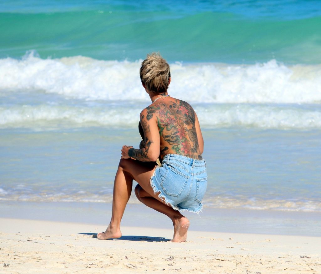 La escritora polaca Blanka Lipinska vista sin camiseta mientras disfruta de la playa en Tulum, México, 28/02/2021.