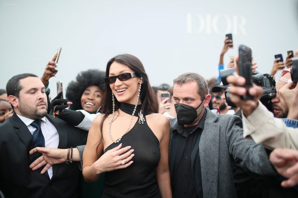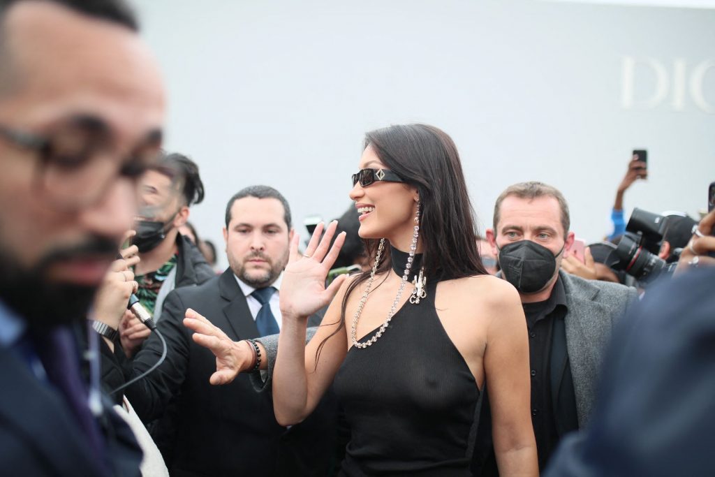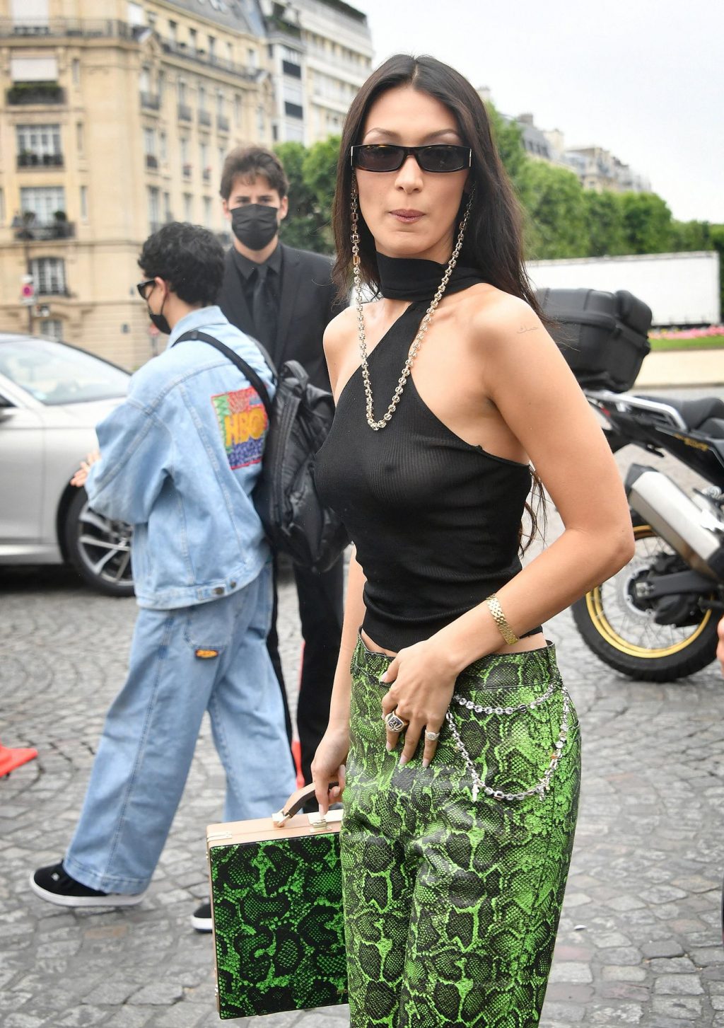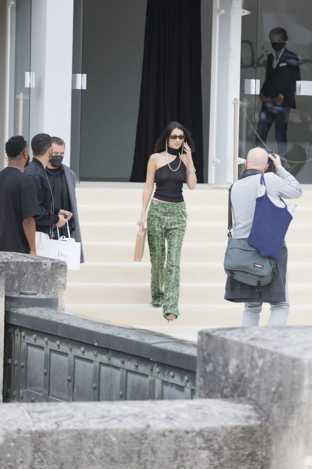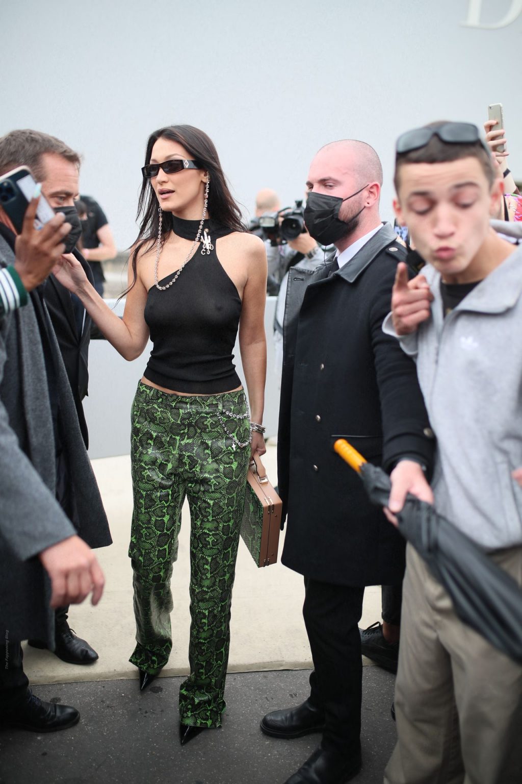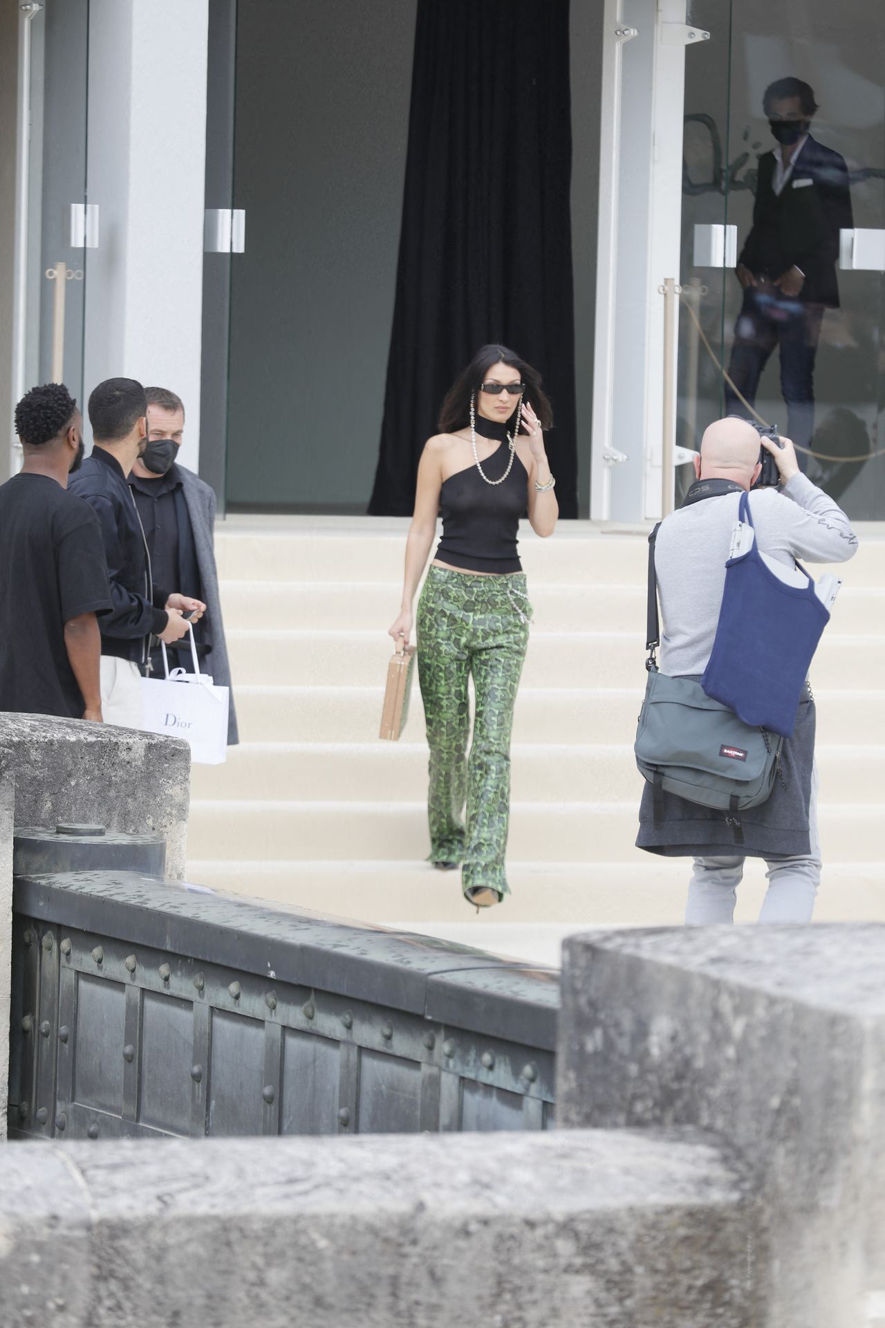 Bella Hadid sin sujetador llega al desfile de moda masculina prêt-à-porter Primavera 2022 Dior x Travis Scott en París, Francia, 25/06/2021.