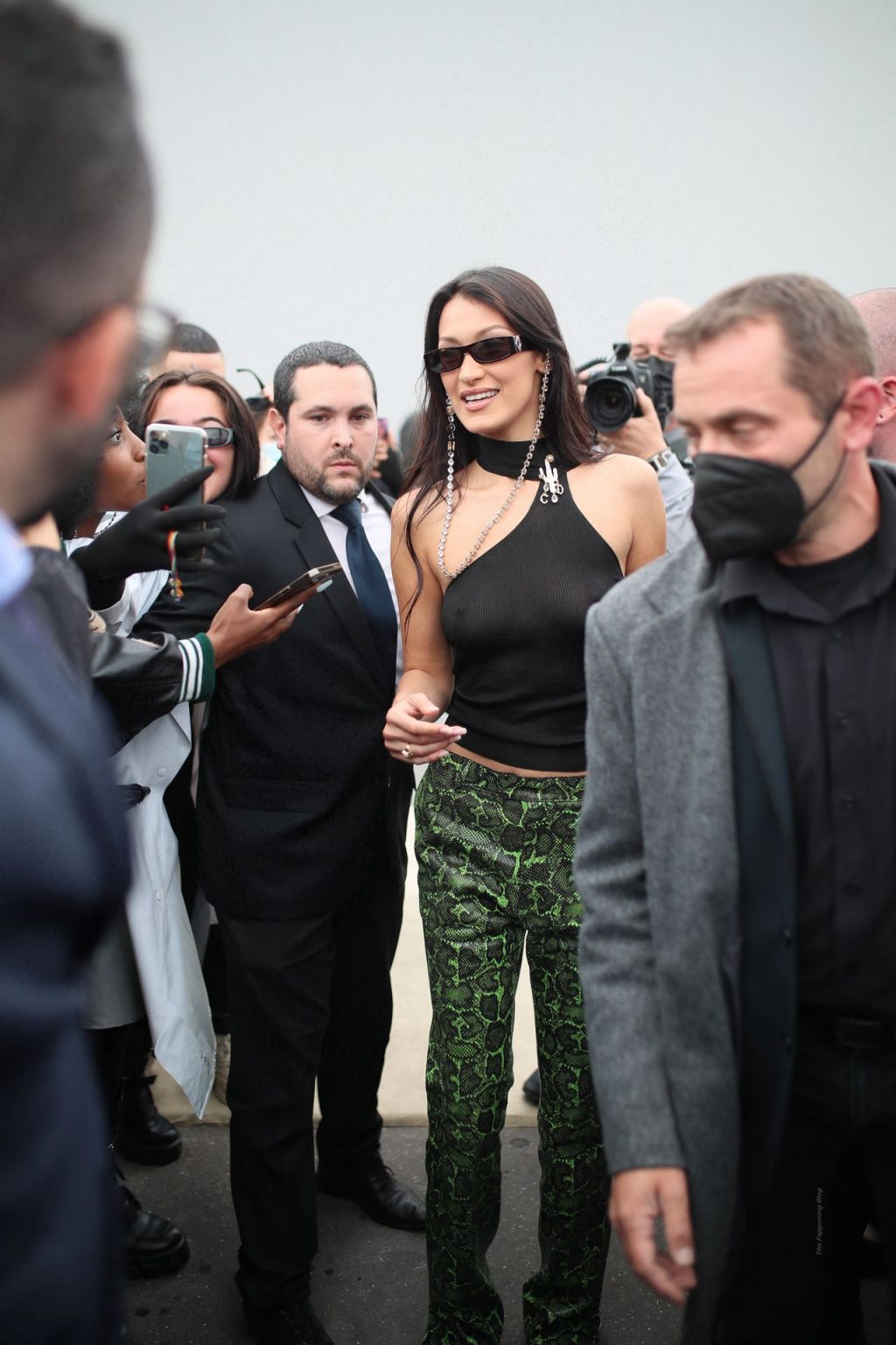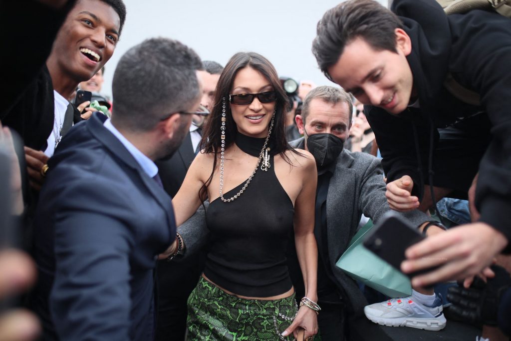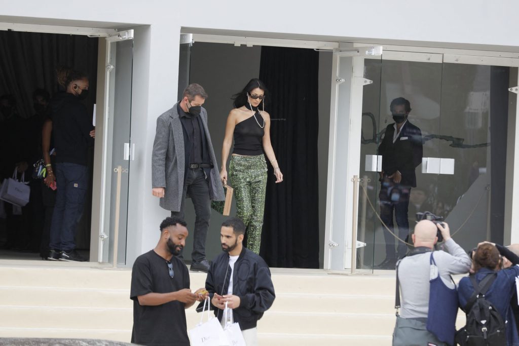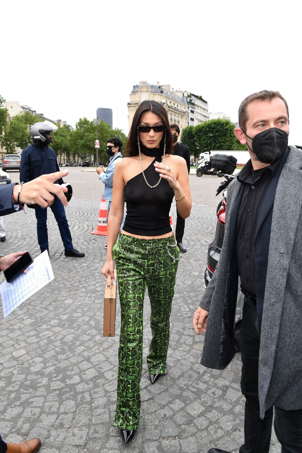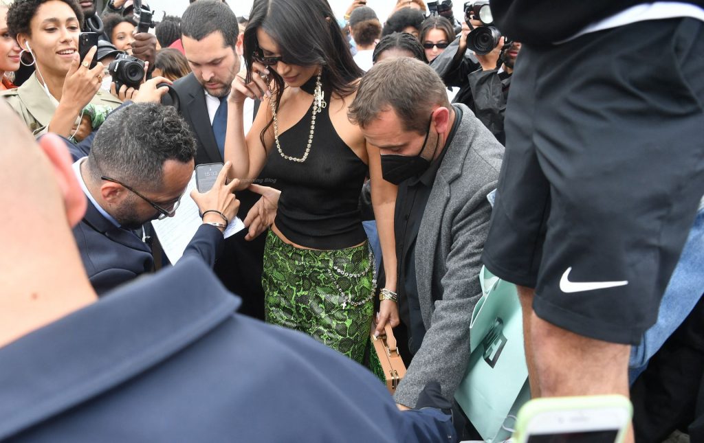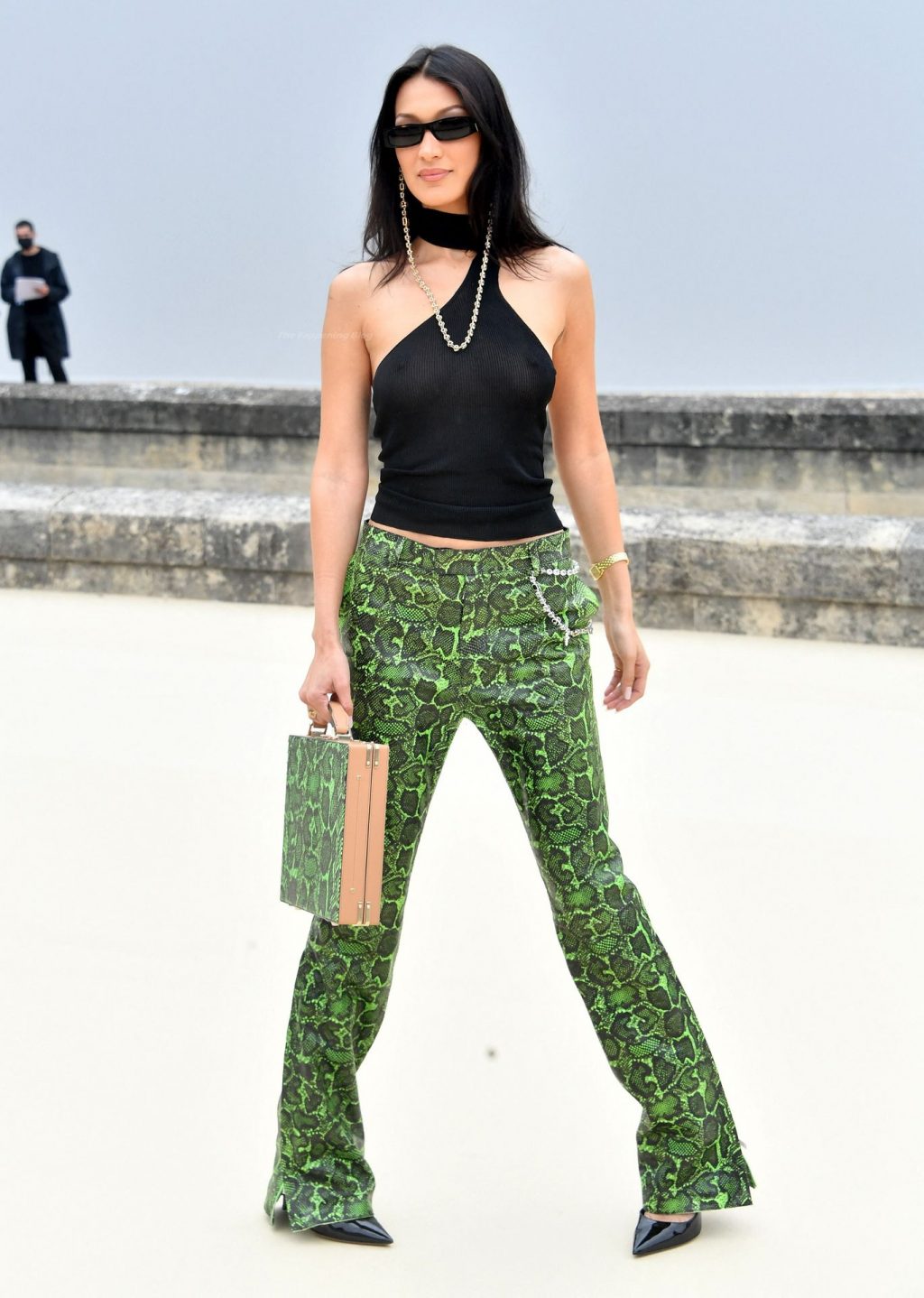 Bella Hadid sin sujetador llega al desfile de moda masculina prêt-à-porter Primavera 2022 Dior x Travis Scott en París, Francia, 25/06/2021.