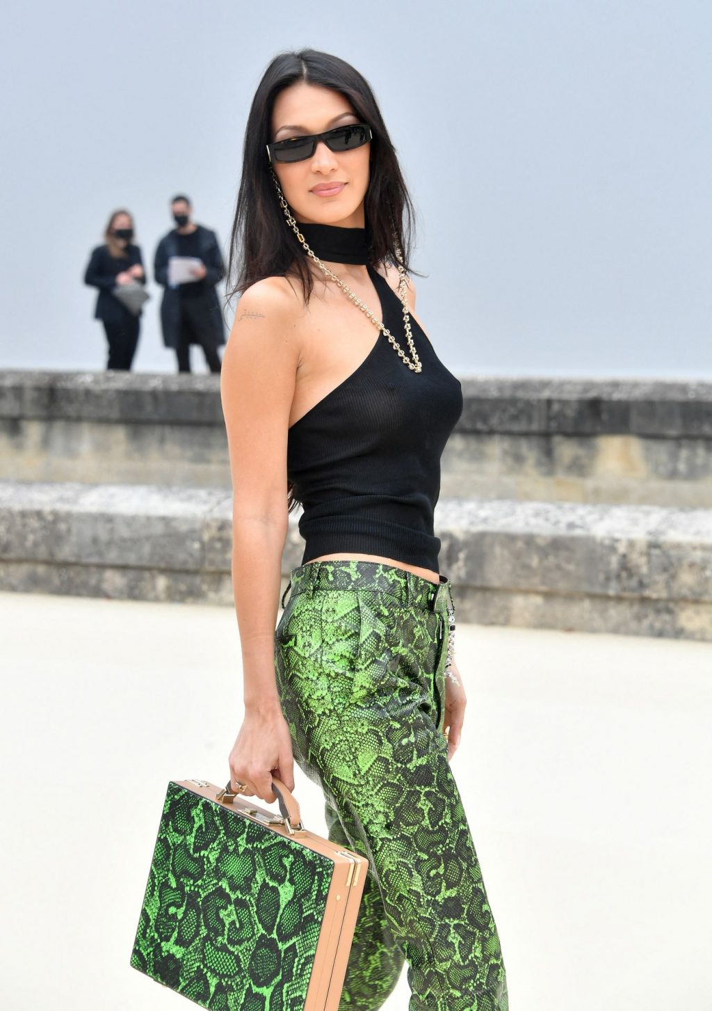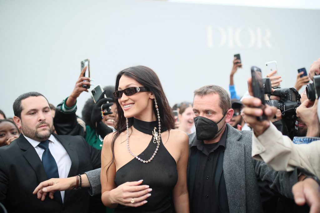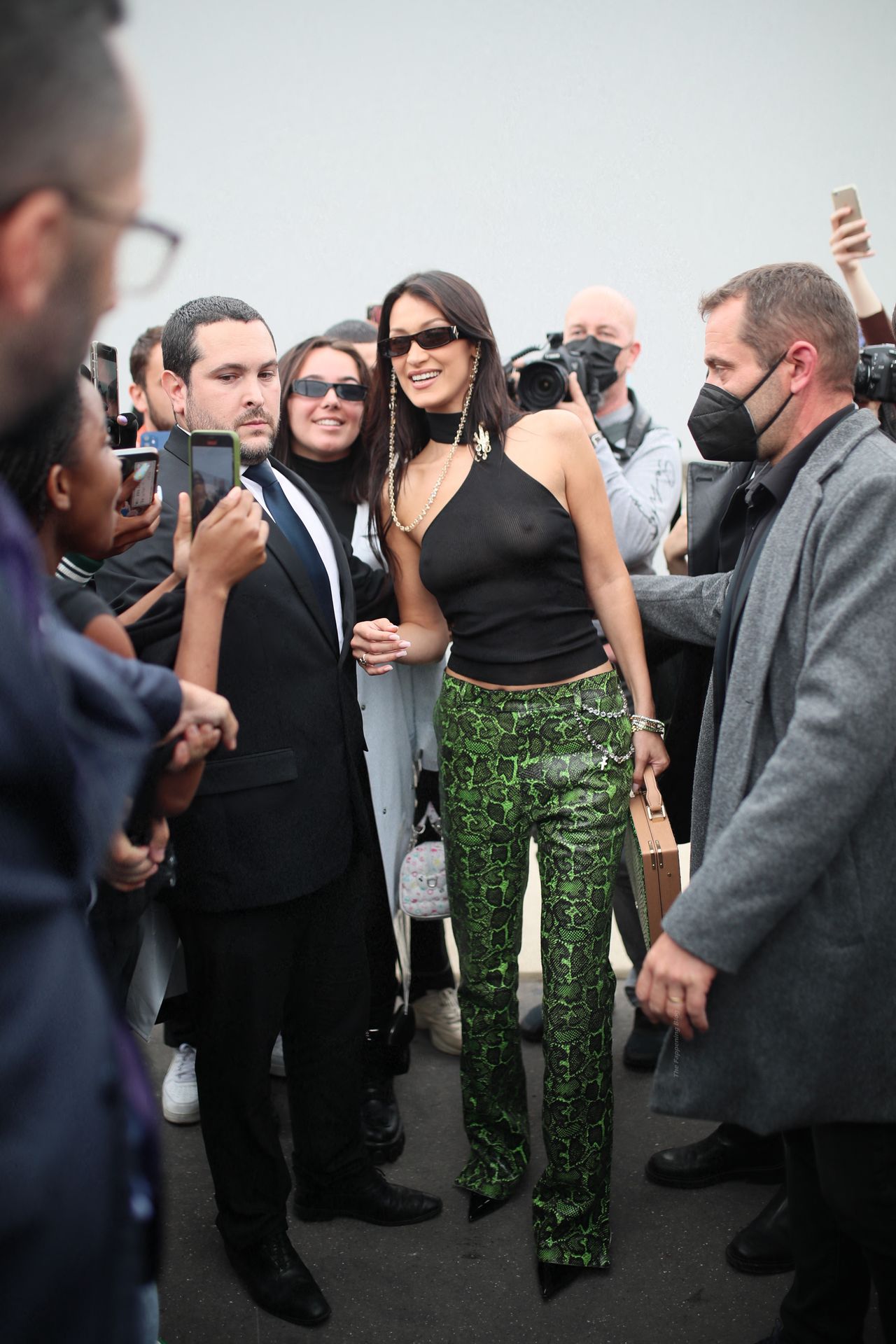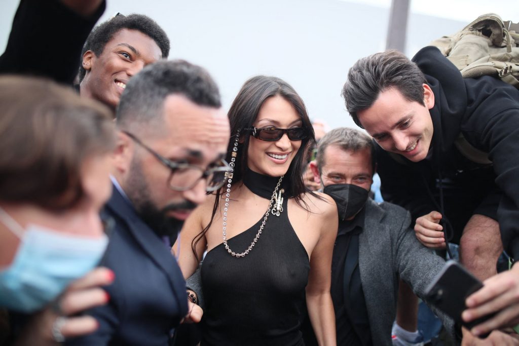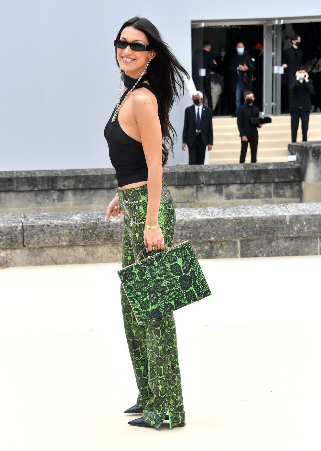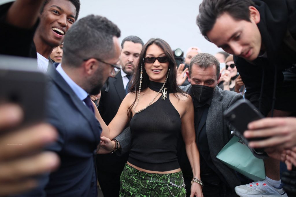 Bella Hadid sin sujetador llega al desfile de moda masculina prêt-à-porter Primavera 2022 Dior x Travis Scott en París, Francia, 25/06/2021.
