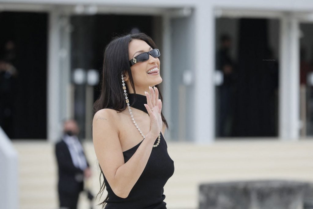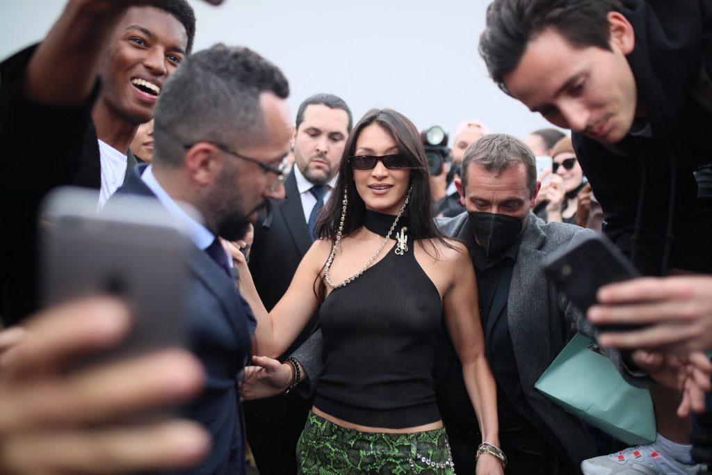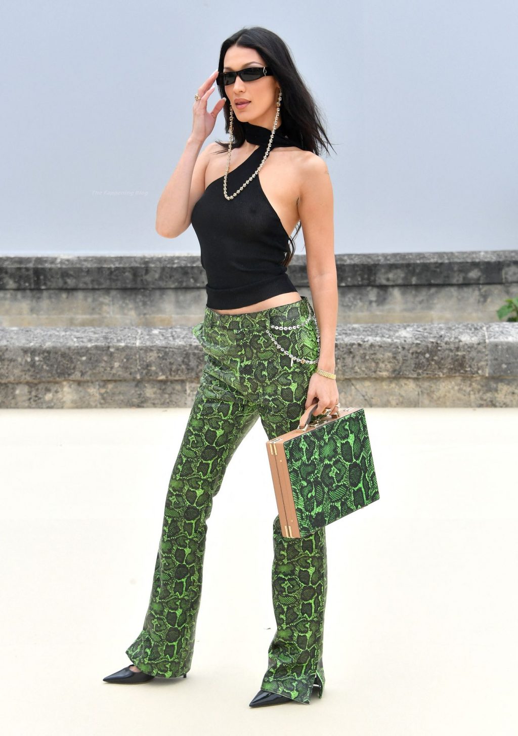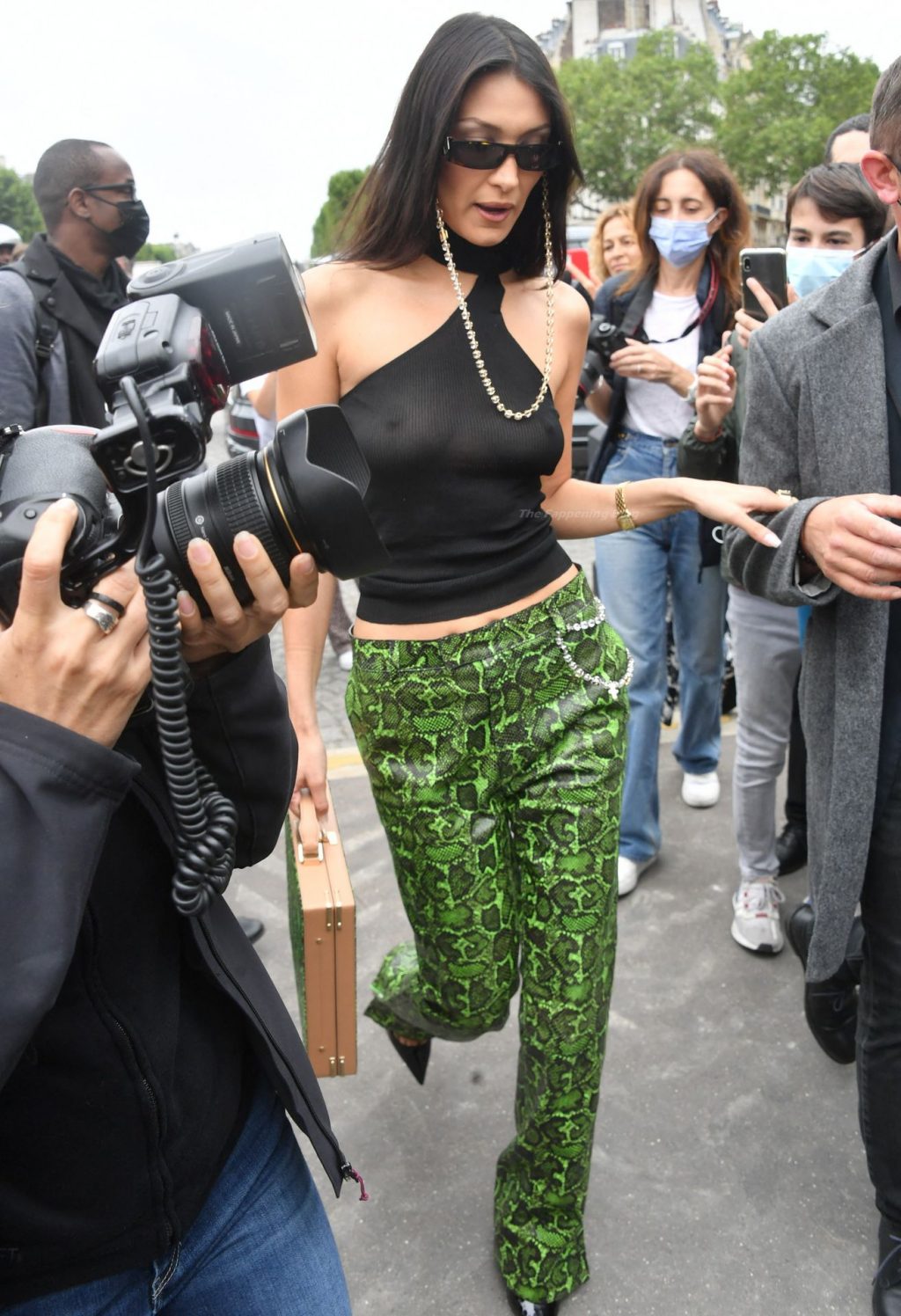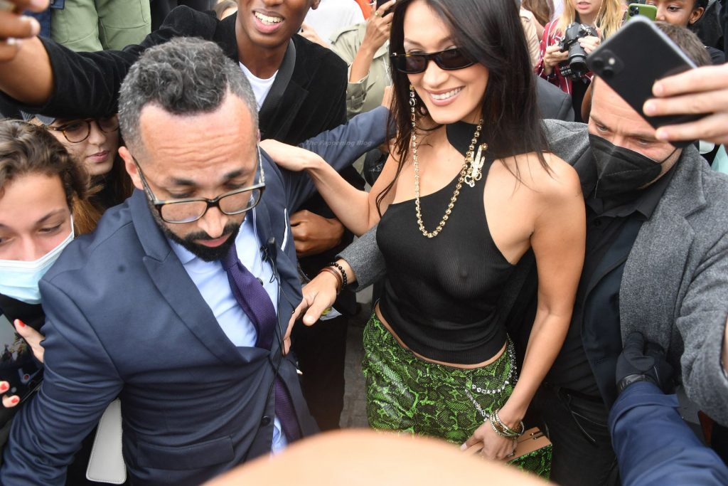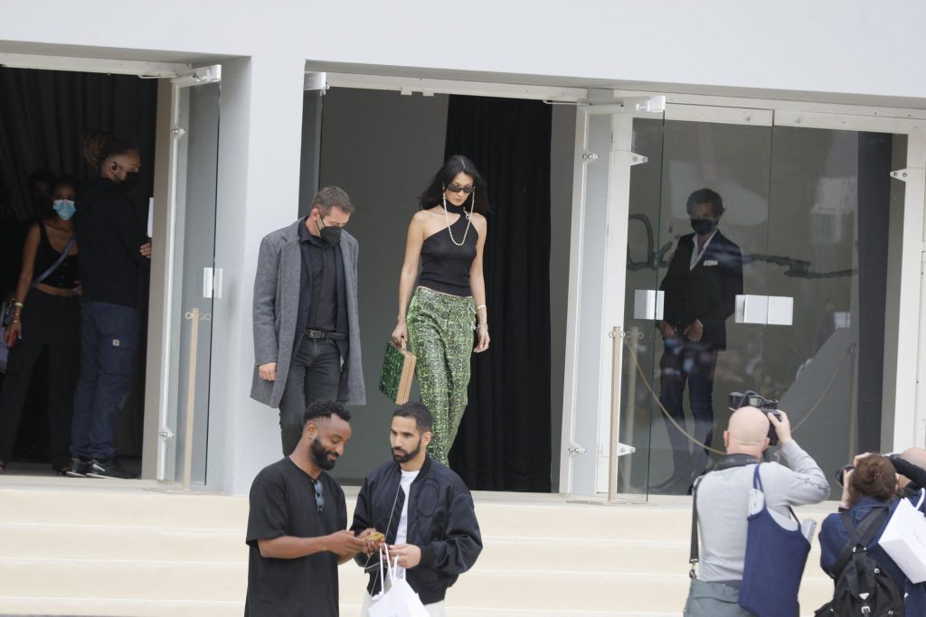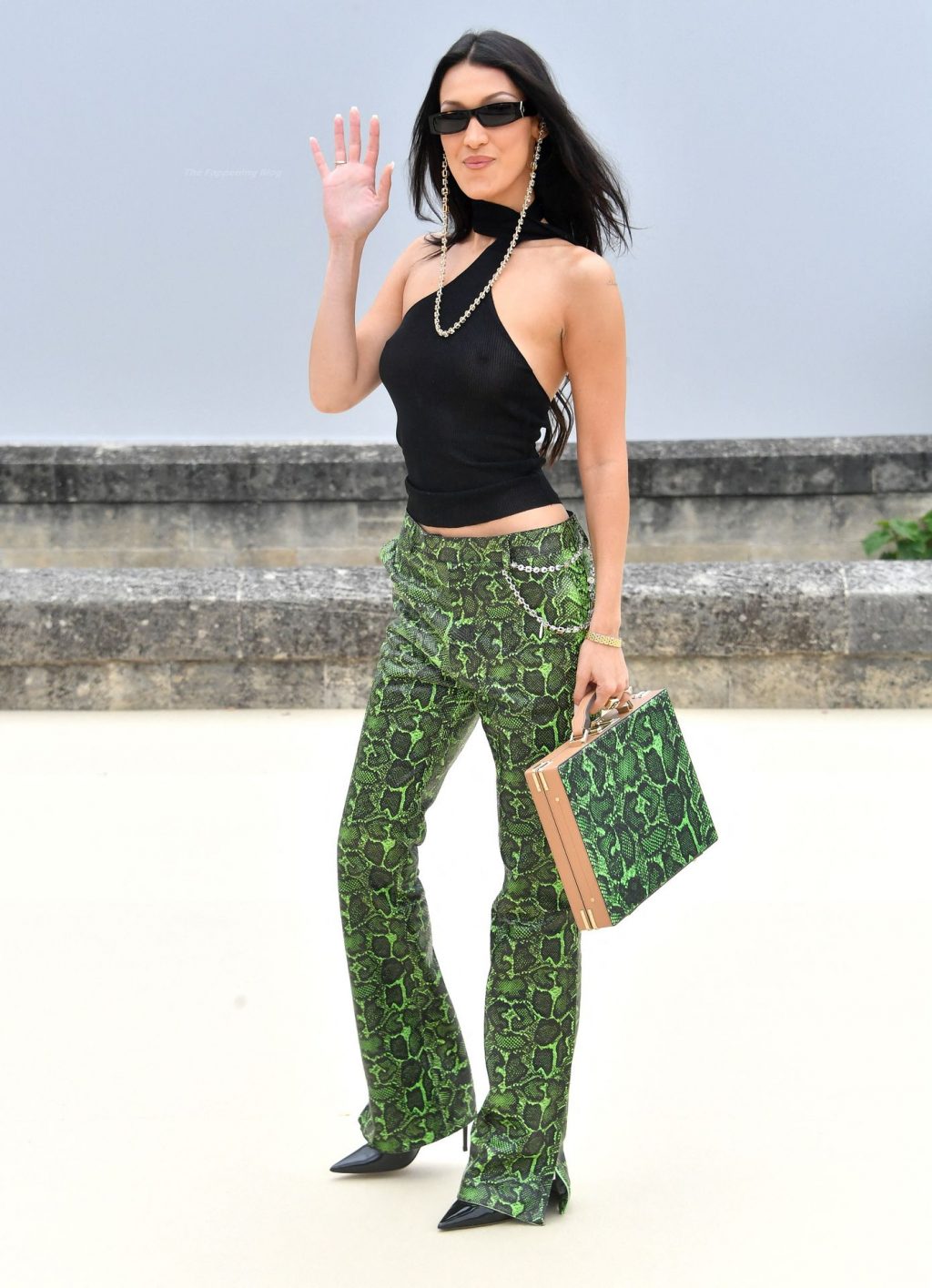 Bella Hadid sin sujetador llega al desfile de moda masculina prêt-à-porter Primavera 2022 Dior x Travis Scott en París, Francia, 25/06/2021.