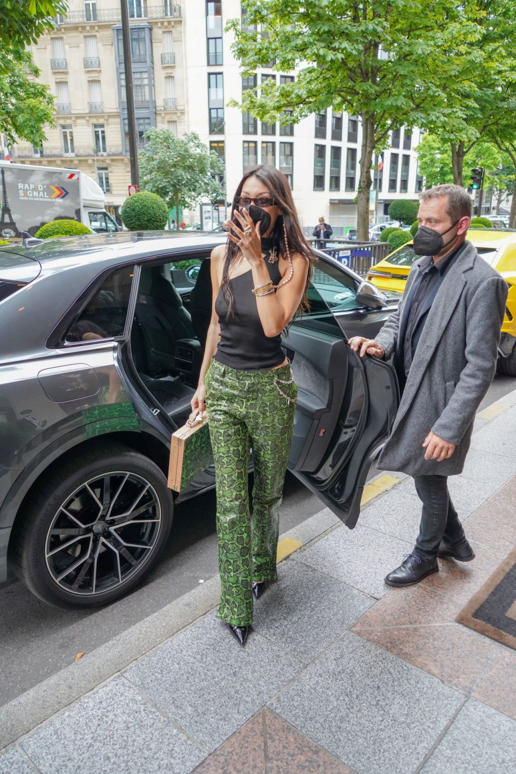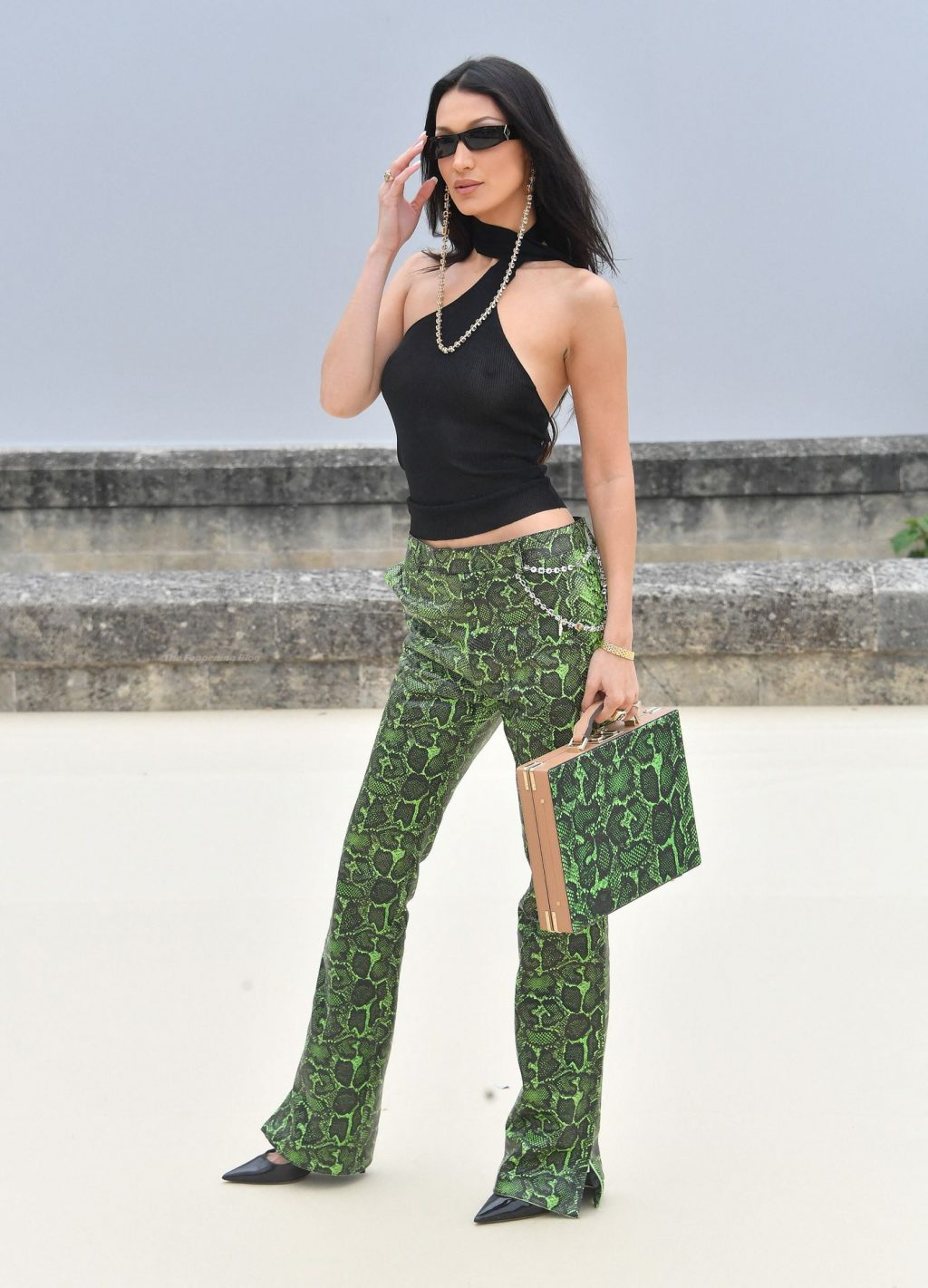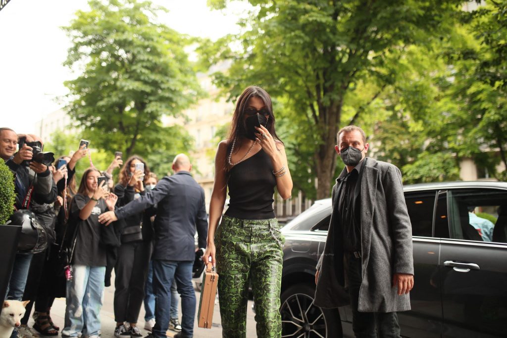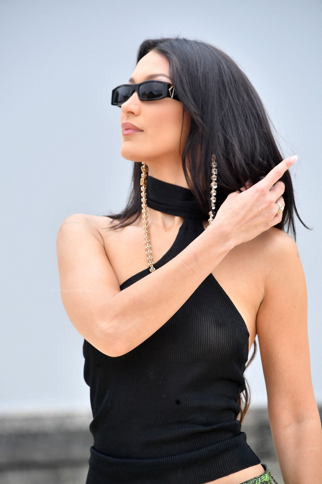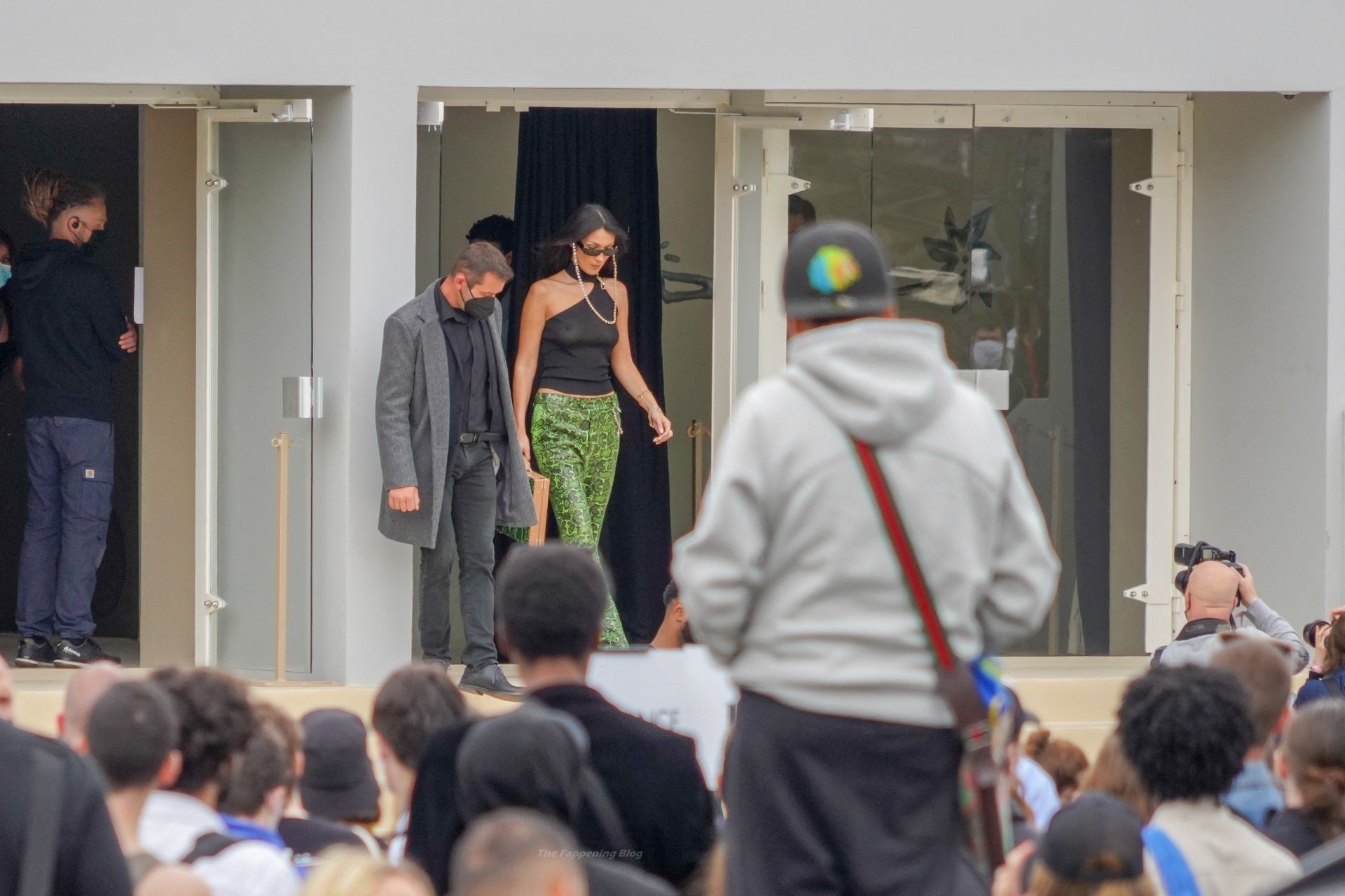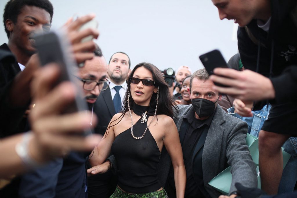 Bella Hadid sin sujetador llega al desfile de moda masculina prêt-à-porter Primavera 2022 Dior x Travis Scott en París, Francia, 25/06/2021.