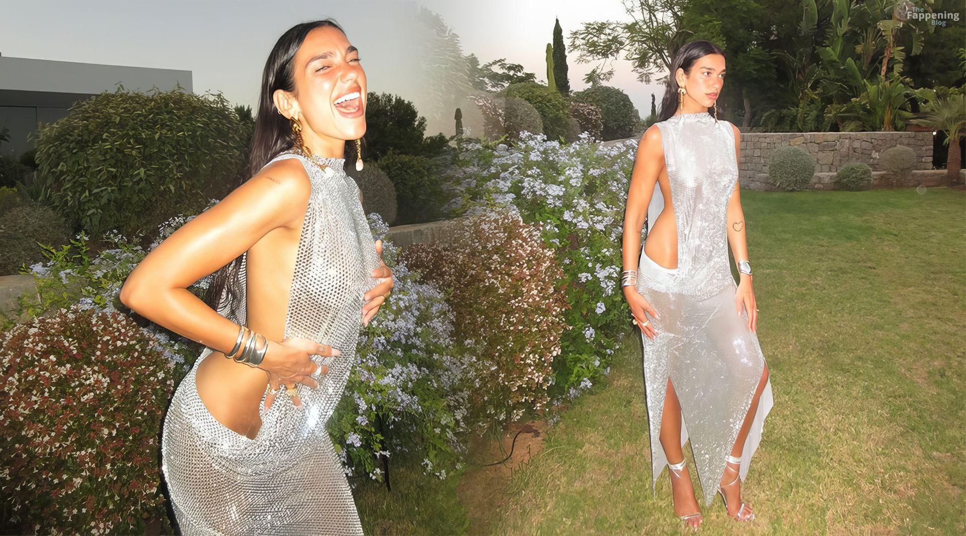 Dua Lipa posa sin sujetador con un vestido plateado transparente, mostrando su figura esbelta y un poco de costado.