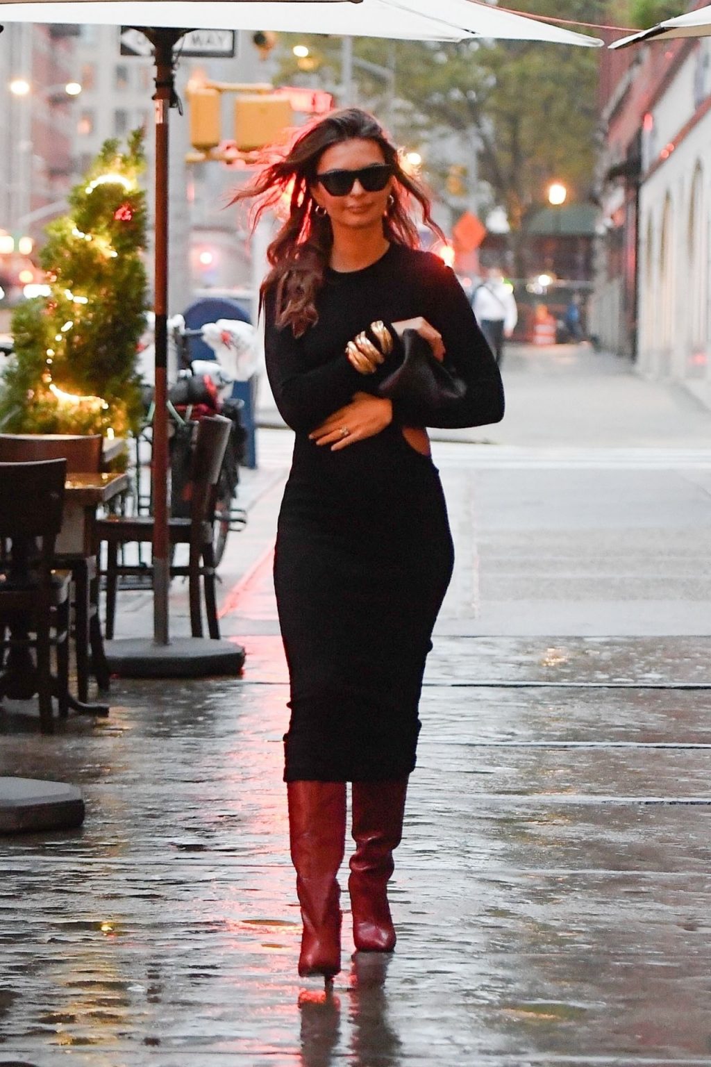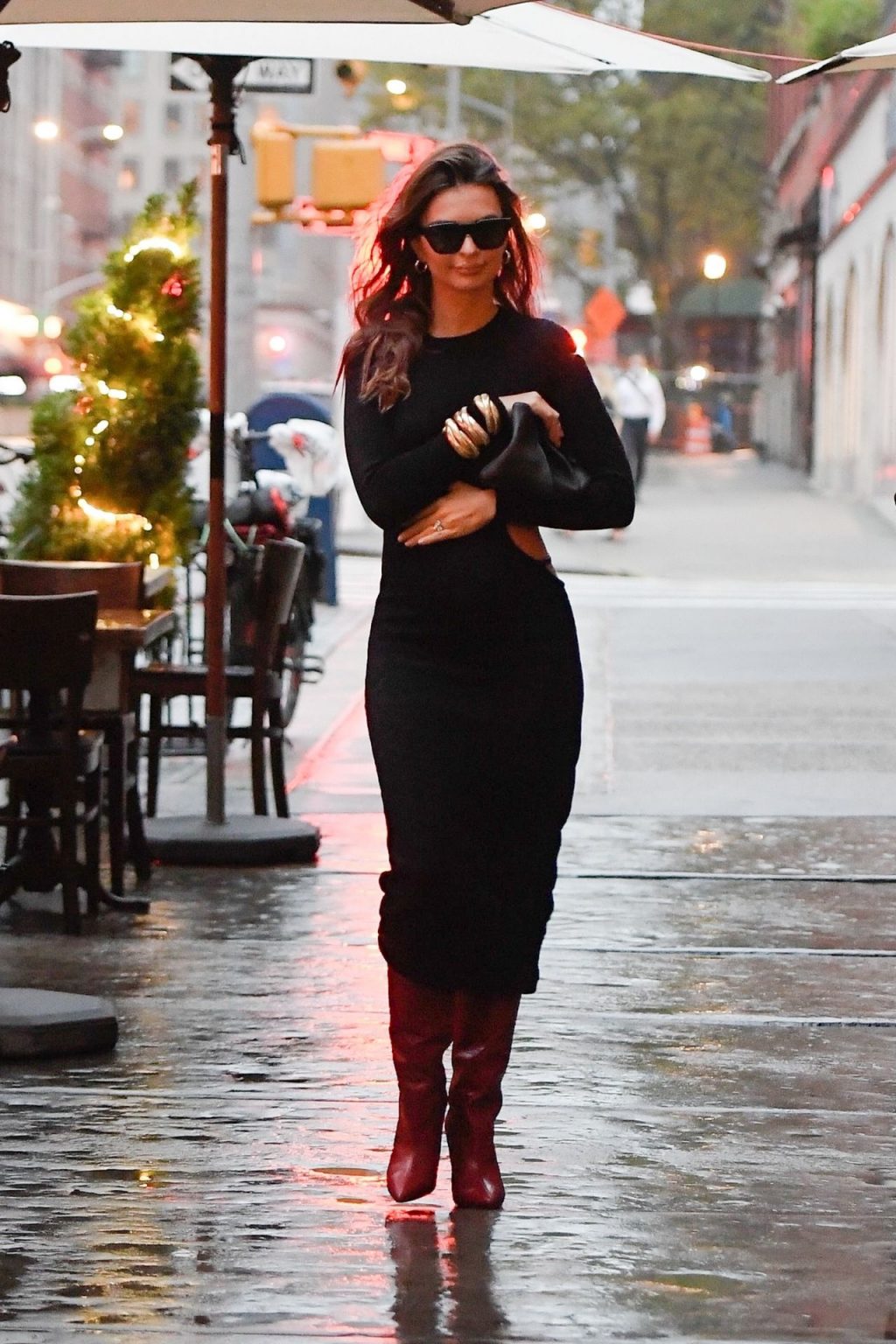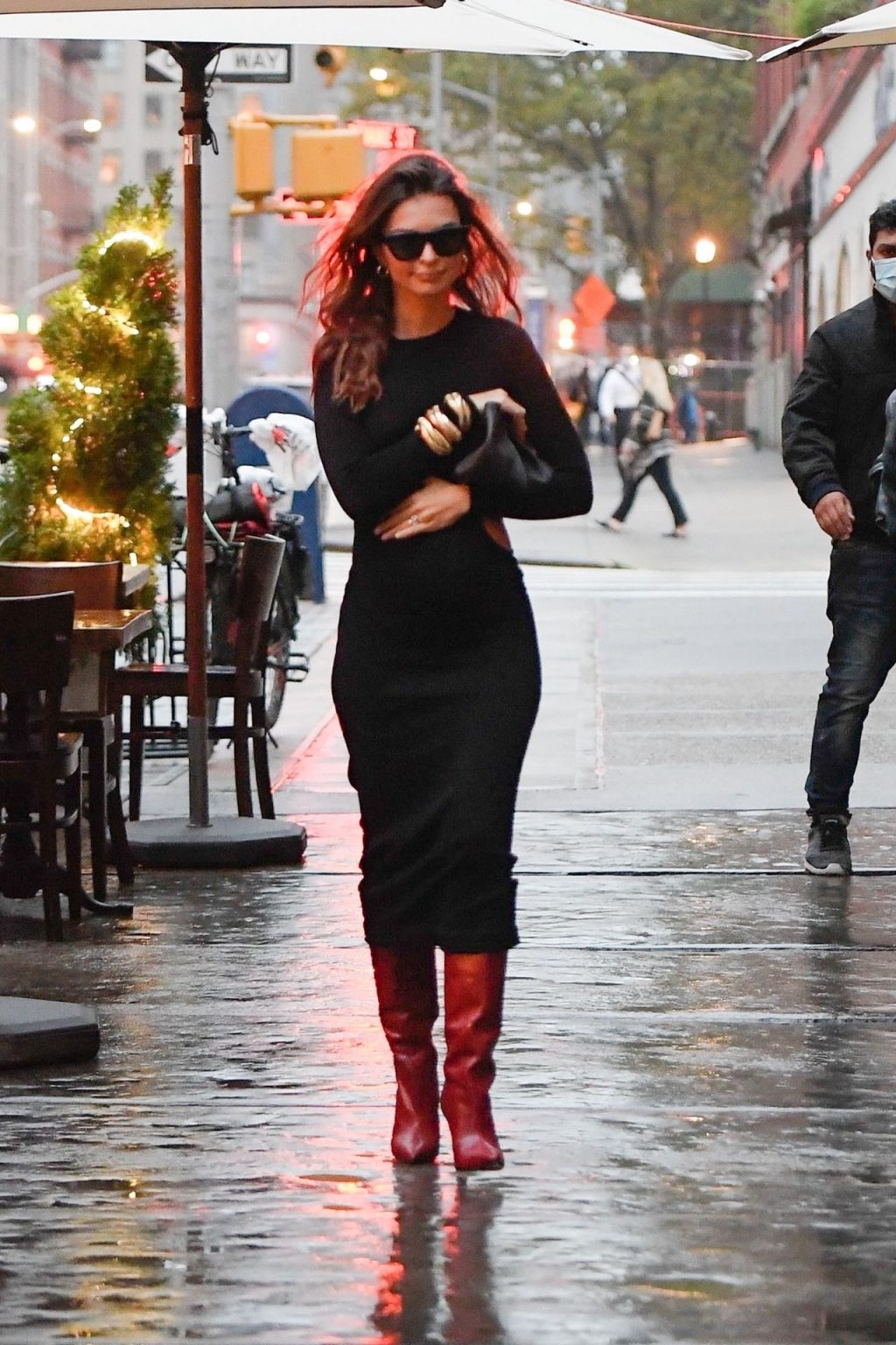 Emily Ratajkowski embarazada se ve feliz sosteniendo su barriga de embarazada con un vestido transparente mientras llega a su apartamento en un día lluvioso en Nueva York, después de anunciar su embarazo, 26/10/2020.
