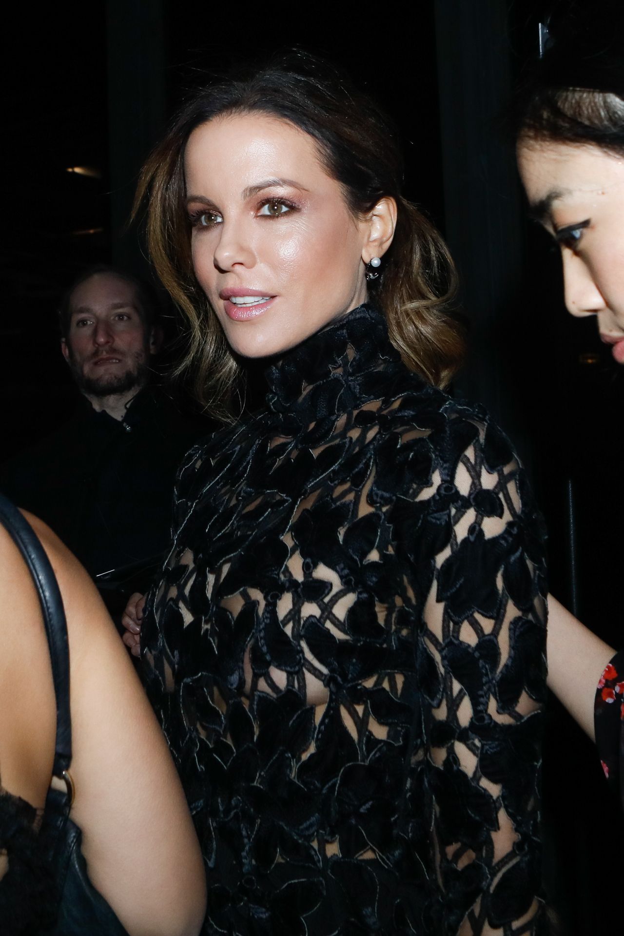 La hermosa actriz Kate Beckinsale fue fotografiada con un vestido negro transparente en el desfile de Alta Costura Primavera/Verano 2019 de Giambattista Valli como parte de la Semana de la Moda de París en París, 21/01/2019.