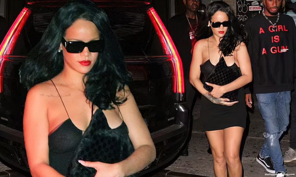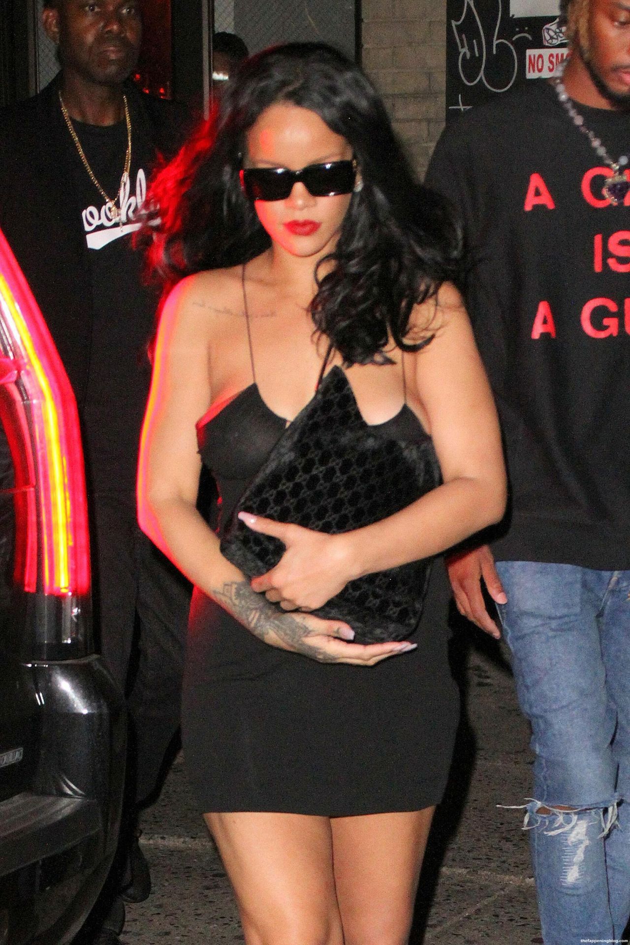 La cantante Rihanna hace un muy buen trabajo ocultando su estómago con su bolso negro de Gucci mientras festeja toda la noche con amigos en NYC, 05/08/2021.