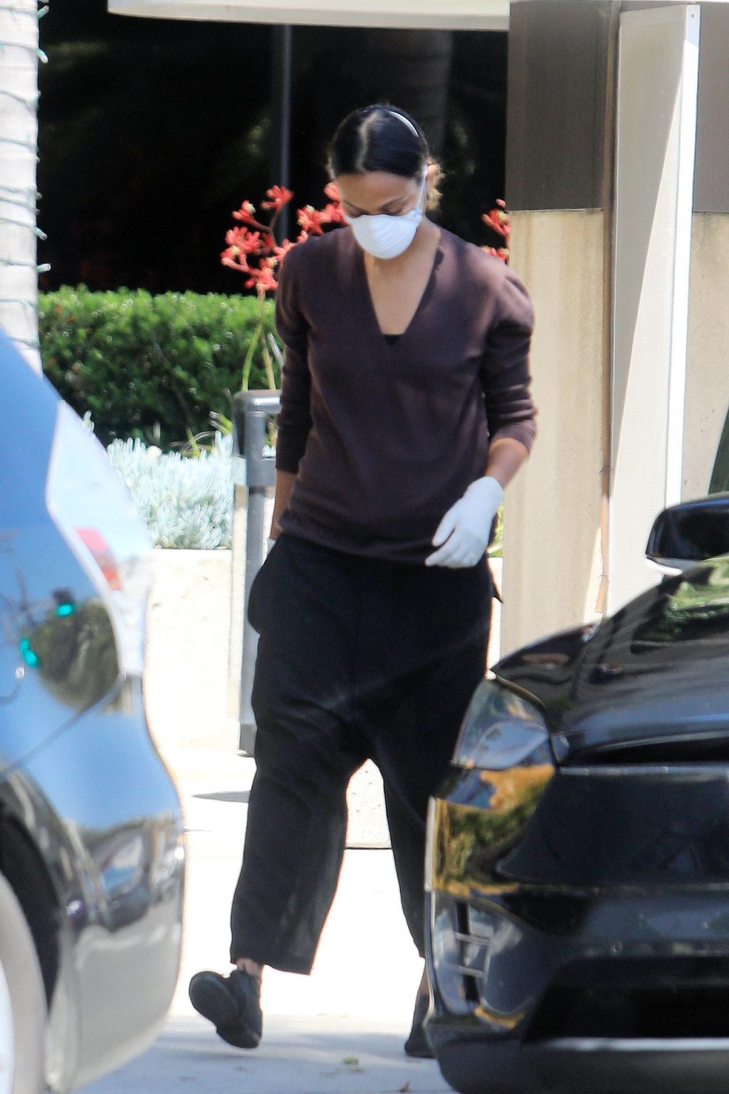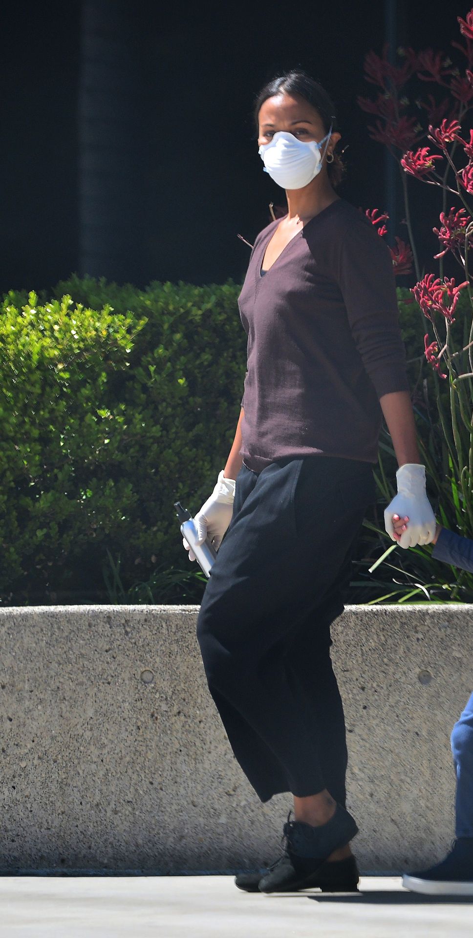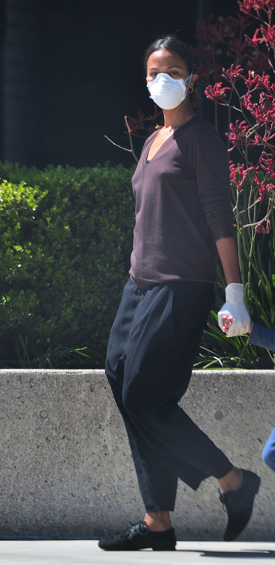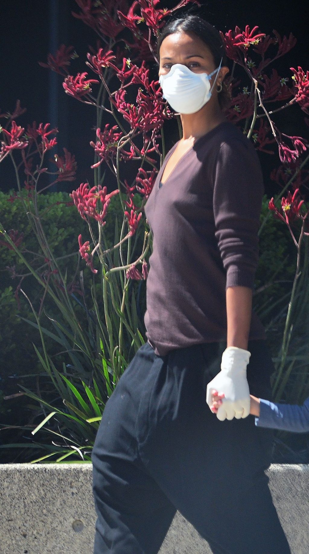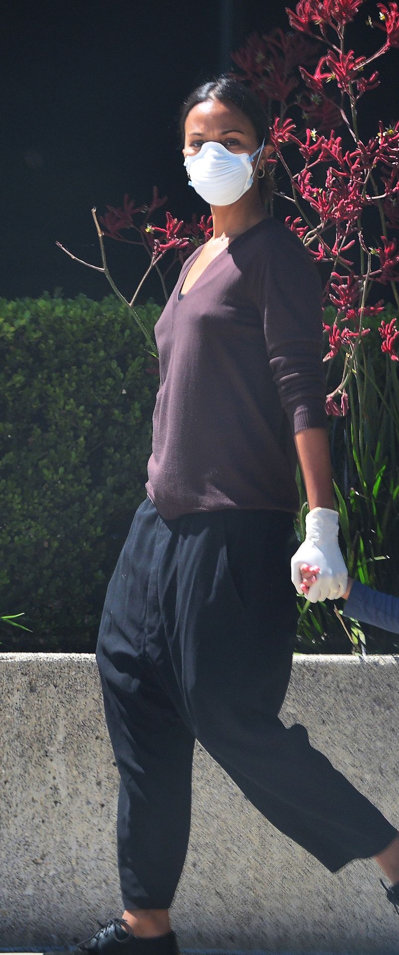 Zoe Saldana y Marco Perego salen en Los Ángeles, 13/05/2020. La actriz de “Avatar” de 41 años llevaba una mascarilla, un suéter burdeos, pantalones holgados y zapatos negros.