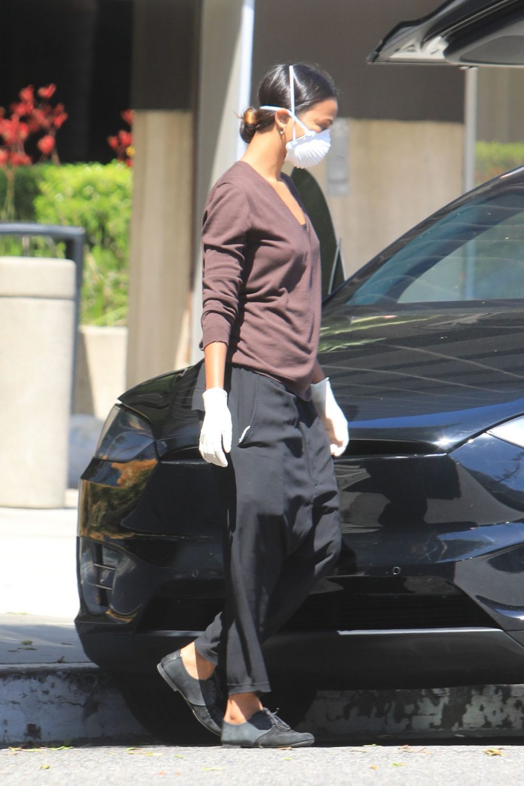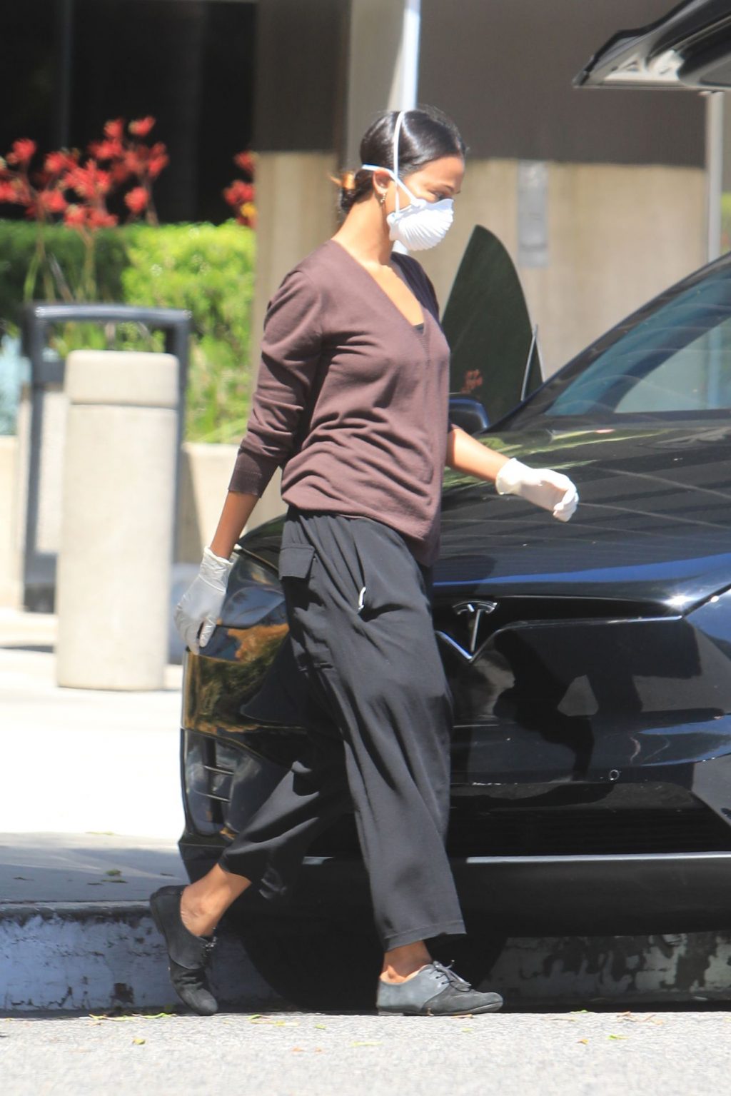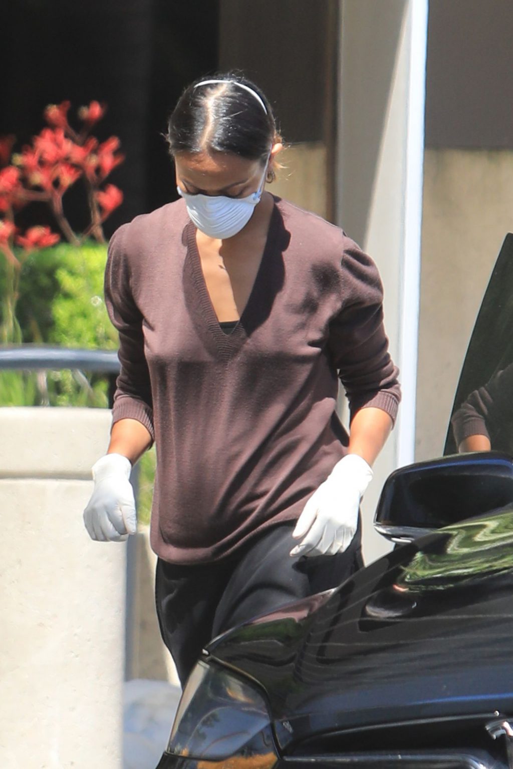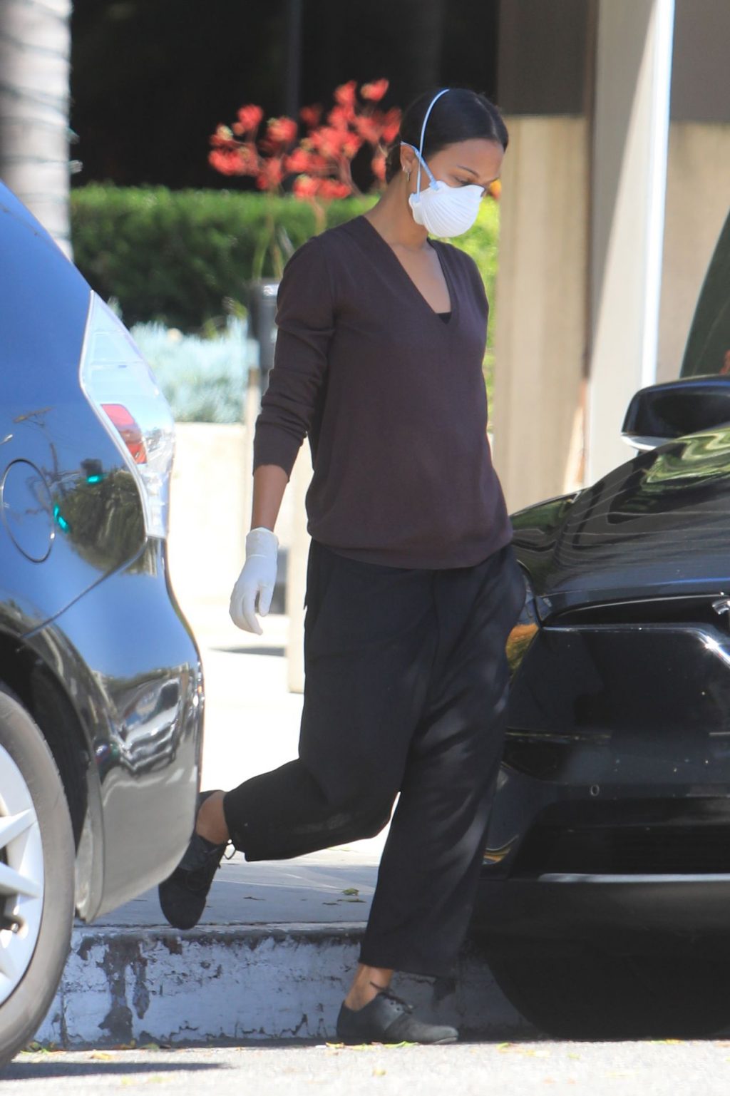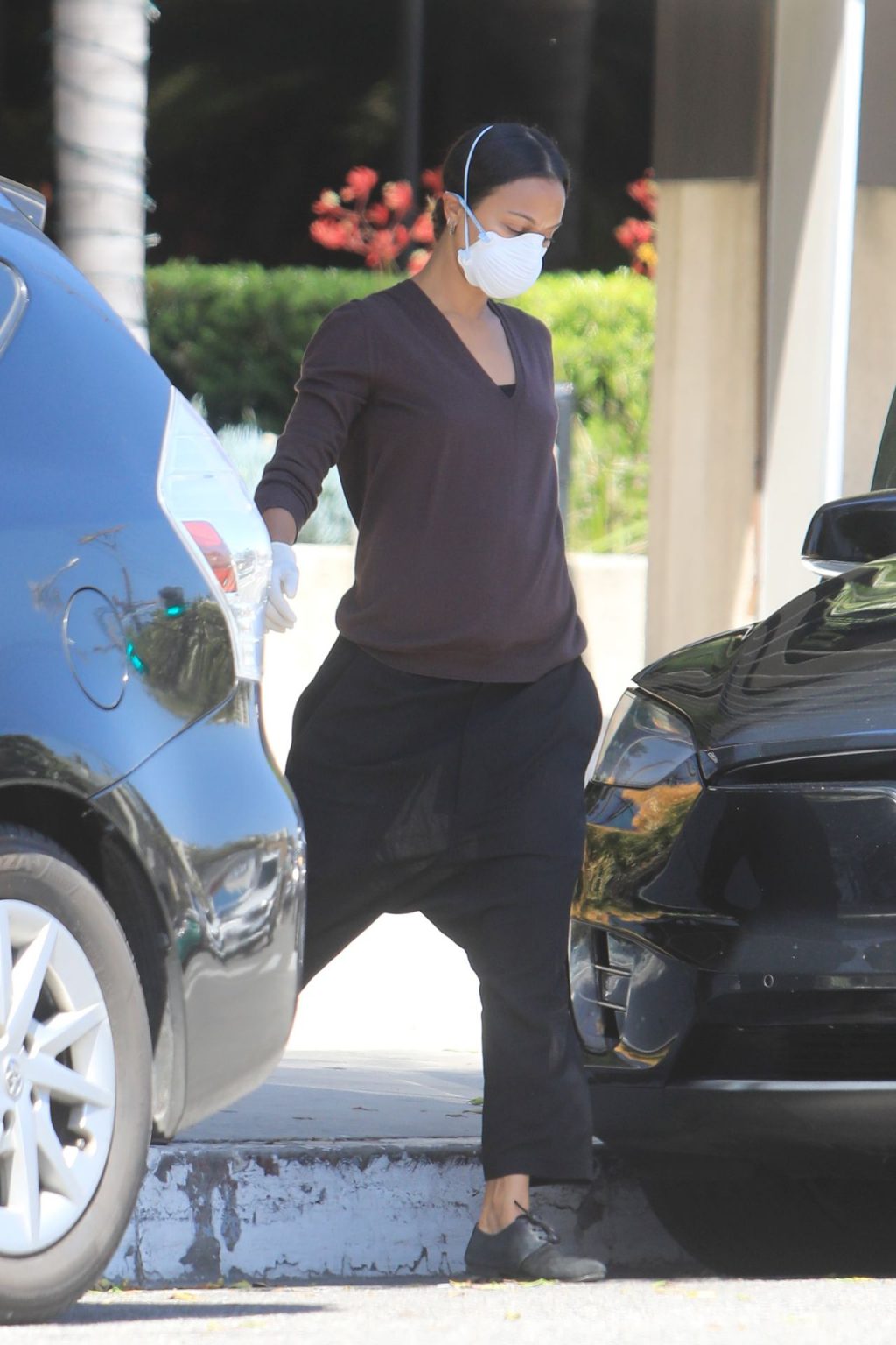Zoe Saldana y Marco Perego salen en Los Ángeles, 13/05/2020. La actriz de “Avatar” de 41 años llevaba una mascarilla, un suéter burdeos, pantalones holgados y zapatos negros.