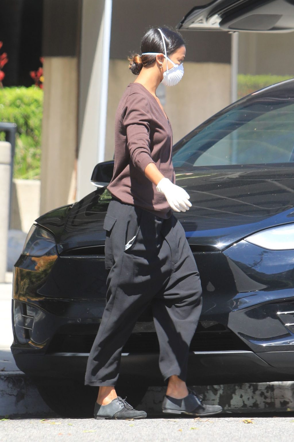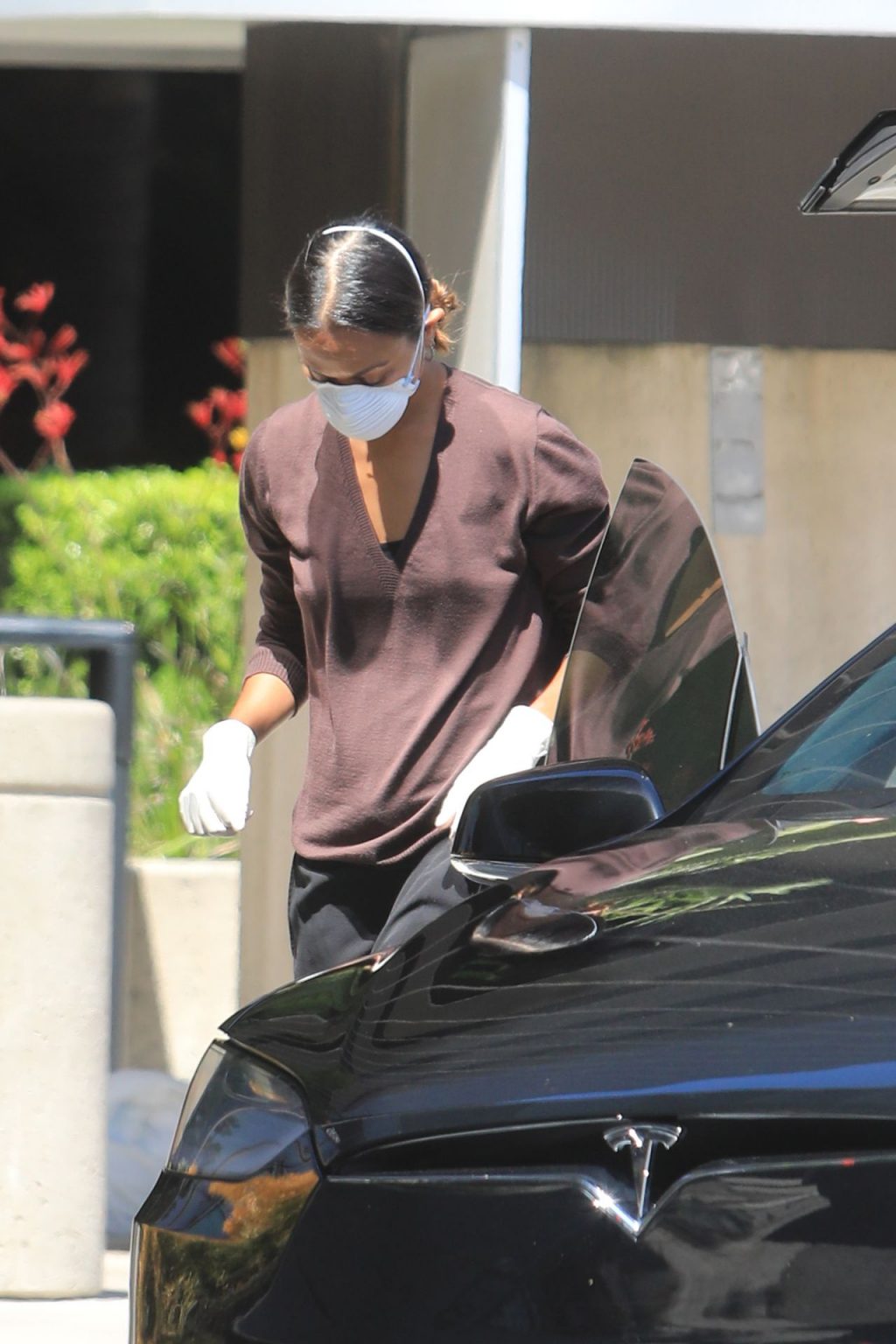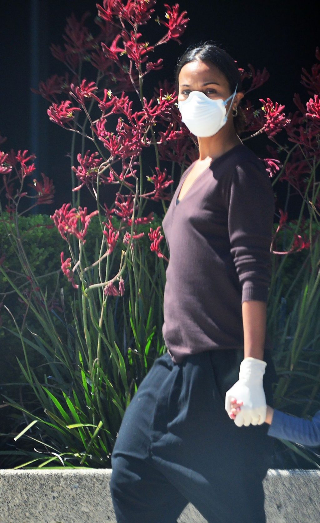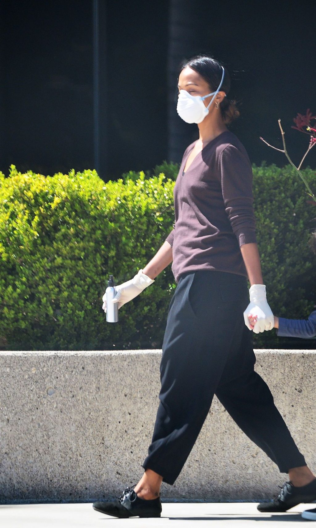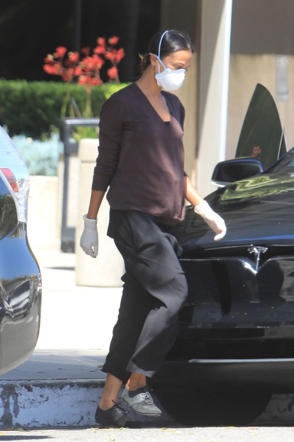 Zoe Saldana y Marco Perego salen en Los Ángeles, 13/05/2020. La actriz de “Avatar” de 41 años llevaba una mascarilla, un suéter burdeos, pantalones holgados y zapatos negros.