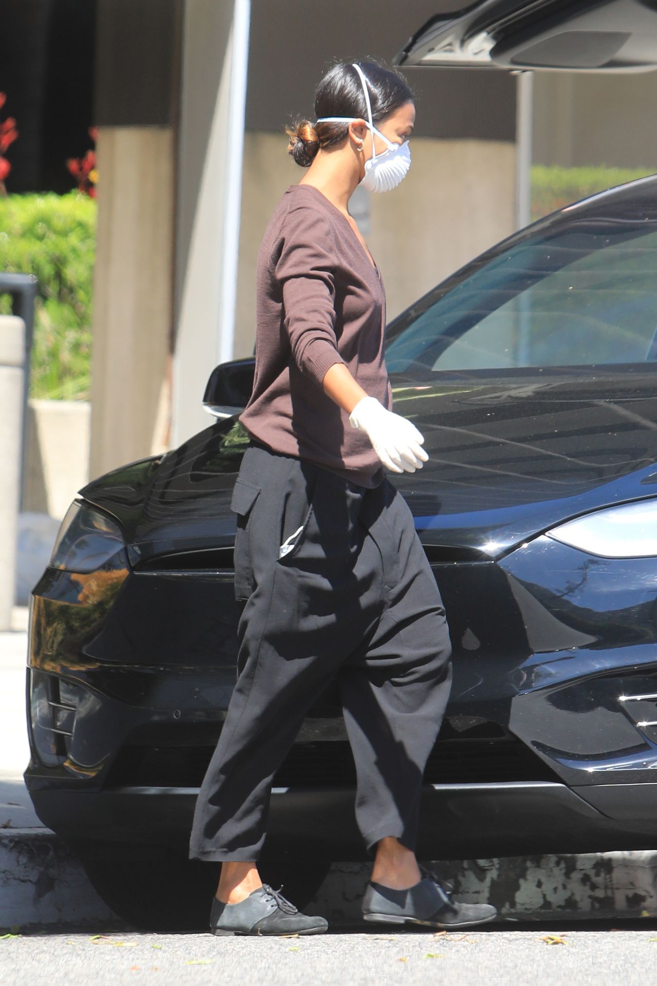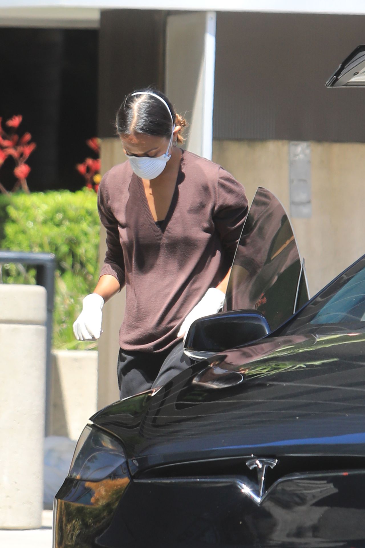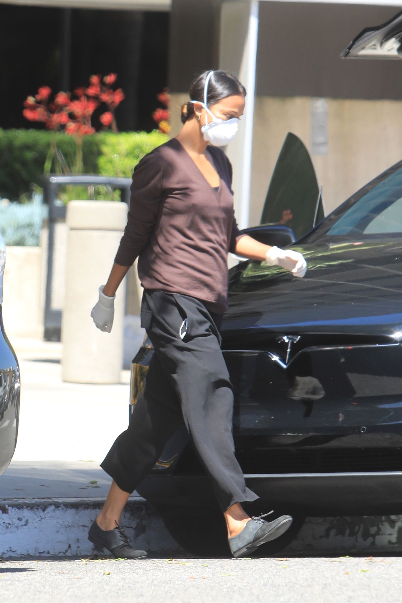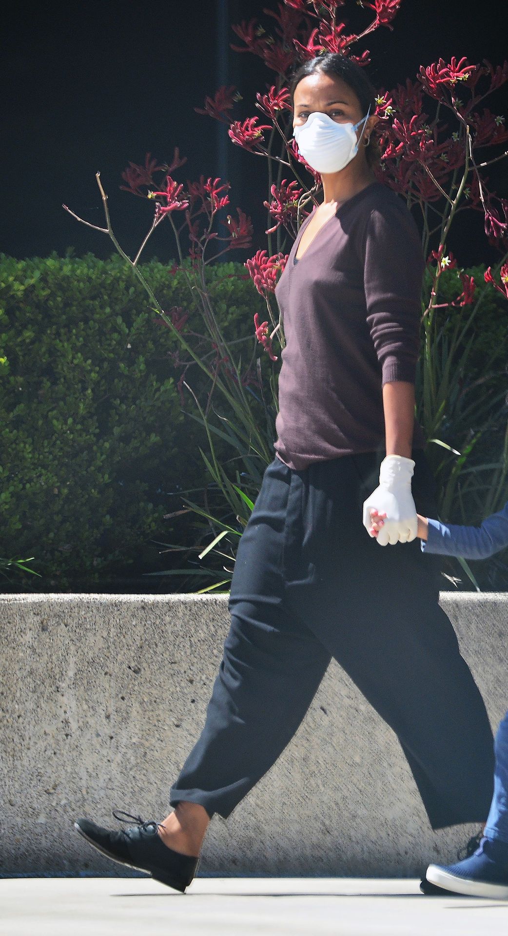 Zoe Saldana y Marco Perego salen en Los Ángeles, 13/05/2020. La actriz de “Avatar” de 41 años llevaba una mascarilla, un suéter burdeos, pantalones holgados y zapatos negros.