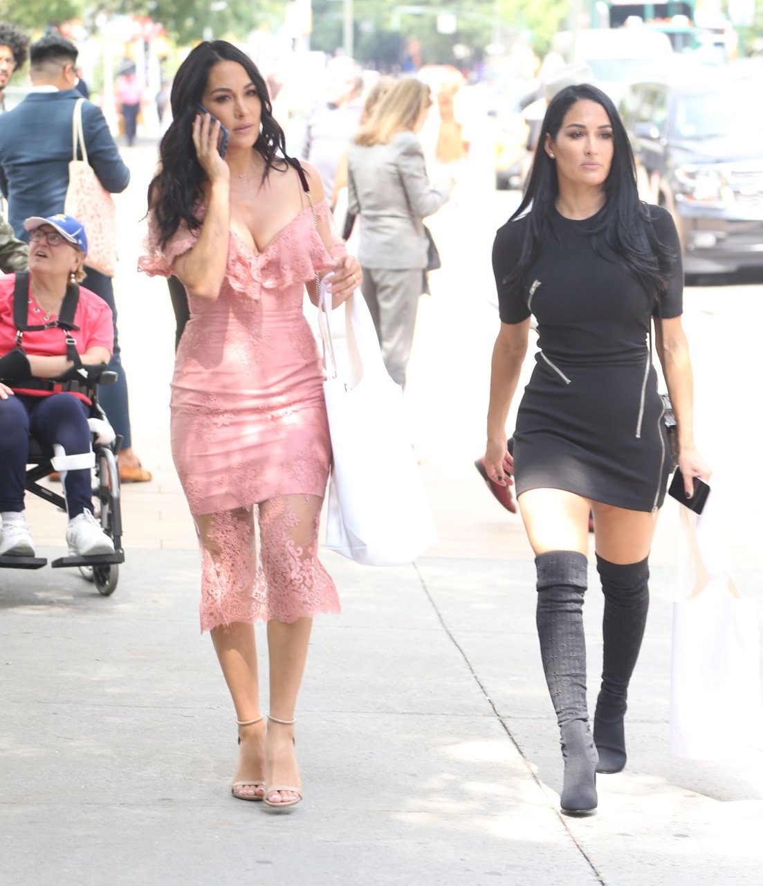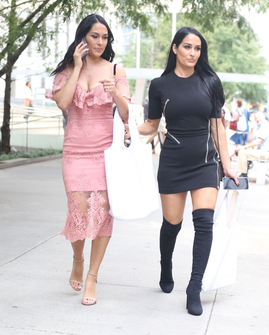 Reality TV Stars Nikki and Brie Bella asisten al desfile de moda FIT en Nueva York, 04/09/2019. Nikki mostró sus curvas, vistiendo un vestido negro, Brie lució sus sexy piernas y escote.
