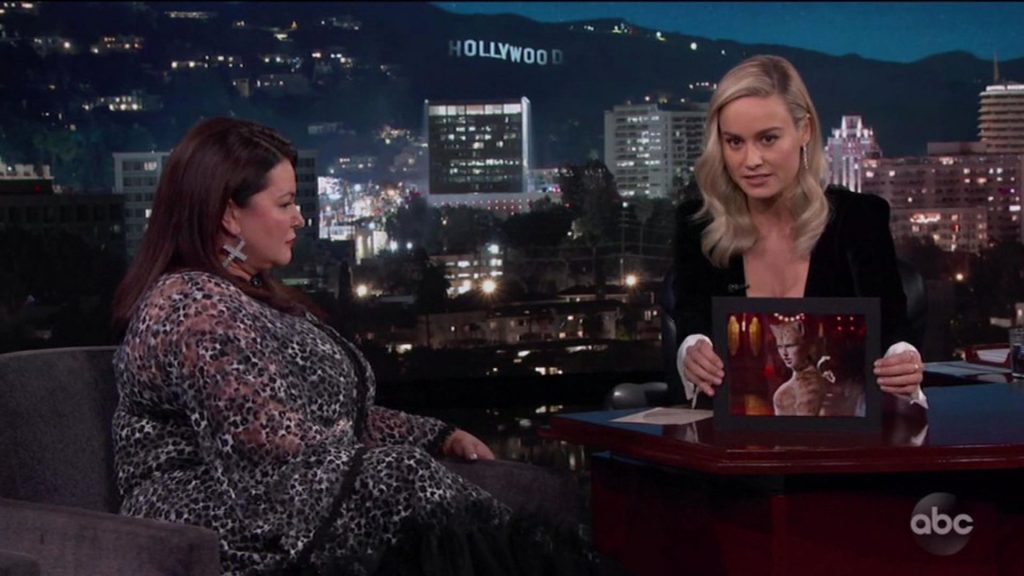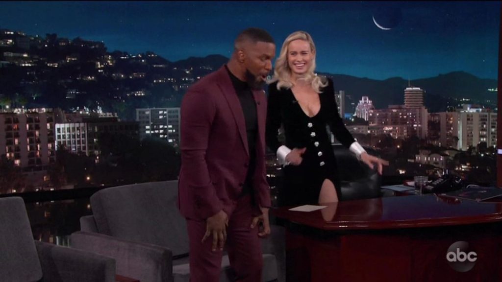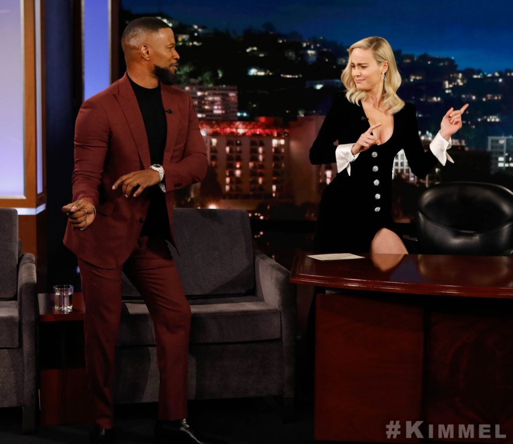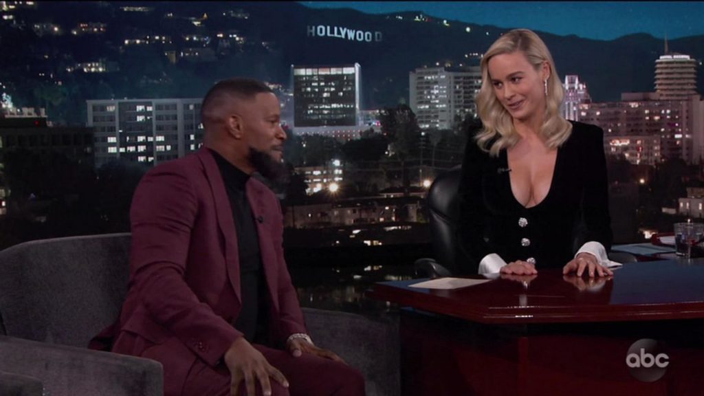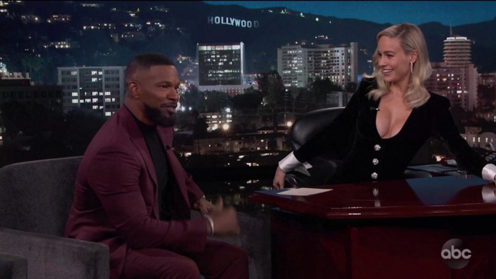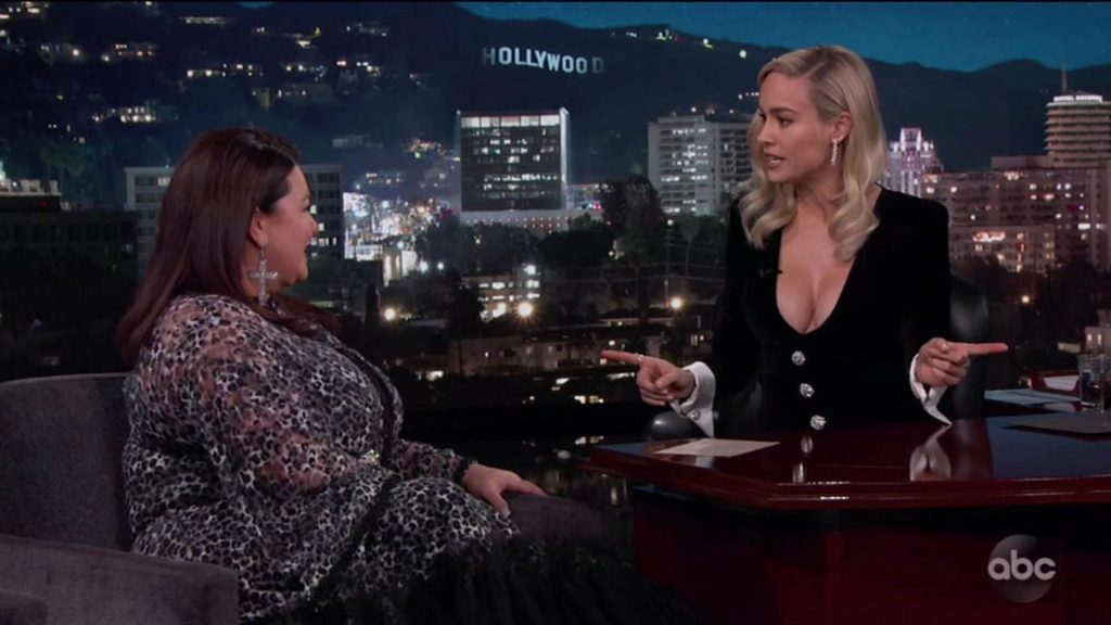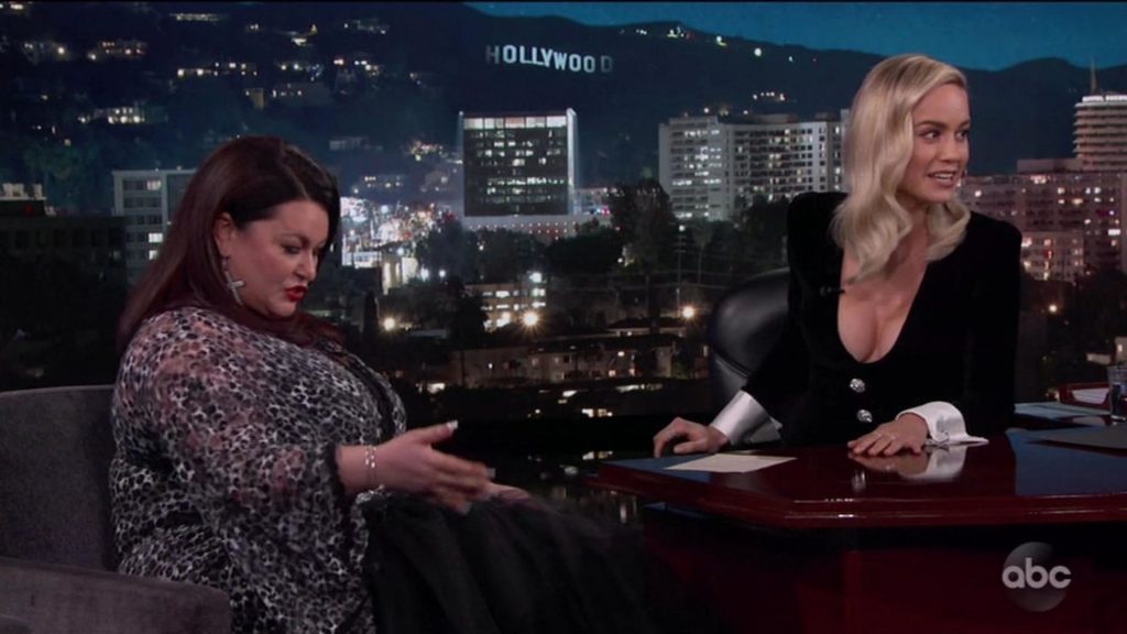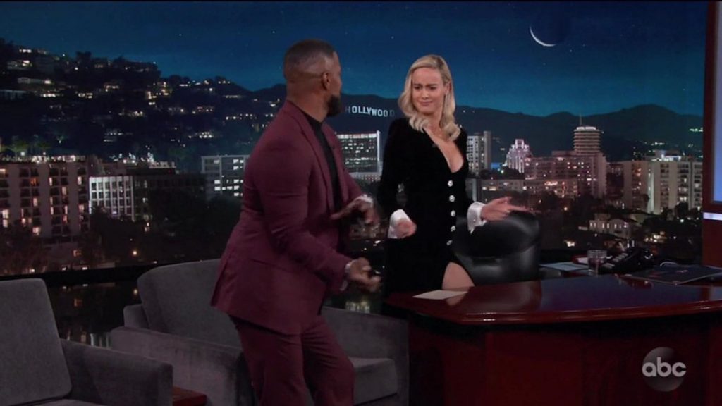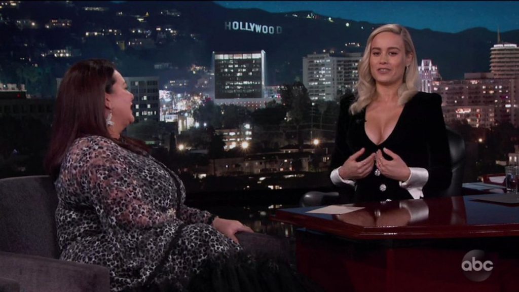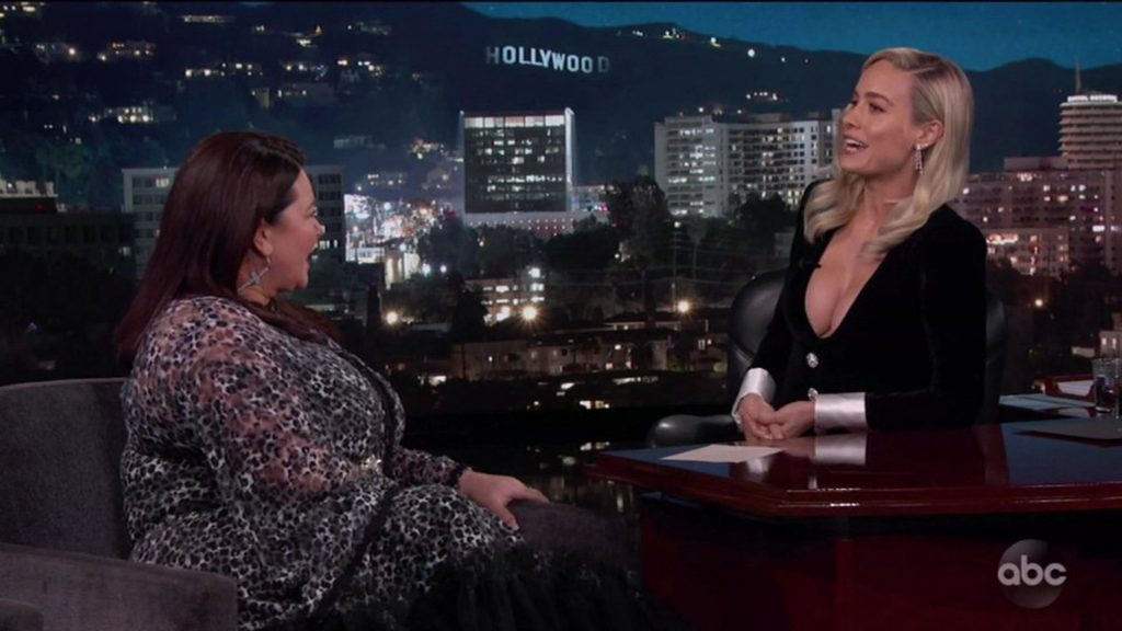 Molly confirmó que ese era su superpoder, lo que llevó a Brie a señalar su vestido y bromear: “¡Te lo puse muy fácil! ¡Aquí tienes!” Molly entonces le dijo: “Eres una 30F, que es de triple D a G, pero no es lo que compras.” Una sorprendida Brie respondió: “¡No compro eso!” Molly añadió: “Compras como 34Ds,” a lo que Brie respondió: “¡Santo cielo!” Molly luego le preguntó: “¿Eso es lo que compras?” y la estrella confirmó: “¡Sí!” Después de que Molly se quejara de que “nadie en América sabe las tallas de sujetador”, Brie sacó una foto de Taylor Swift en la nueva película Cats y dijo: “Tengo una pregunta difícil para ti. ¿Cuál es la talla de sujetador de esta?” Molly respondió riendo: “Ella es un poco más pequeña, es una D.” Brie, que se había burlado de la nueva película Cats en el monólogo de apertura del programa, preguntó: “¿Estás teniendo en cuenta el pelaje?” a lo que Molly dijo: “Oh sí.” También en el programa Brie entrevistó a su compañero de Just Mercy Jamie Foxx, quien también comentó sobre su apariencia, diciéndole: “¡Te ves increíble, eres hermosa!”