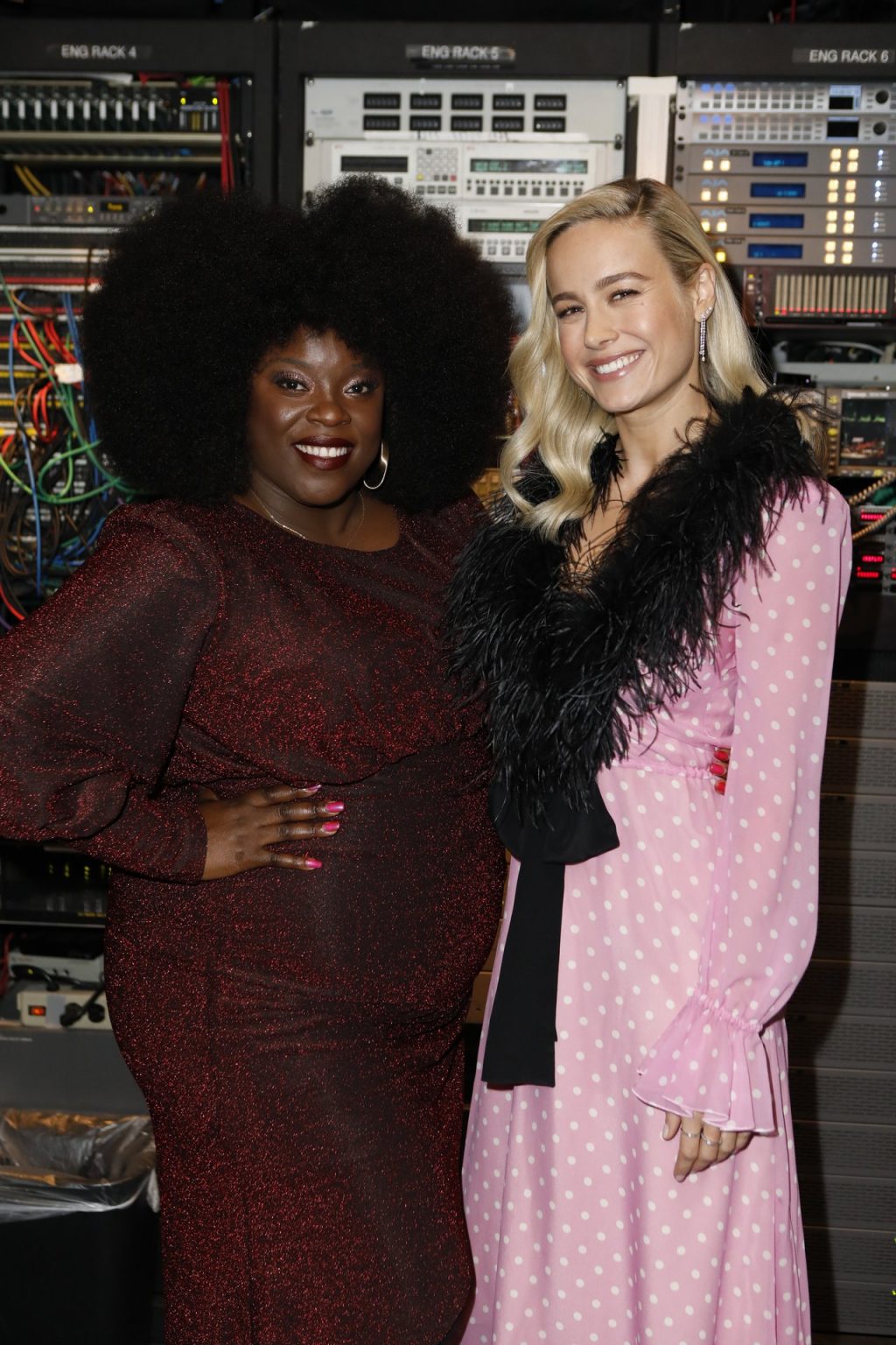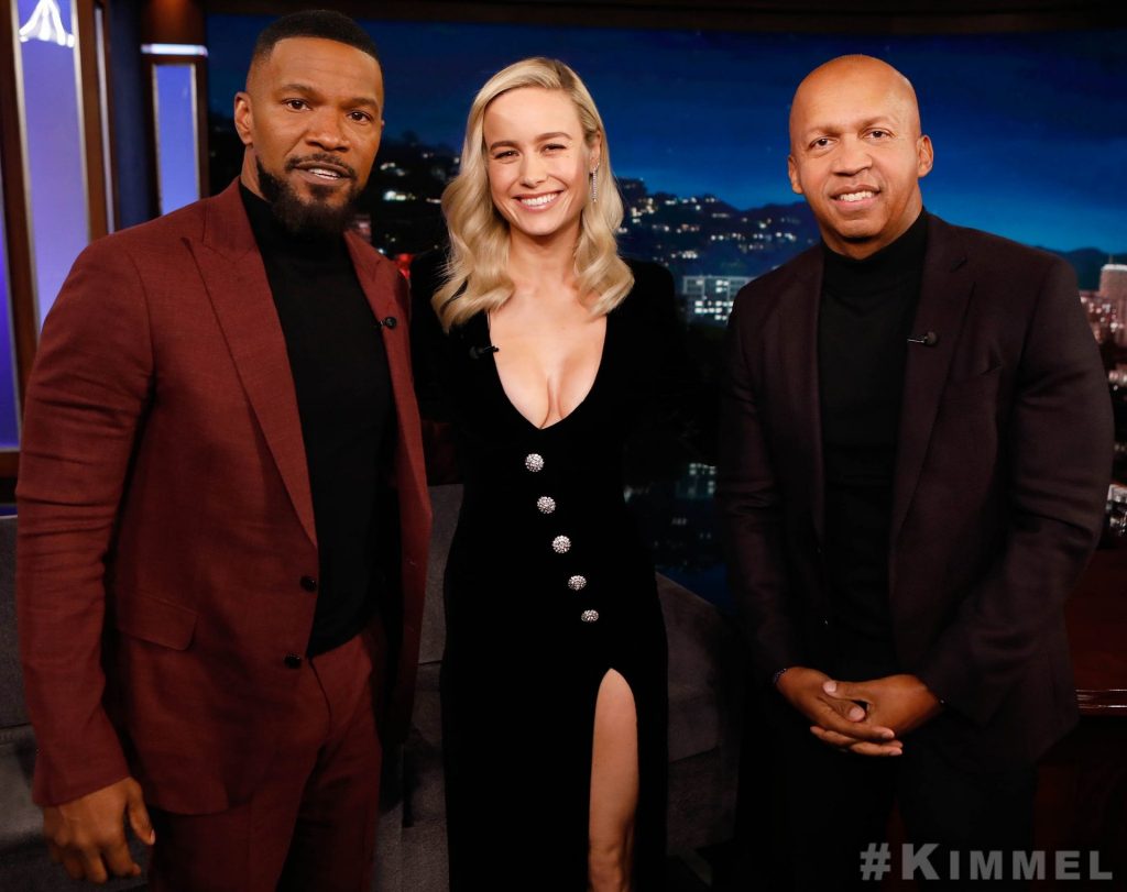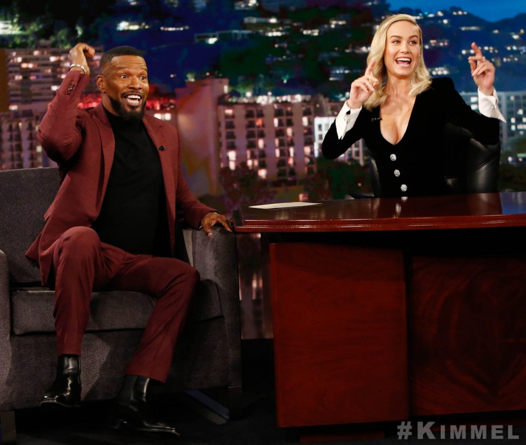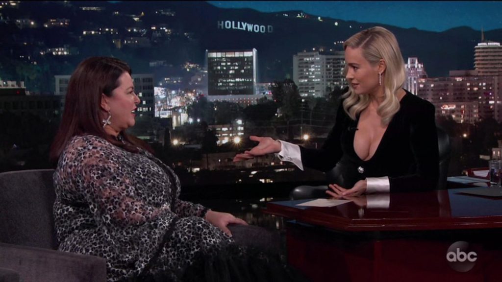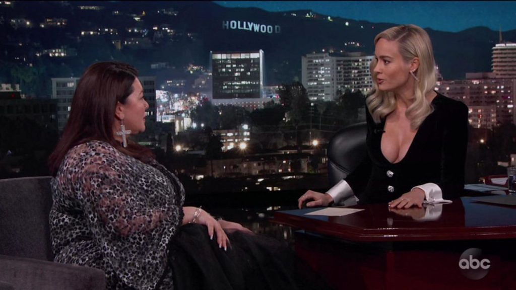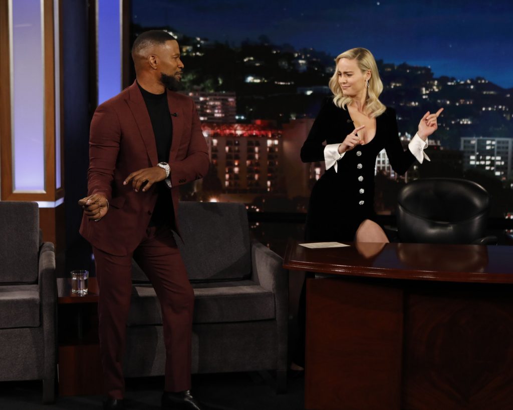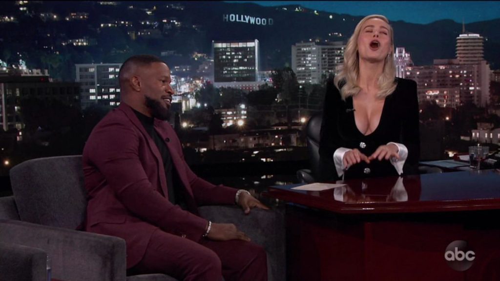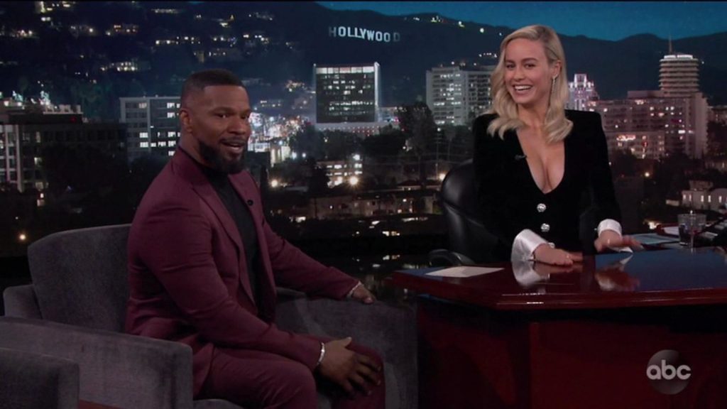 Molly confirmó que ese era su superpoder, lo que llevó a Brie a señalar su vestido y bromear: “¡Te lo puse muy fácil! ¡Aquí tienes!” Molly entonces le dijo: “Eres una 30F, que es de triple D a G, pero no es lo que compras.” Una sorprendida Brie respondió: “¡No compro eso!” Molly añadió: “Compras como 34Ds,” a lo que Brie respondió: “¡Santo cielo!” Molly luego le preguntó: “¿Eso es lo que compras?” y la estrella confirmó: “¡Sí!” Después de que Molly se quejara de que “nadie en América sabe las tallas de sujetador”, Brie sacó una foto de Taylor Swift en la nueva película Cats y dijo: “Tengo una pregunta difícil para ti. ¿Cuál es la talla de sujetador de esta?” Molly respondió riendo: “Ella es un poco más pequeña, es una D.” Brie, que se había burlado de la nueva película Cats en el monólogo de apertura del programa, preguntó: “¿Estás teniendo en cuenta el pelaje?” a lo que Molly dijo: “Oh sí.” También en el programa Brie entrevistó a su compañero de Just Mercy Jamie Foxx, quien también comentó sobre su apariencia, diciéndole: “¡Te ves increíble, eres hermosa!”