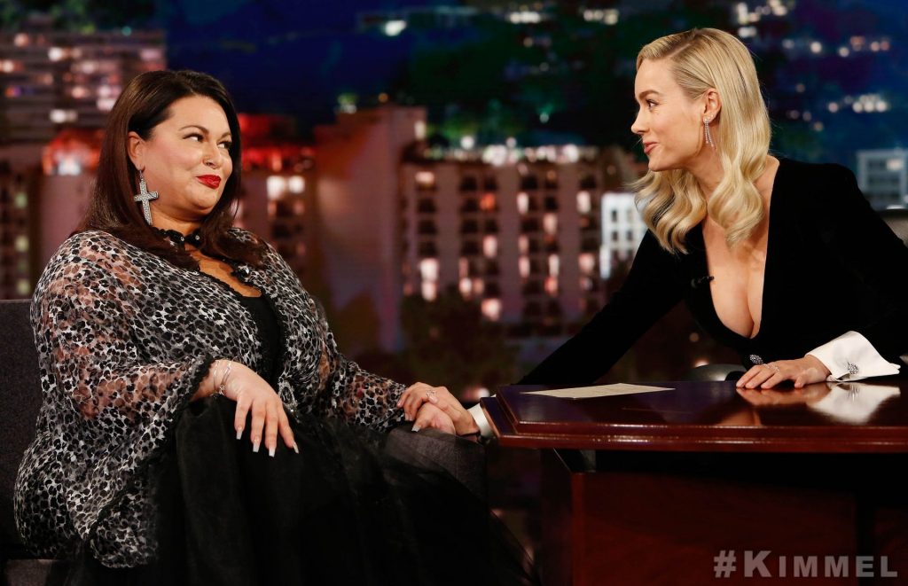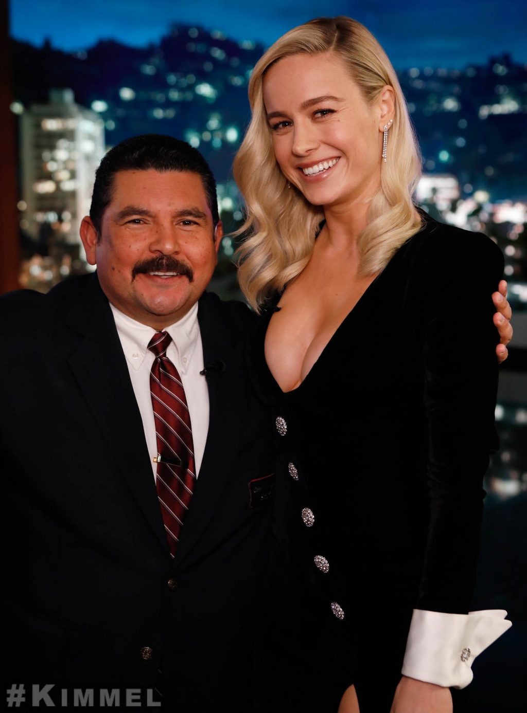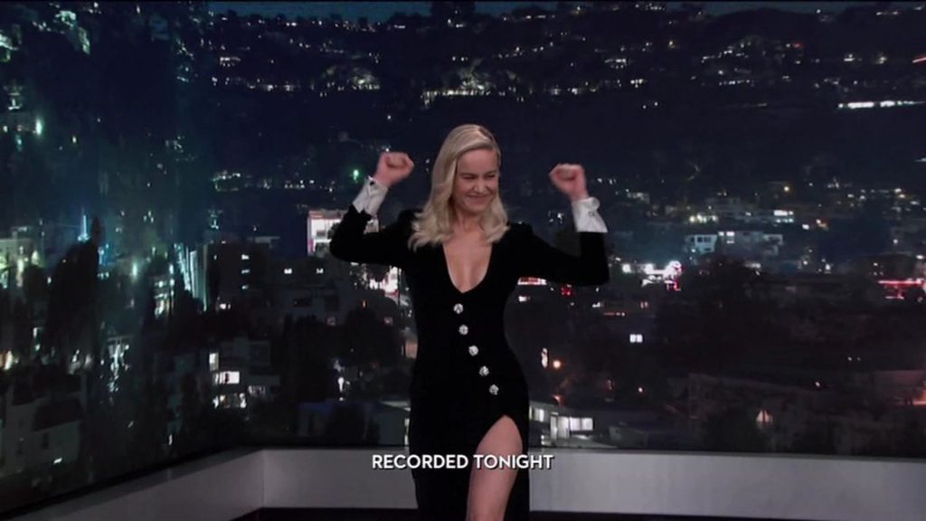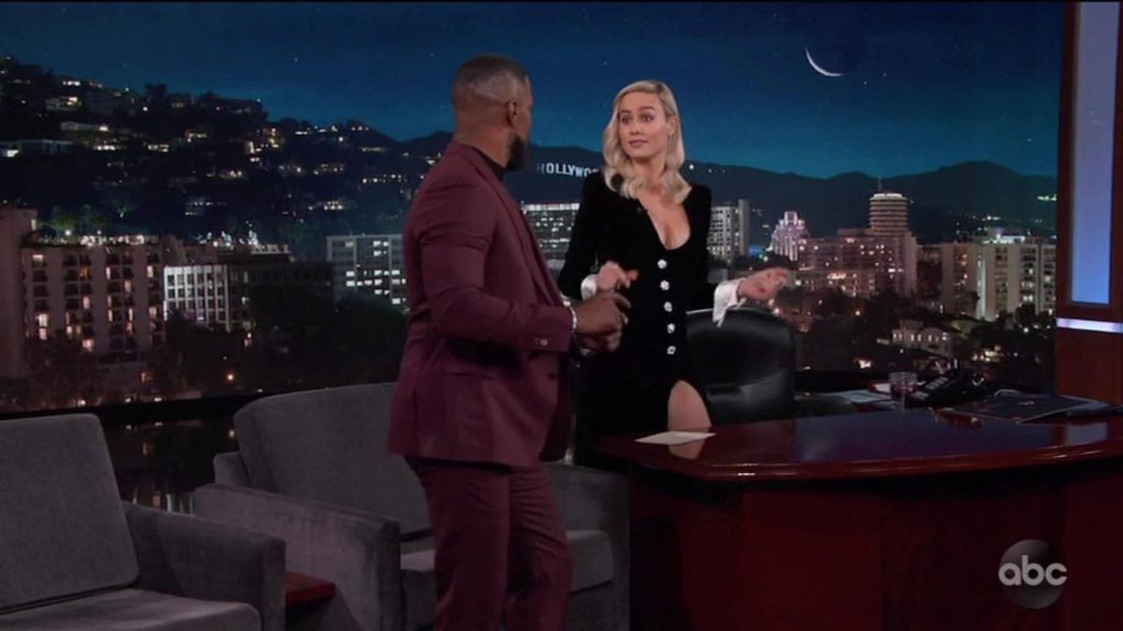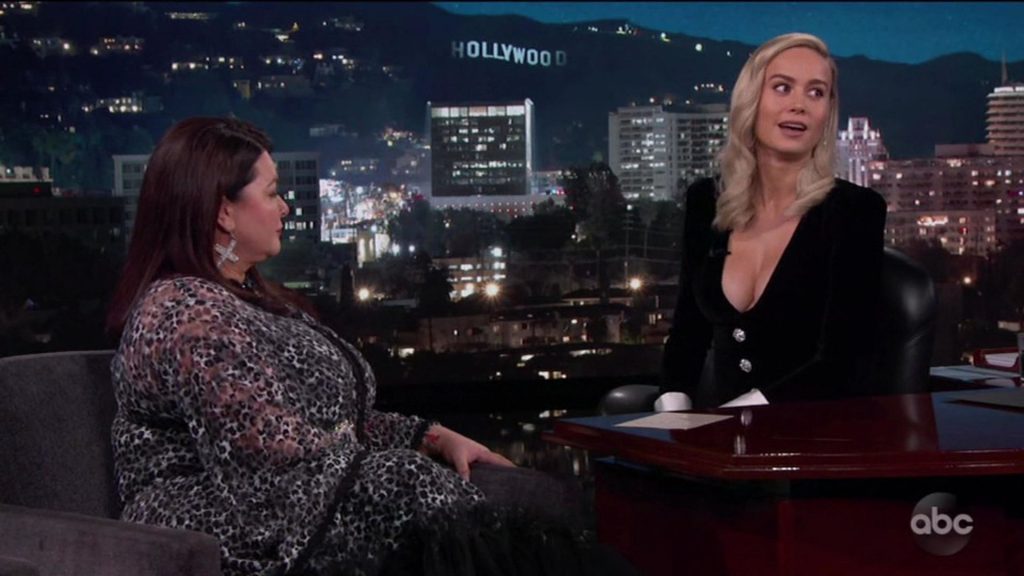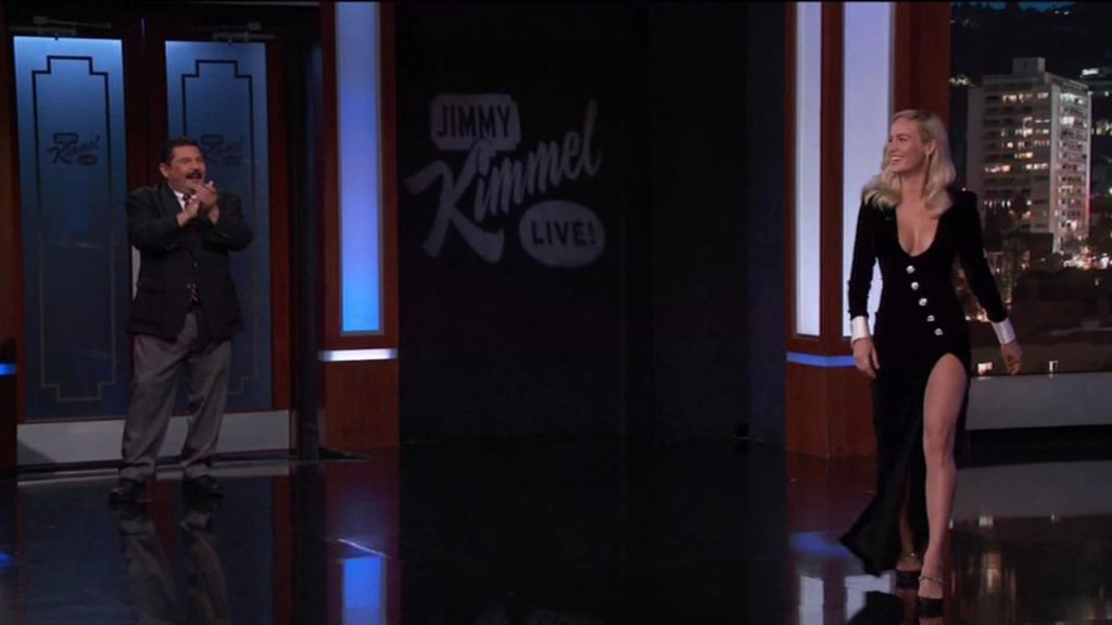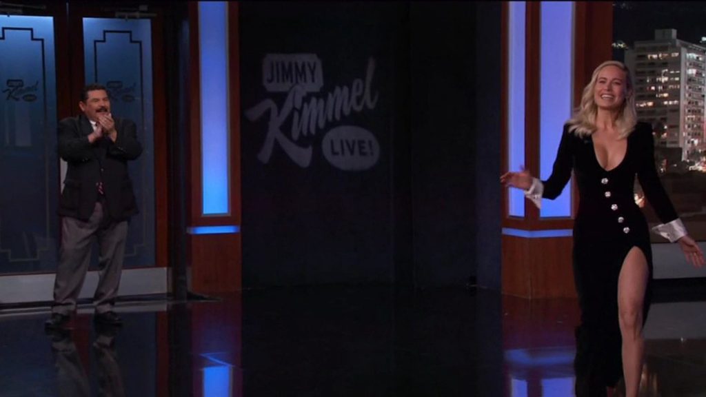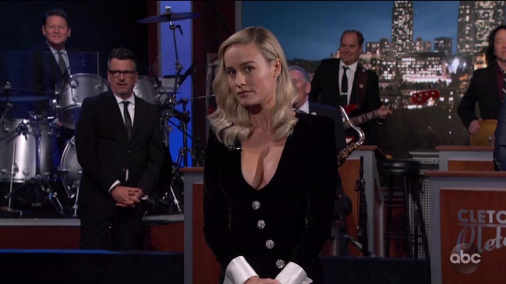 Brie Larson muestra su impresionante pecho 34D en un vestido increíblemente escotado mientras actúa como presentadora en Jimmy Kimmel Live, 19/11/2019. La estrella de Captain Marvel y Fappening evitó por poco un fallo de vestuario mientras presentaba el programa de entrevistas nocturno con un impresionante vestido negro que no solo mostraba sus pechos sino que también tenía una sexy abertura alta en el muslo.