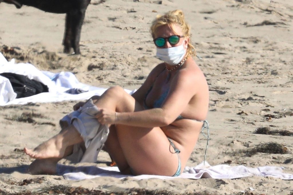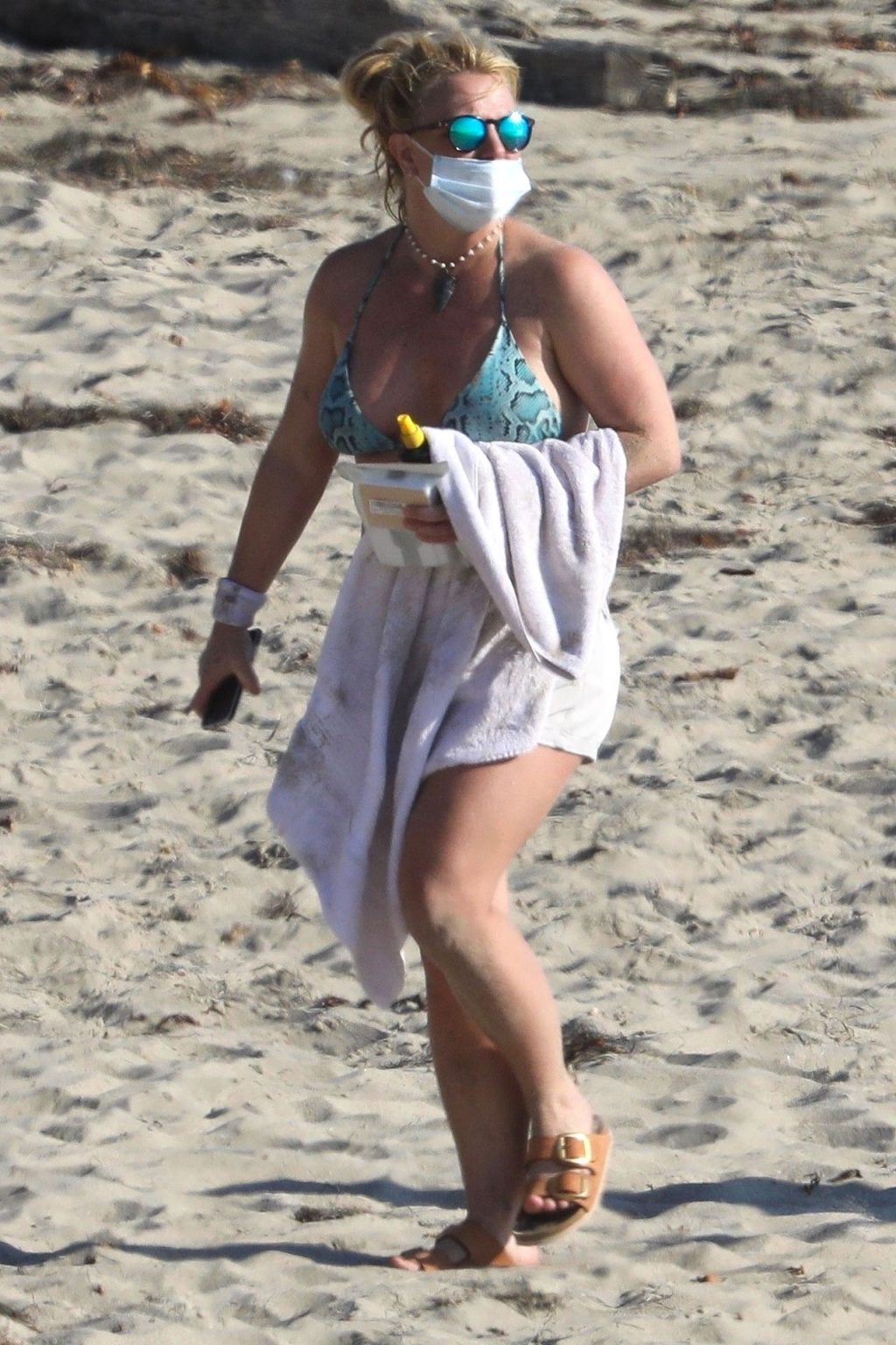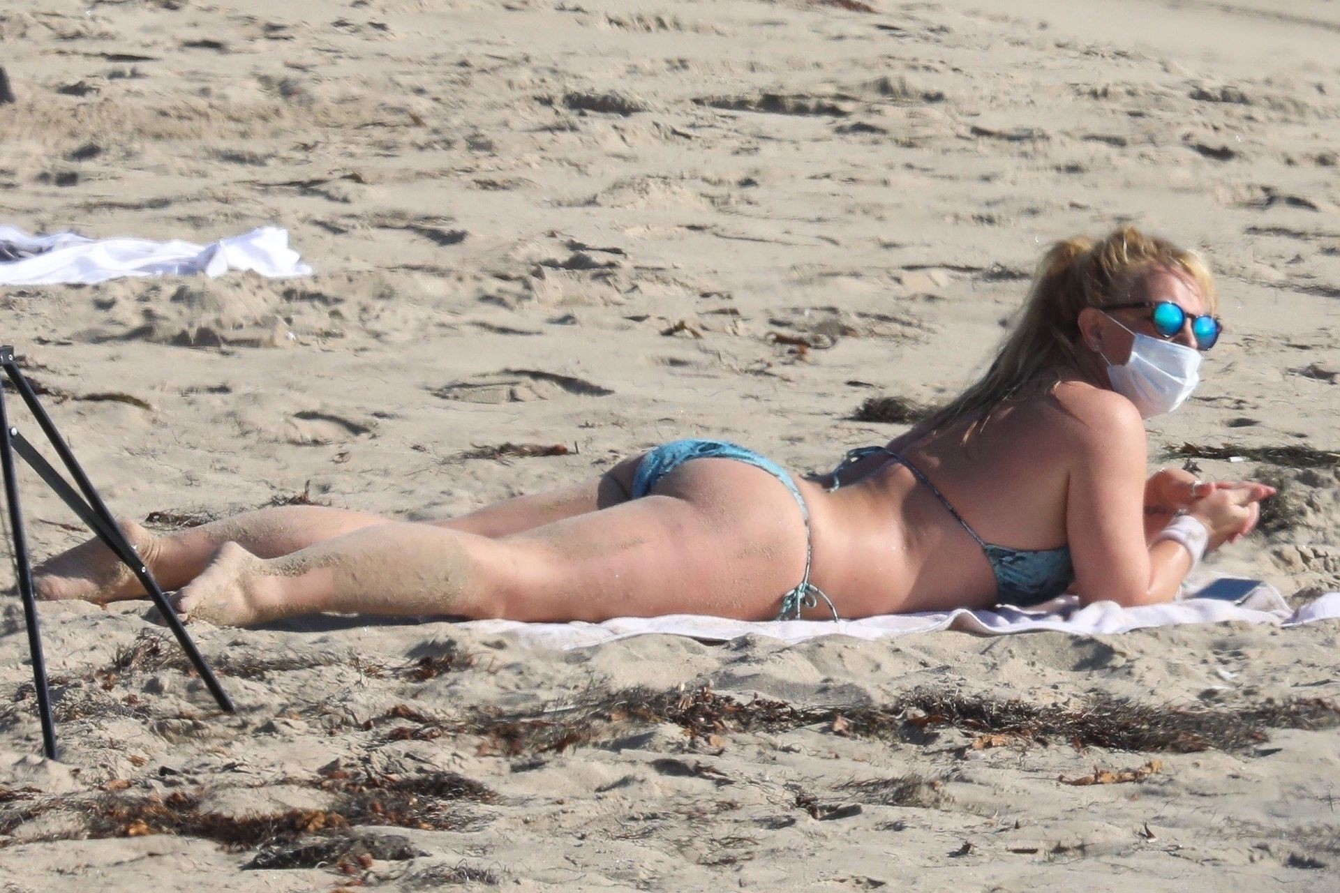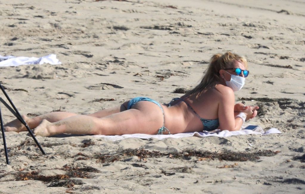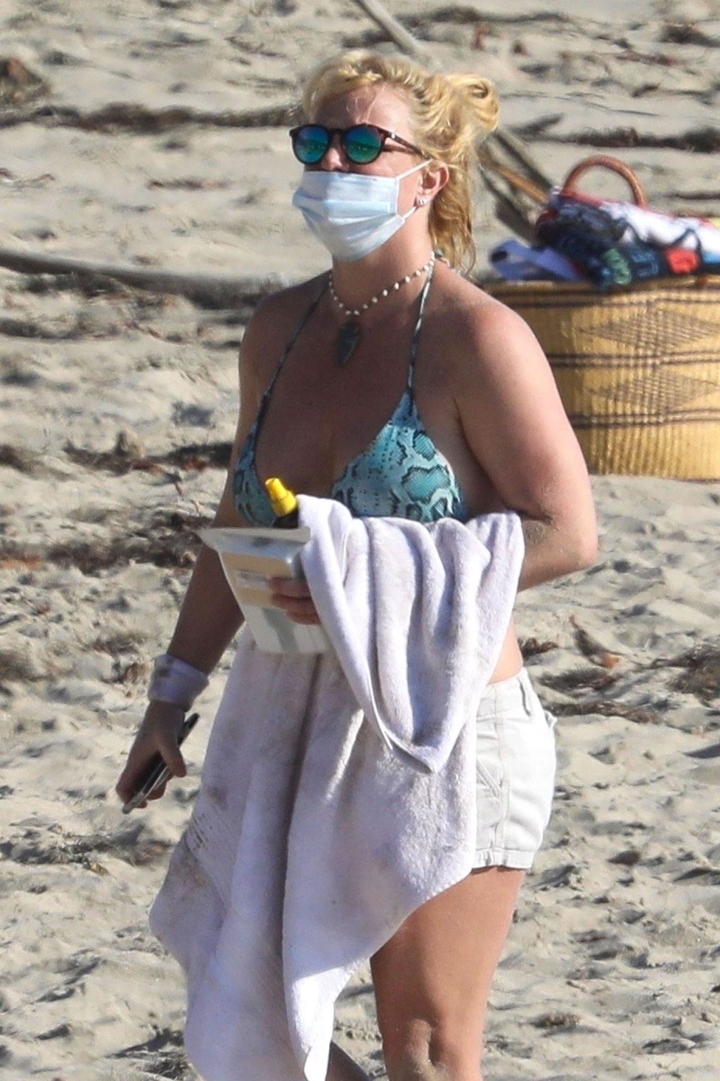 La cantante y compositora estadounidense Britney Spears lleva su mascarilla protectora mientras toma el sol en la playa de Malibu, mostrando su cuerpo playero y vistiendo un bikini de dos piezas con estampado animal bajo el sol abrasador, 15/10/2020.