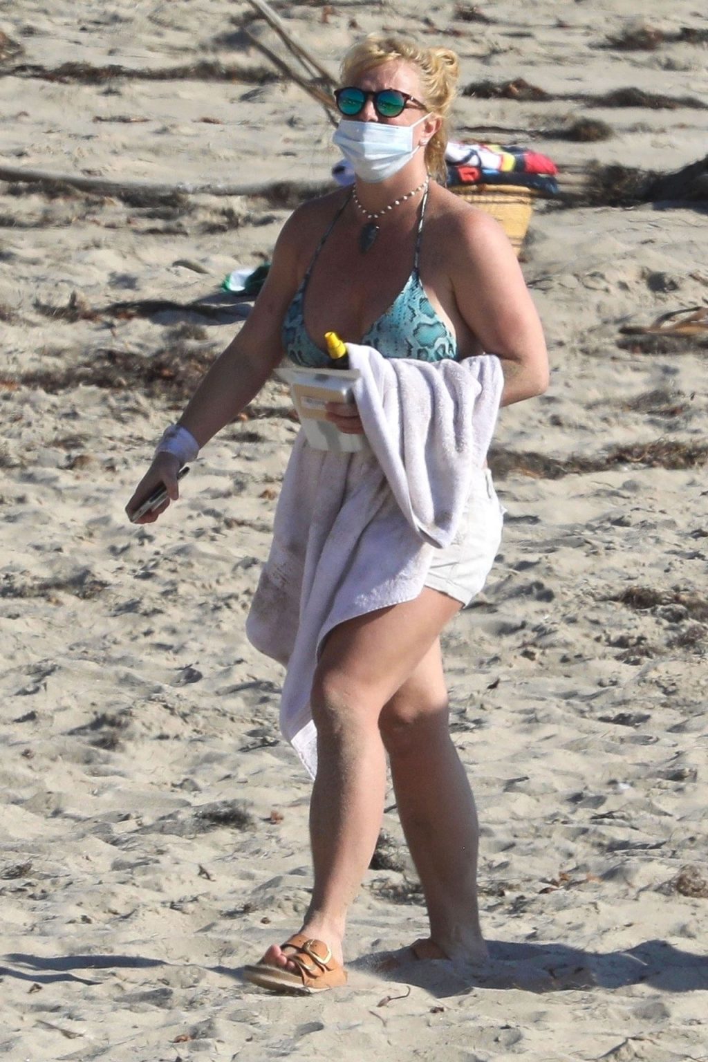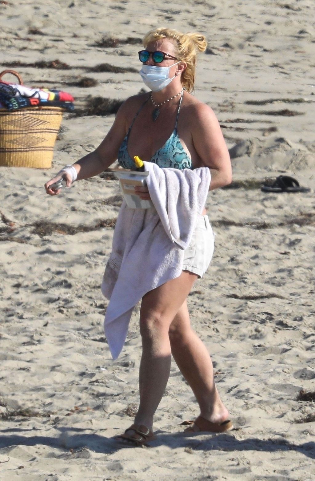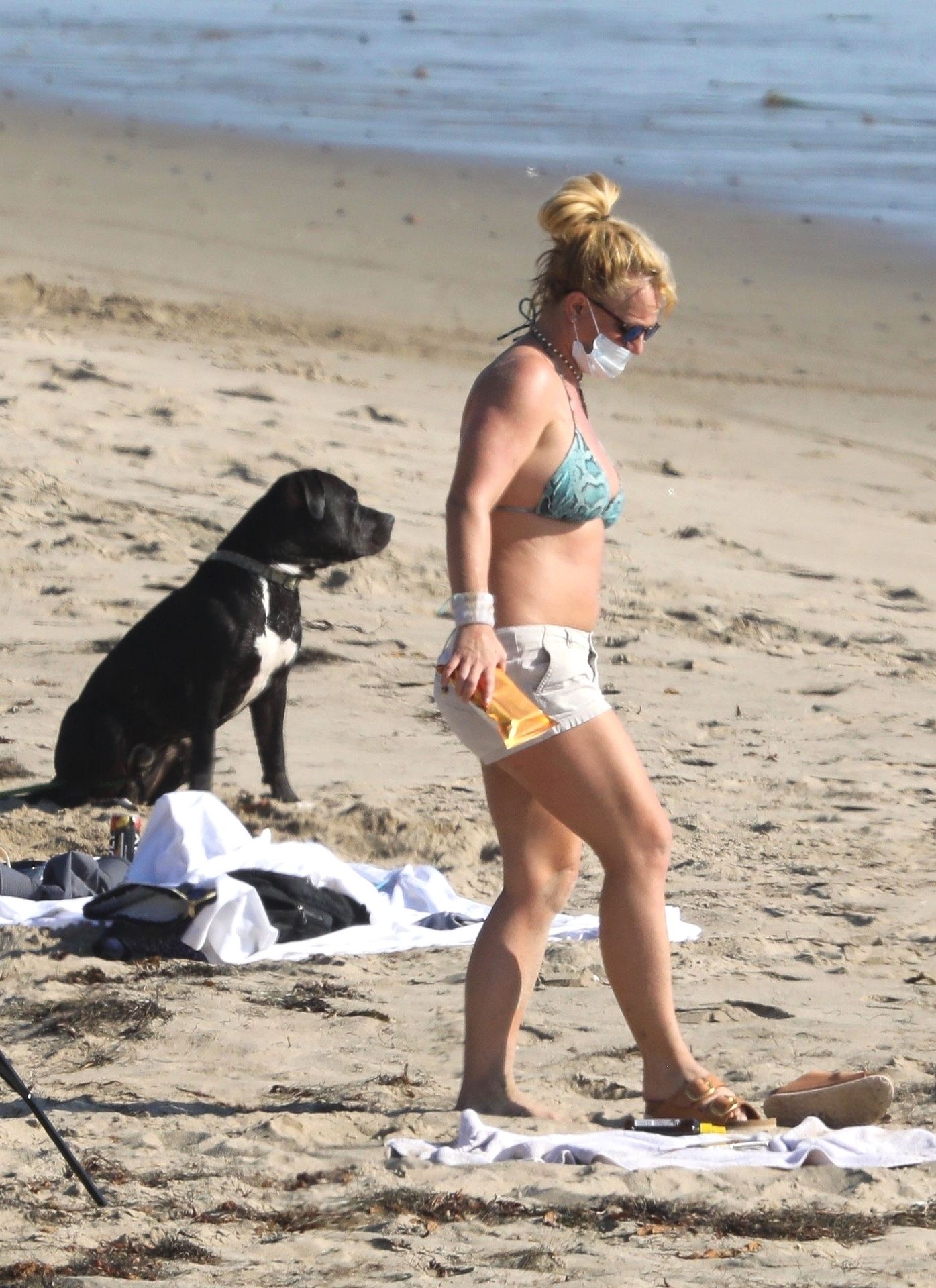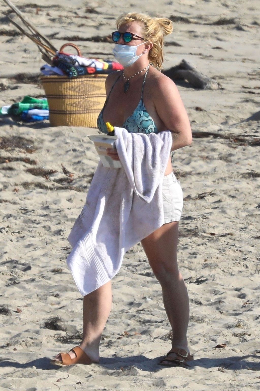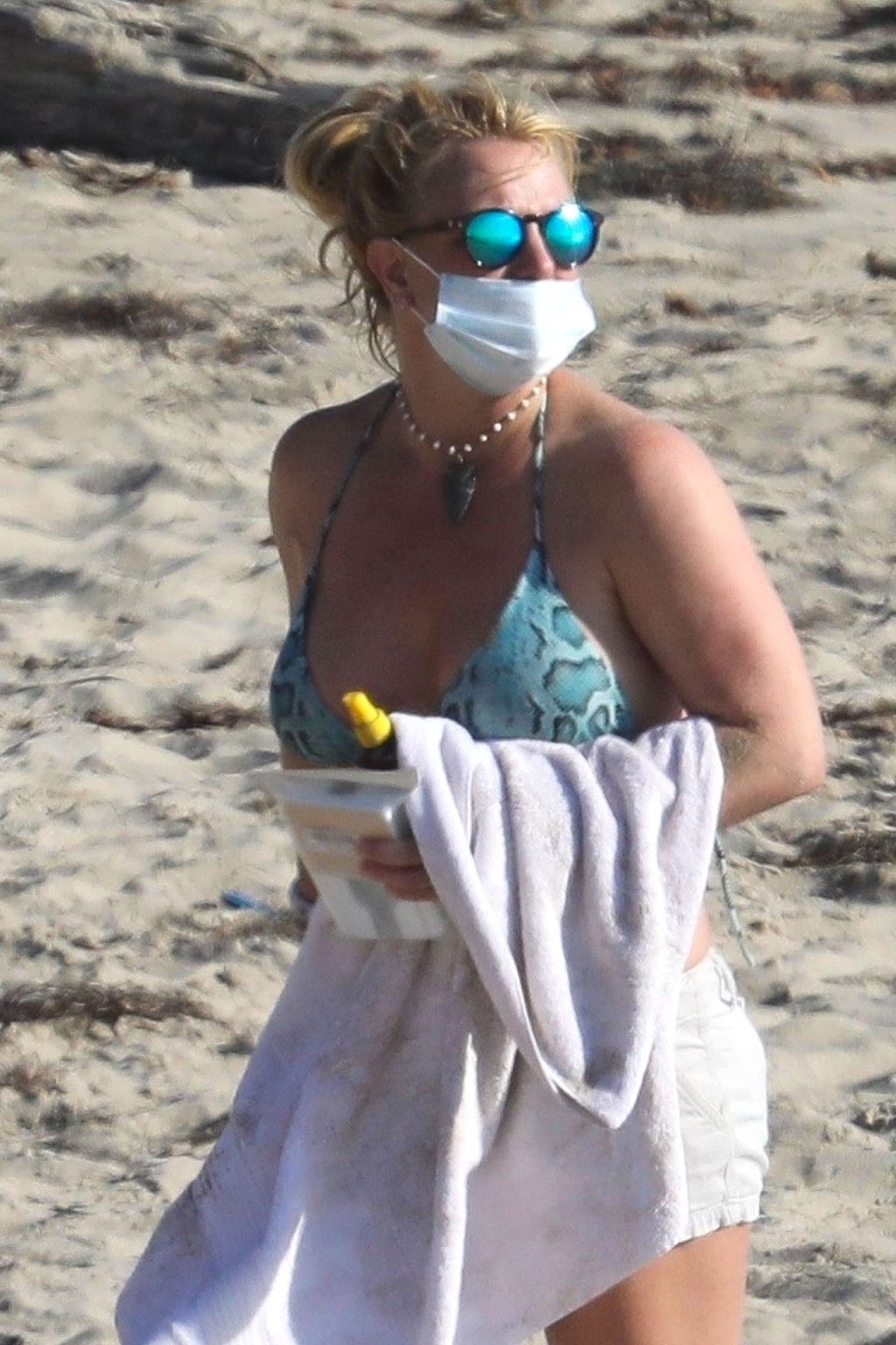 La cantante y compositora estadounidense Britney Spears lleva su mascarilla protectora mientras toma el sol en la playa de Malibu, mostrando su cuerpo playero y vistiendo un bikini de dos piezas con estampado animal bajo el sol abrasador, 15/10/2020.
