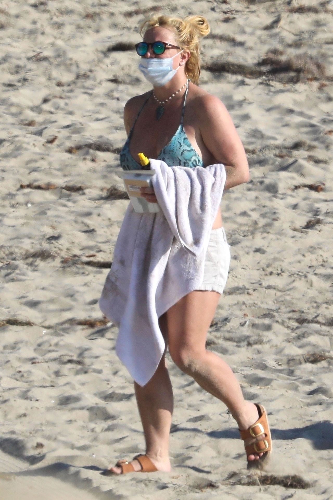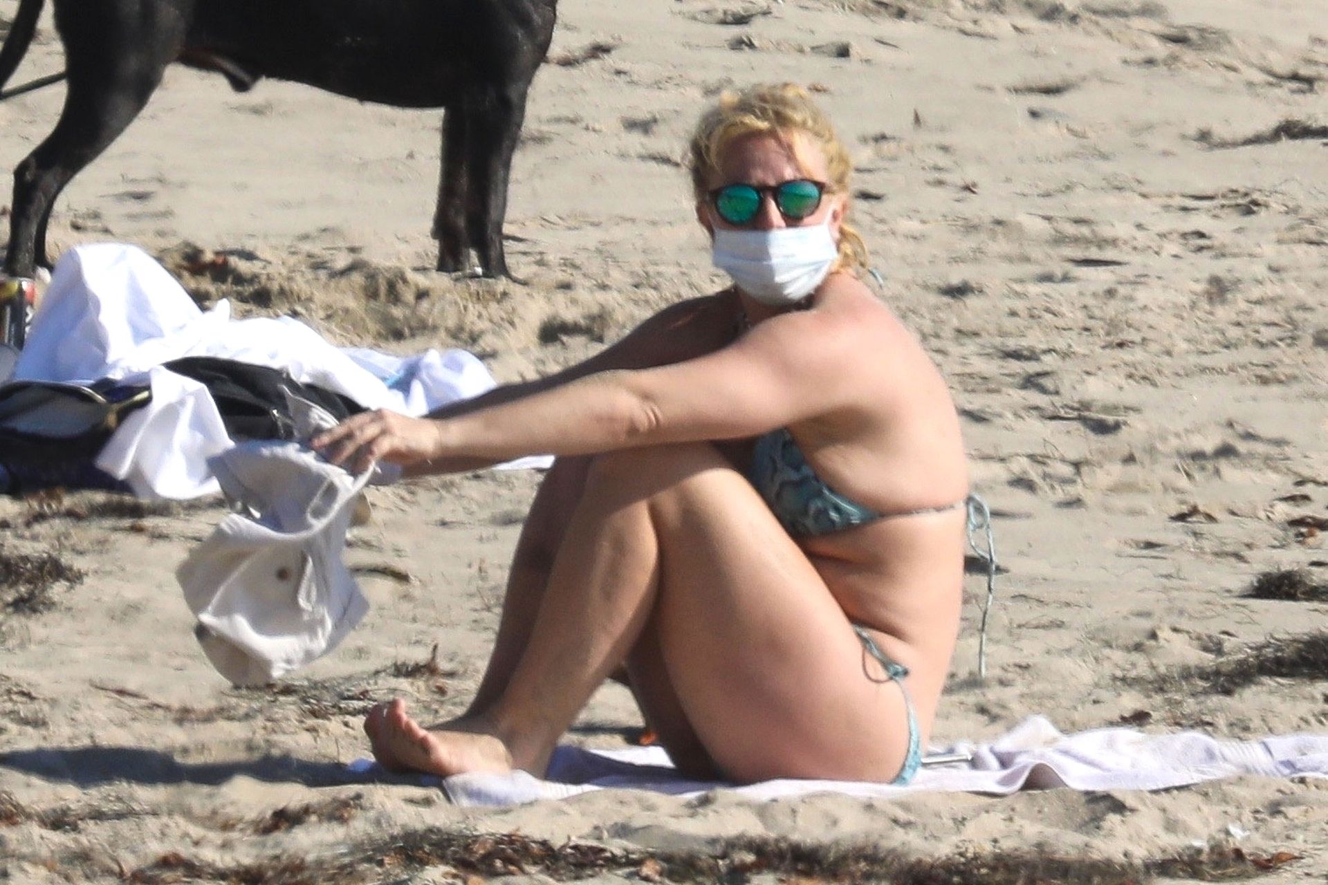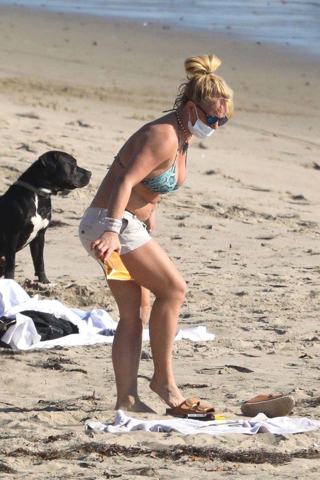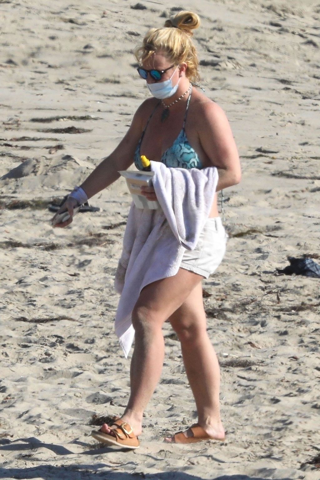La cantante y compositora estadounidense Britney Spears lleva su mascarilla protectora mientras toma el sol en la playa de Malibu, mostrando su cuerpo playero y vistiendo un bikini de dos piezas con estampado animal bajo el sol abrasador, 15/10/2020.