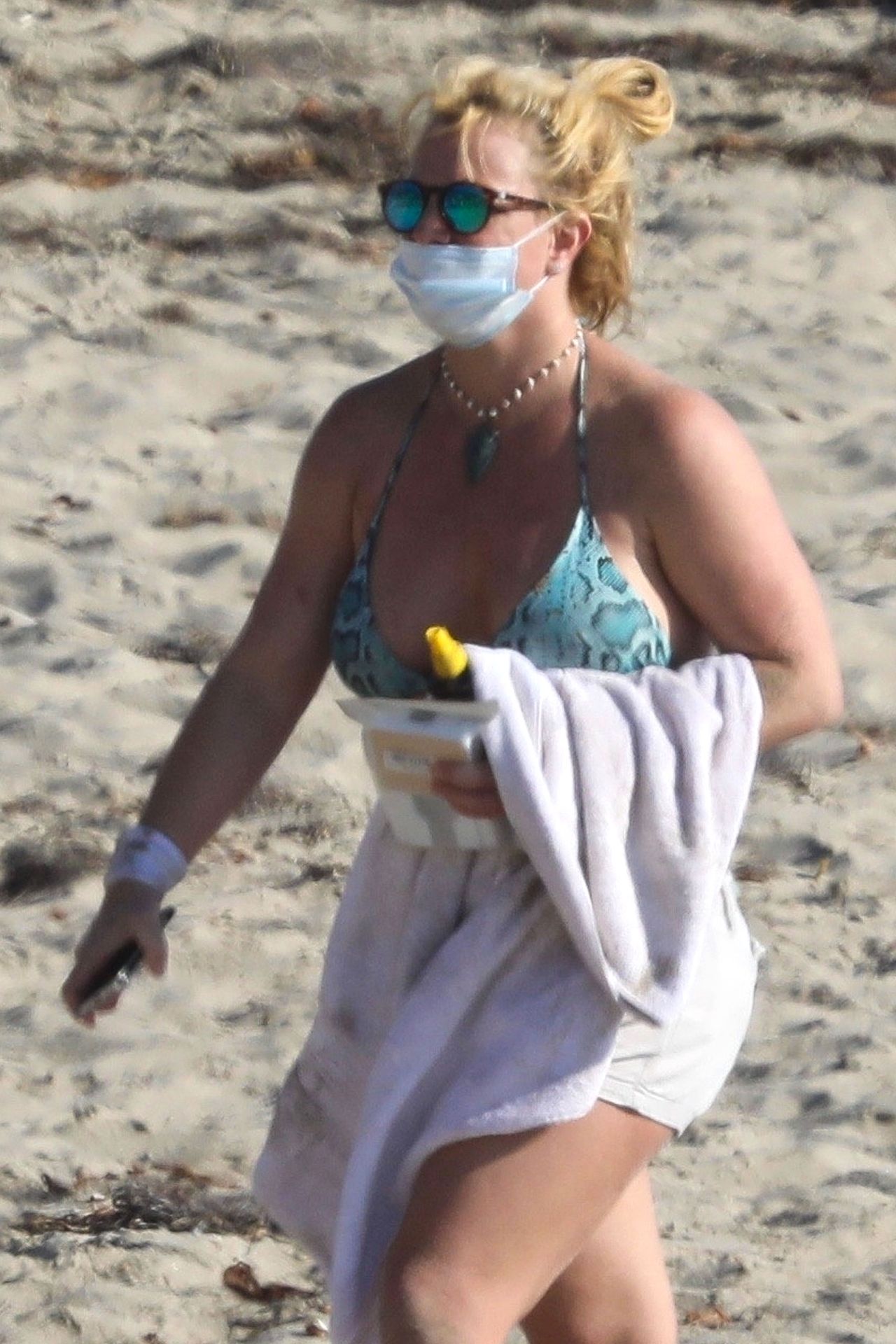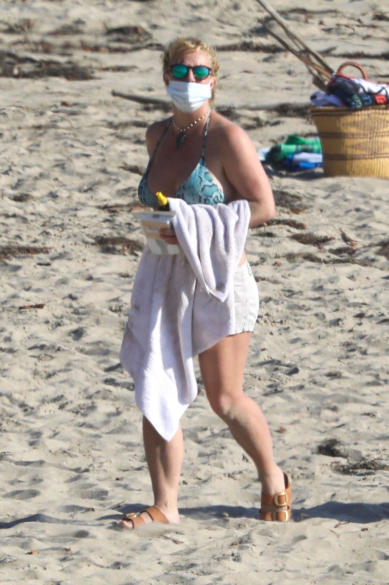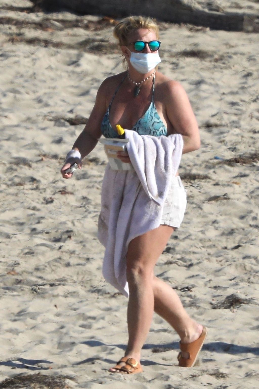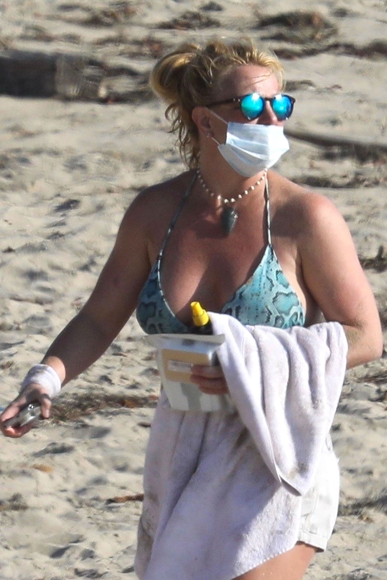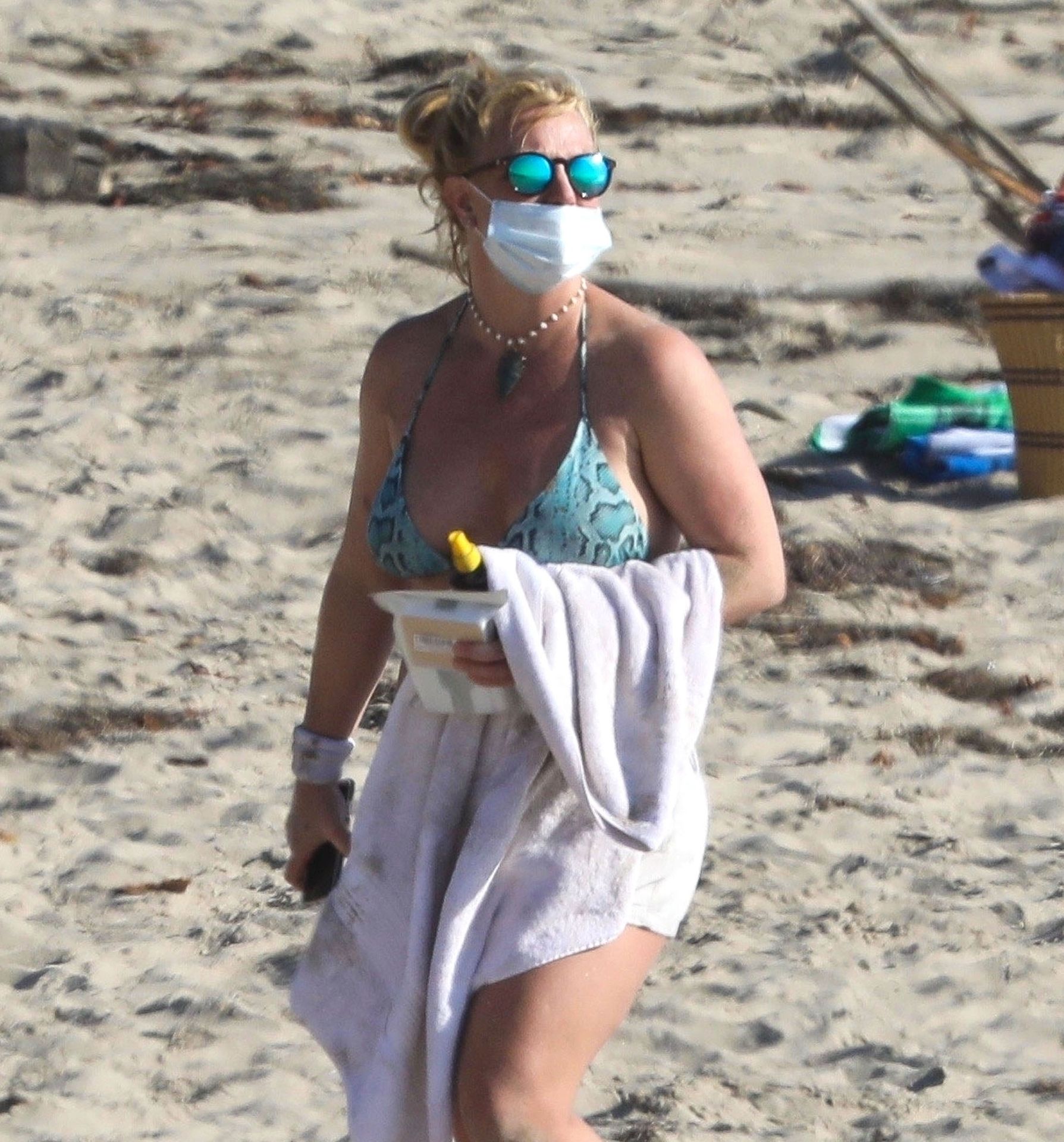La cantante y compositora estadounidense Britney Spears lleva su mascarilla protectora mientras toma el sol en la playa de Malibu, mostrando su cuerpo playero y vistiendo un bikini de dos piezas con estampado animal bajo el sol abrasador, 15/10/2020.