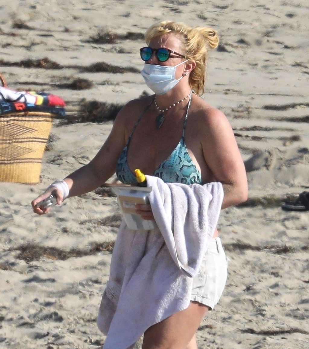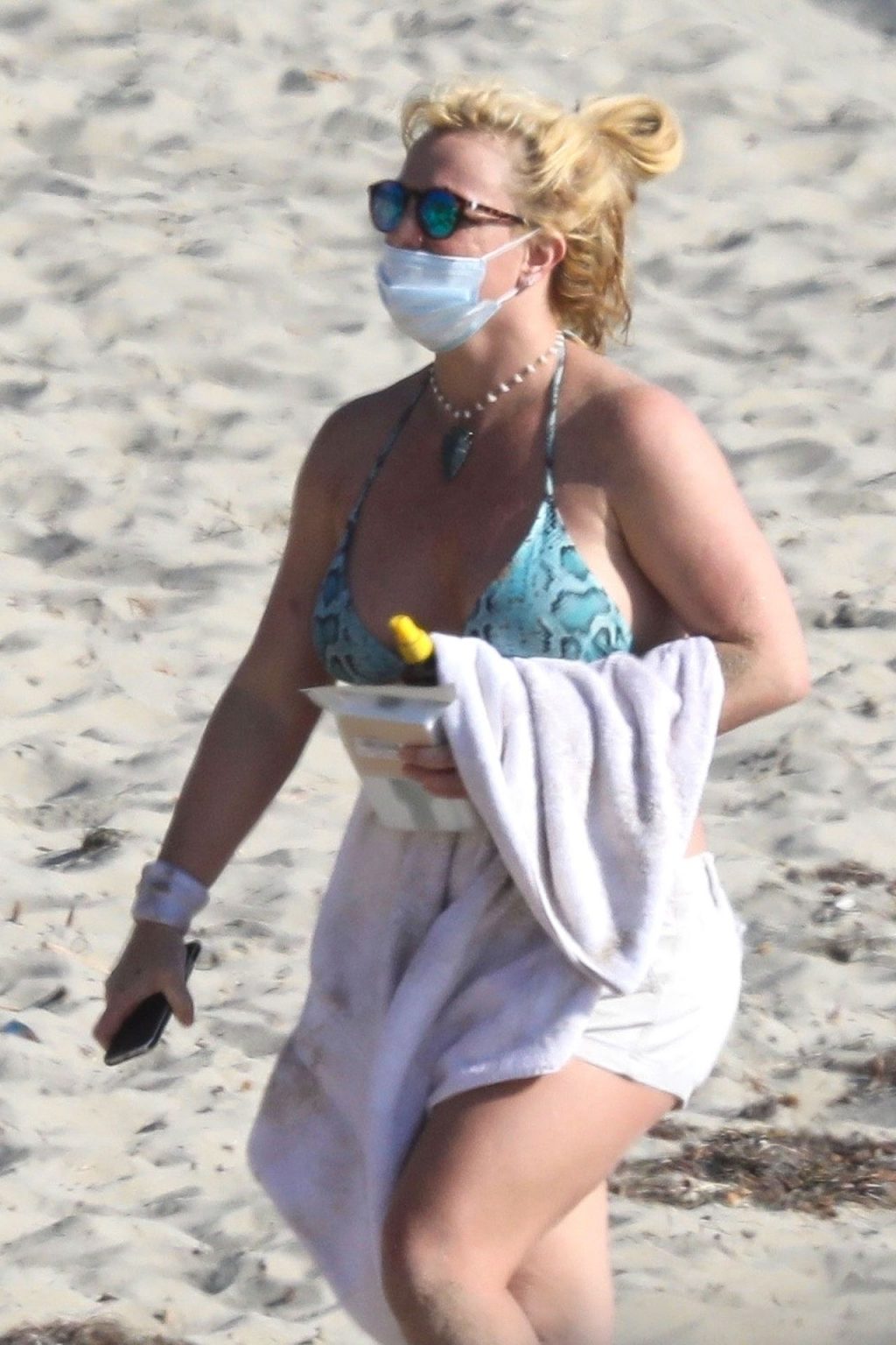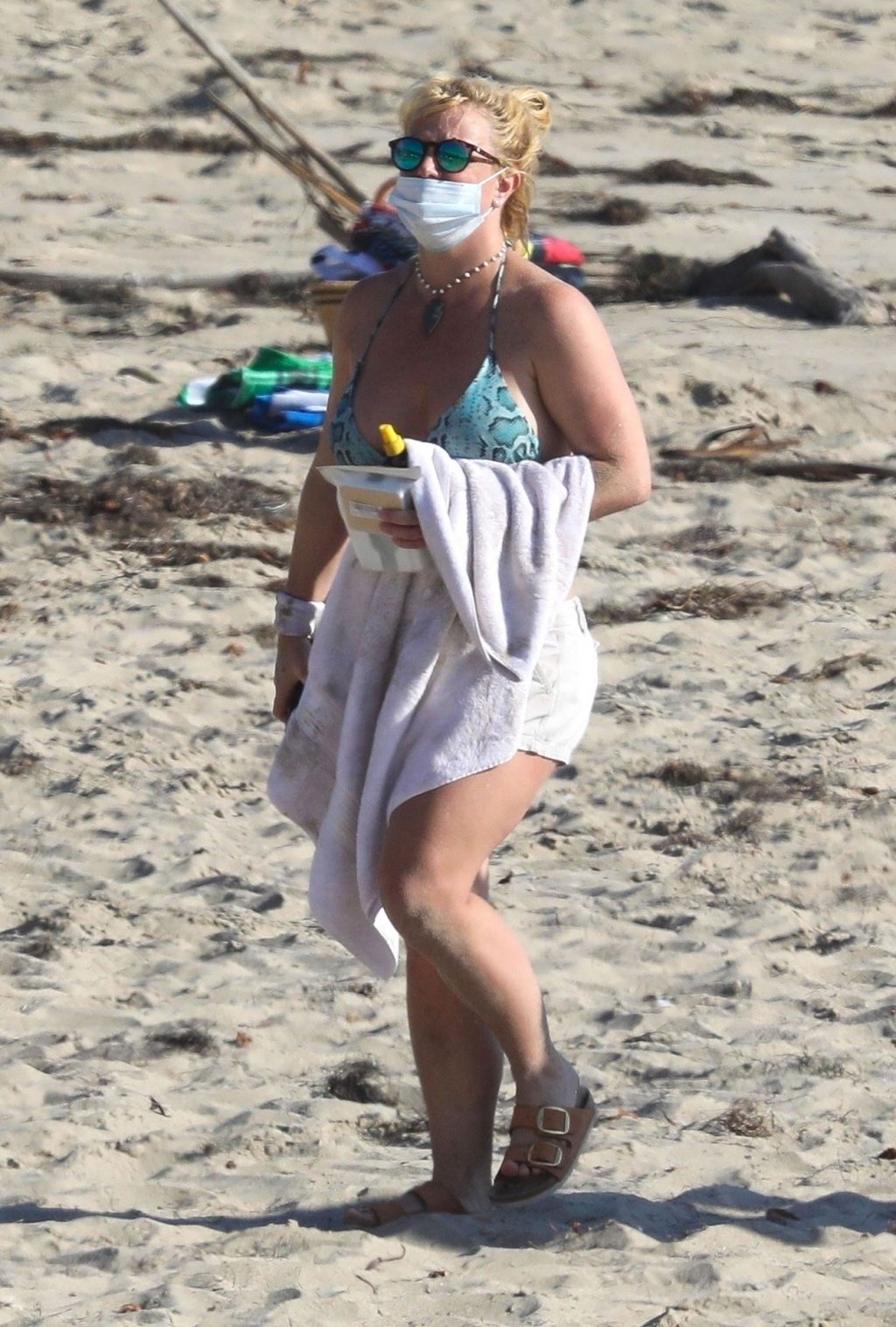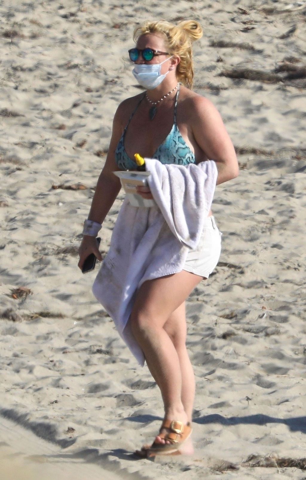 La cantante y compositora estadounidense Britney Spears lleva su mascarilla protectora mientras toma el sol en la playa de Malibu, mostrando su cuerpo playero y vistiendo un bikini de dos piezas con estampado animal bajo el sol abrasador, 15/10/2020.