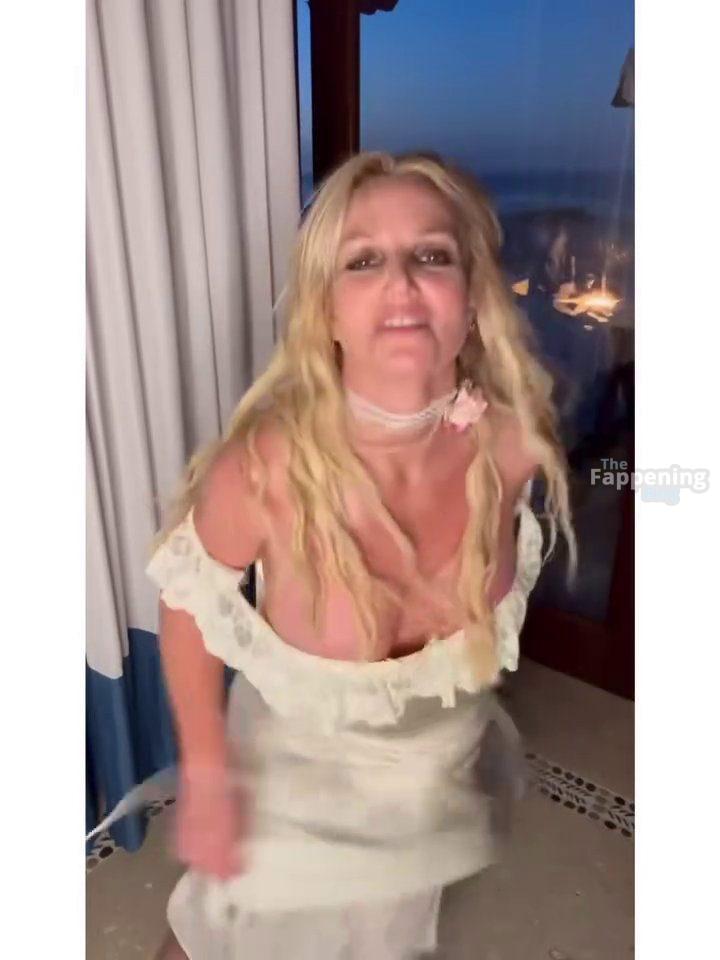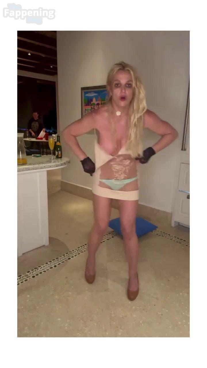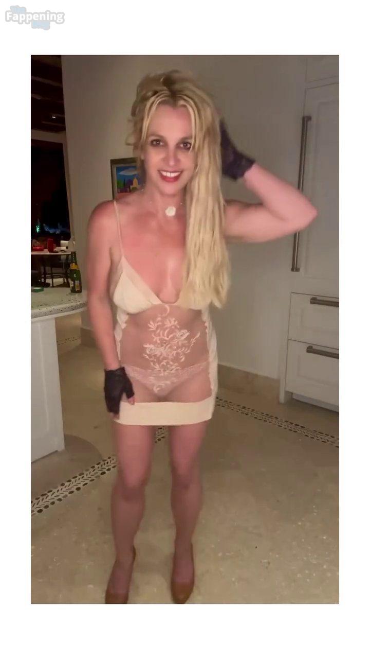 Britney Spears posa en lencería transparente. Sus pechos casi se salen en un baile loco y sexy, mostrando las areolas y los pezones de manera provocativa.