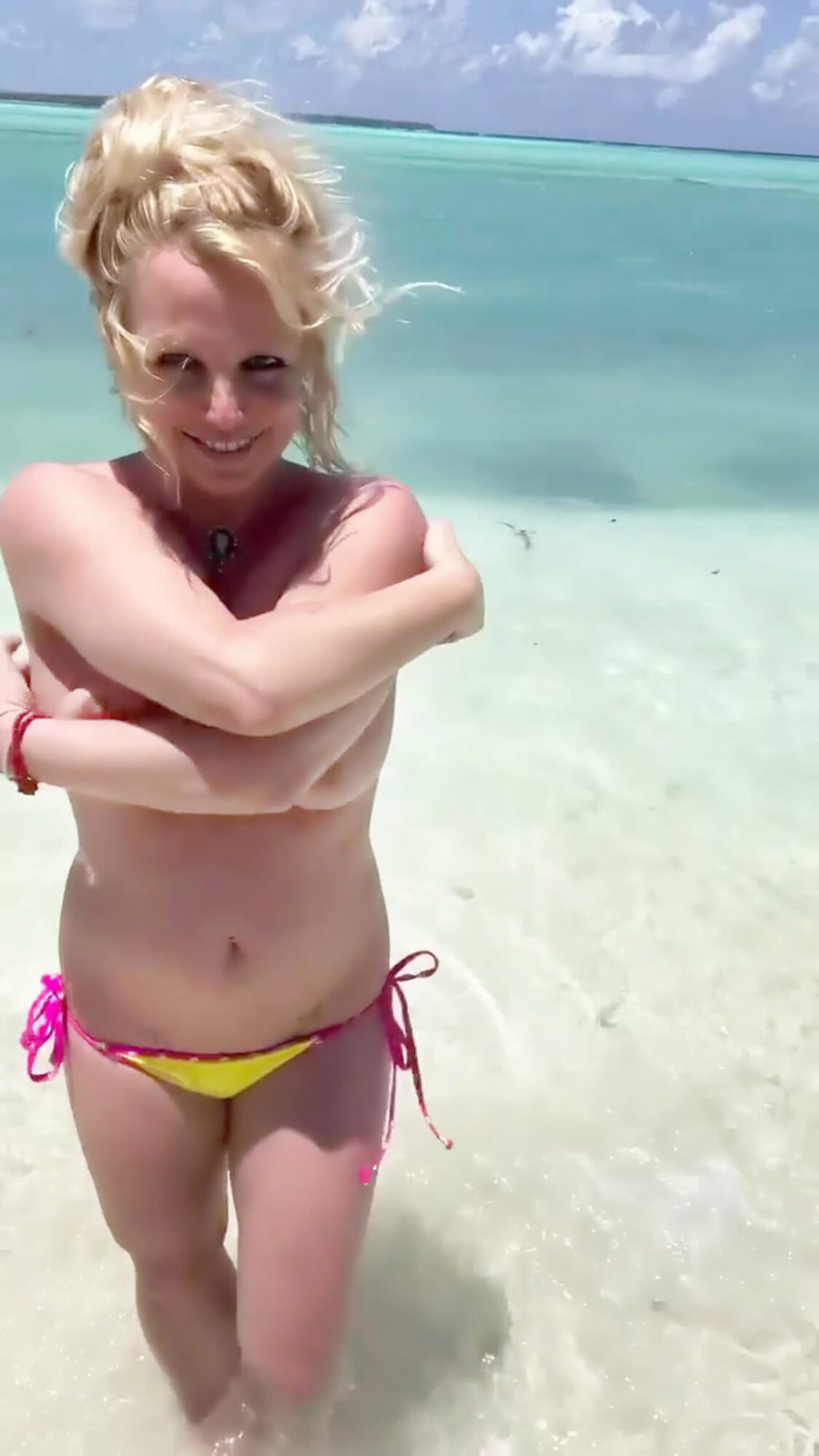 Britney Spears Muestra Sus Pechos Desnudos Mientras Posaba Sin Parte Superior en la Playa (14 Fotos Mejoradas + Video)