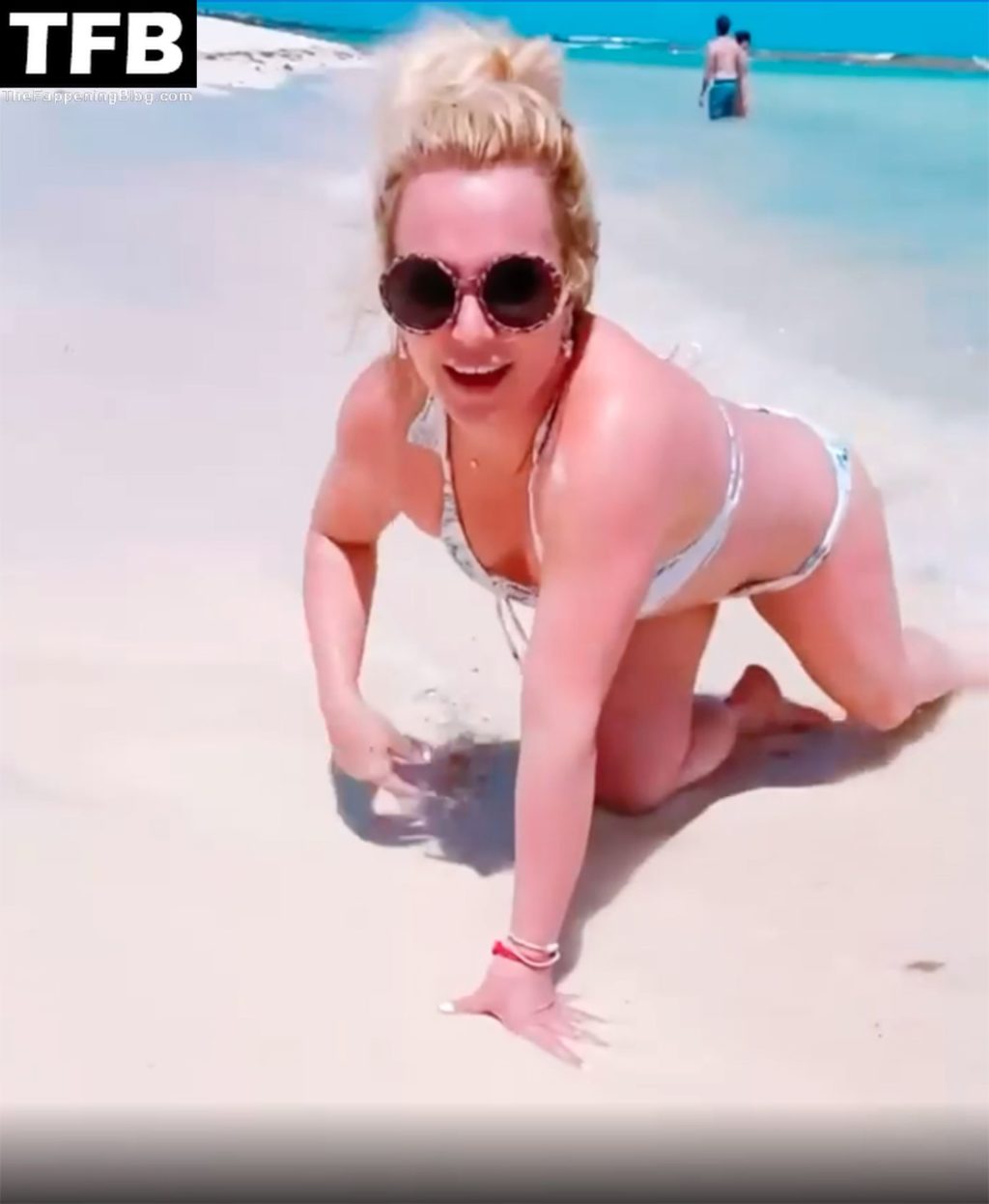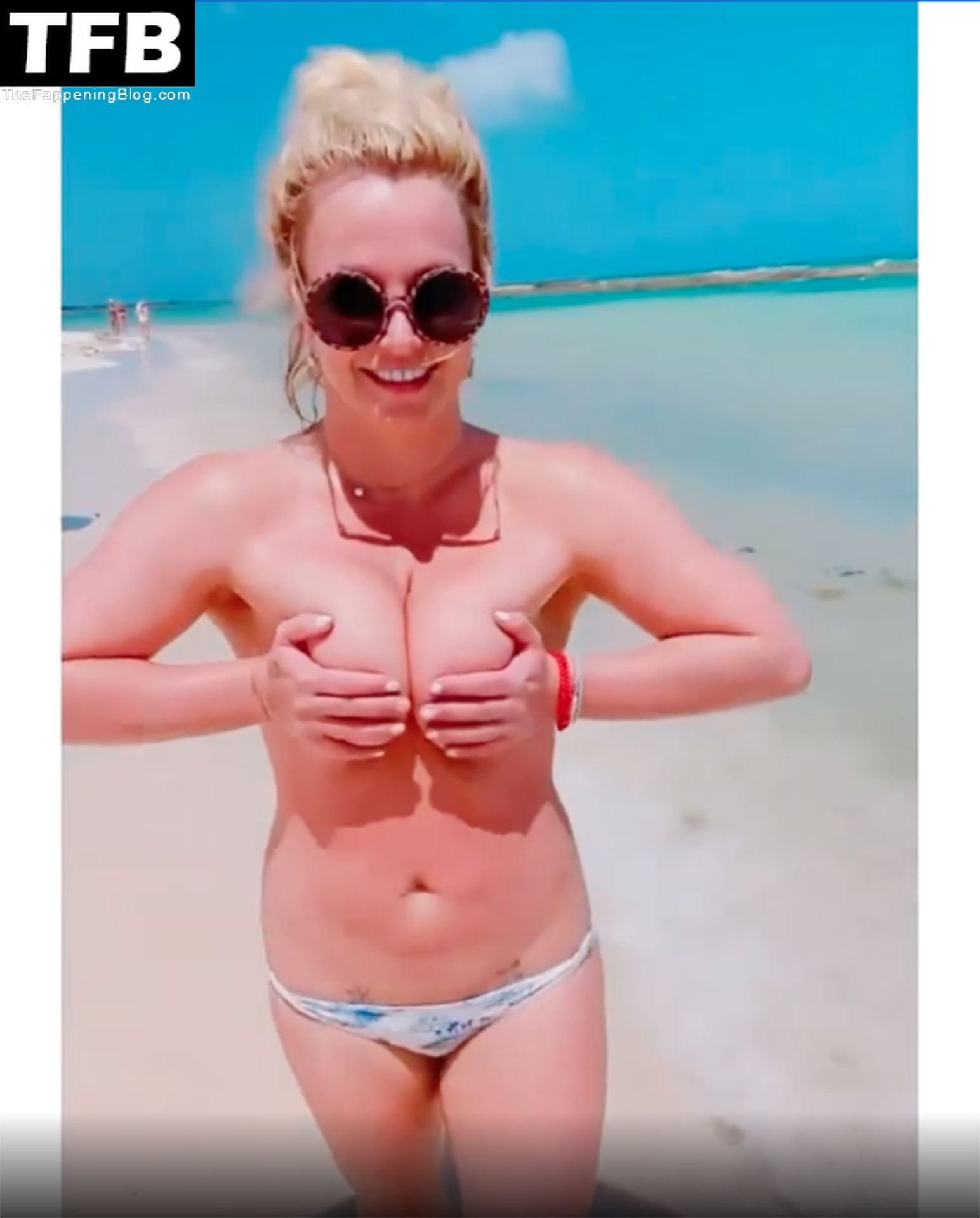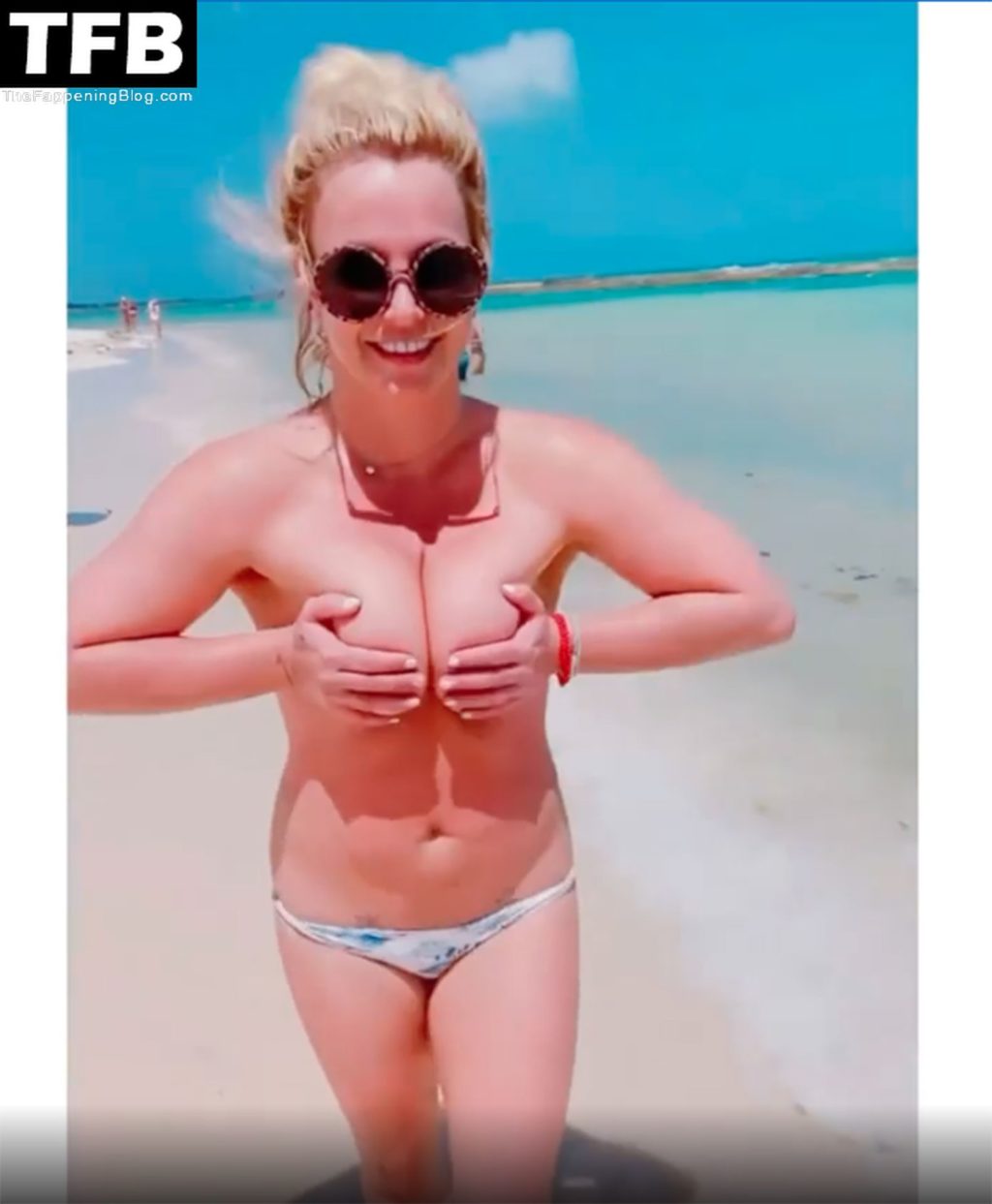 Britney posó en varias ocasiones, mostrando su figura tonificada antes de quitarse la parte superior del bikini y sostener sus pechos desnudos con ambas manos mientras sonreía y hacía un gesto de beso a la cámara.