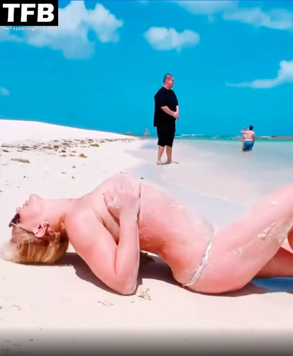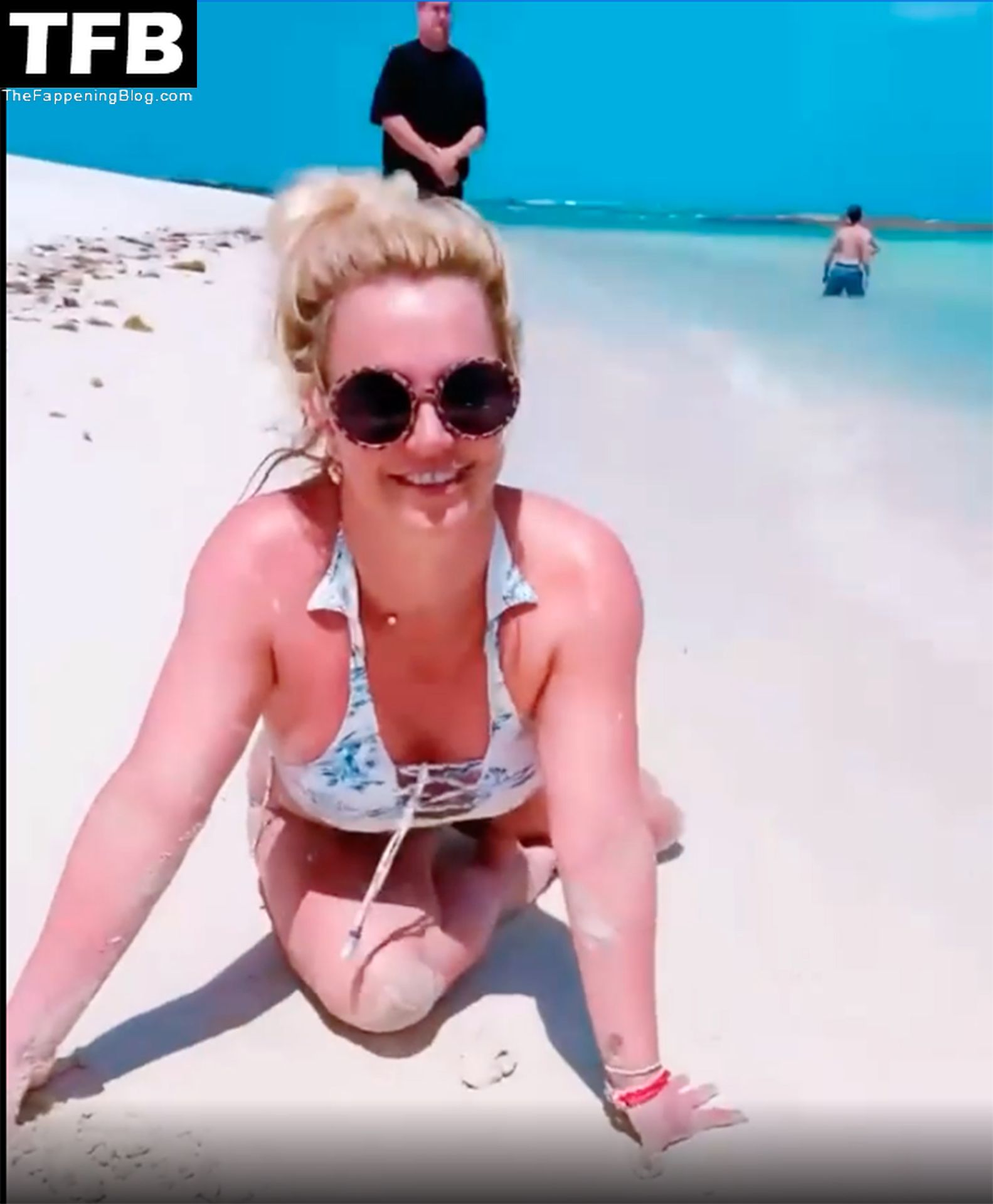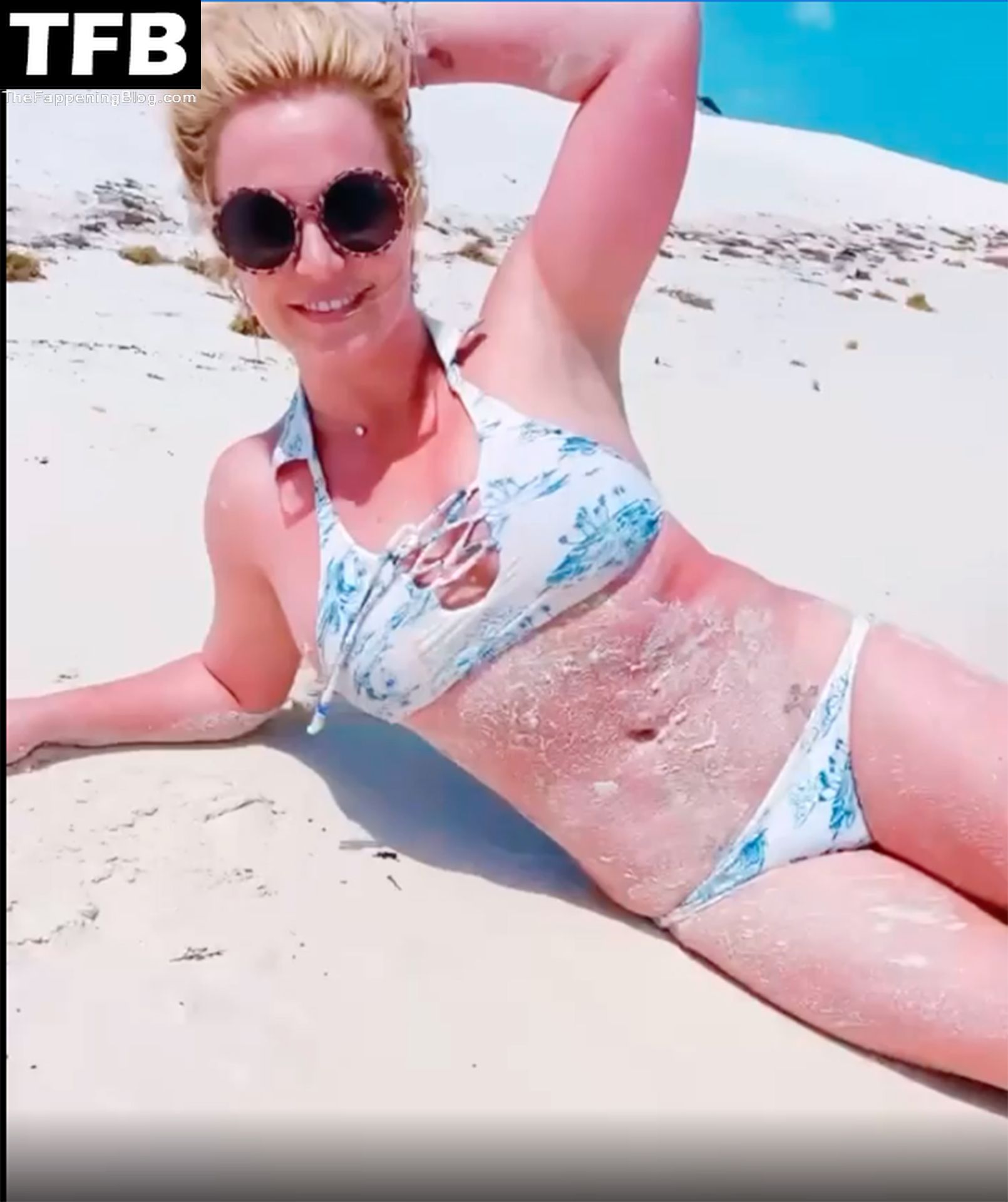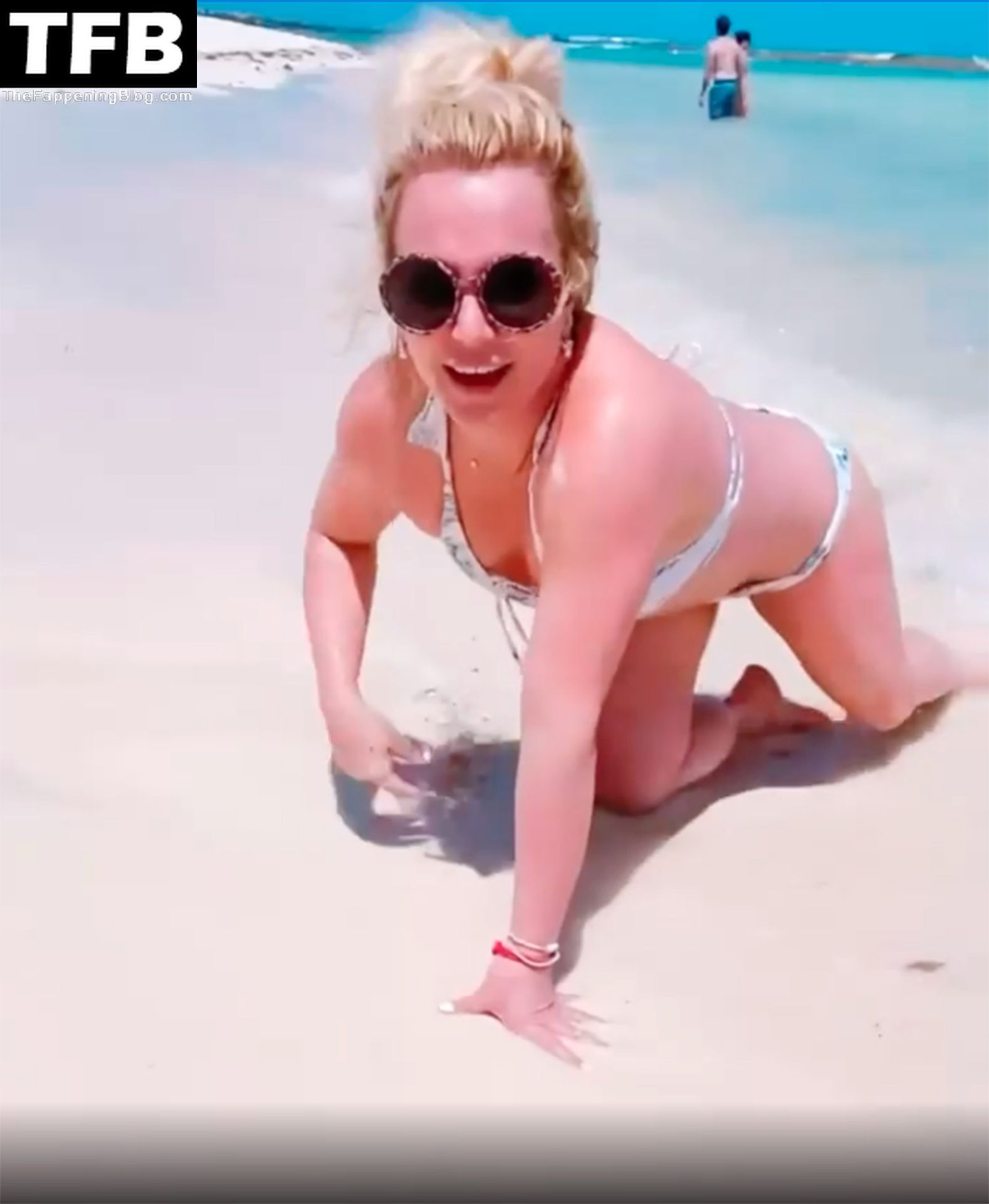 Britney posó en varias ocasiones, mostrando su figura tonificada antes de quitarse la parte superior del bikini y sostener sus pechos desnudos con ambas manos mientras sonreía y hacía un gesto de beso a la cámara.