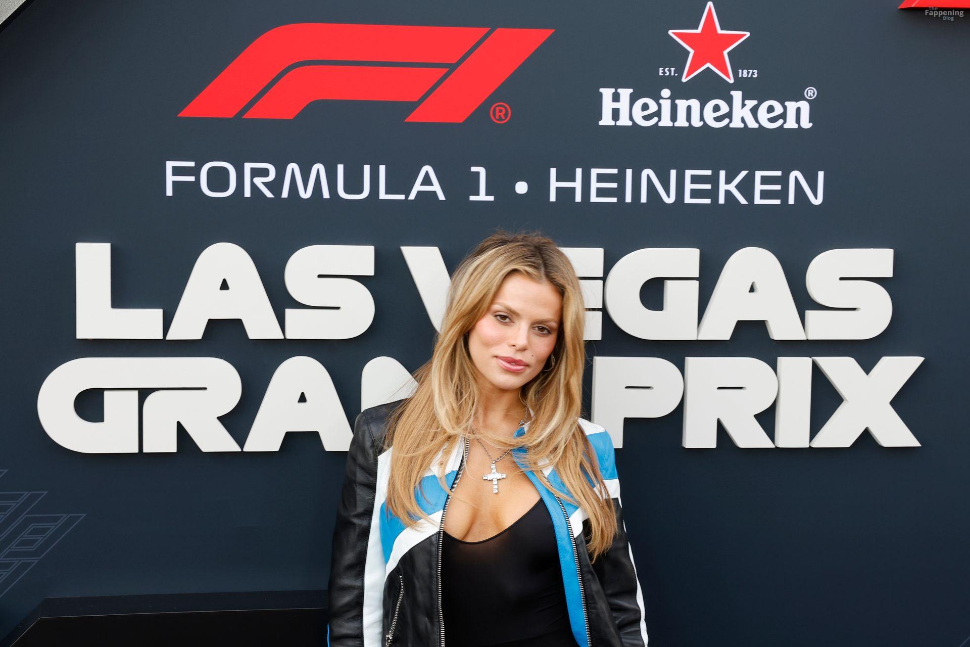Modelo y actriz Brooks Nader prescinde del sostén con un body transparente en el Gran Premio de Las Vegas en el Circuito de Las Vegas Strip.