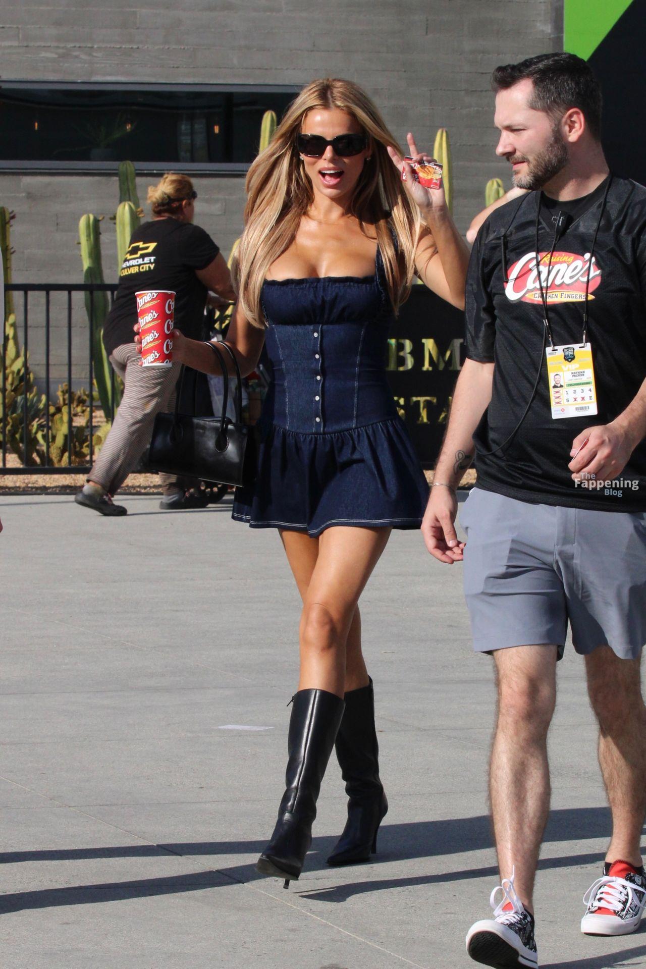 Brooks Nader es vista saliendo del partido de Fanatics Flag Football, caminando sin ropa interior con un vestido corto de mezclilla combinado con botas negras largas y gafas de sol mientras se dirige a salir después del evento.