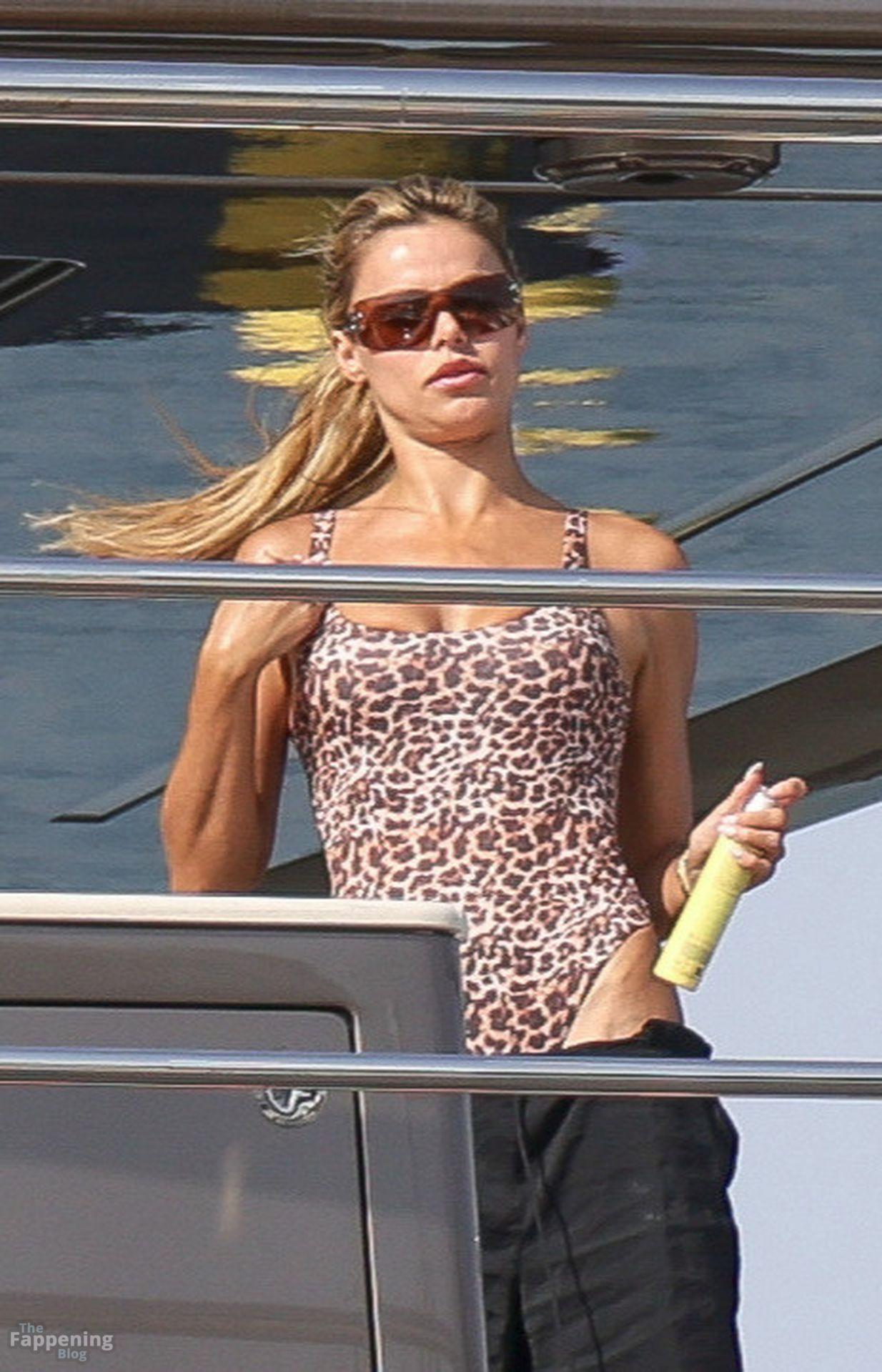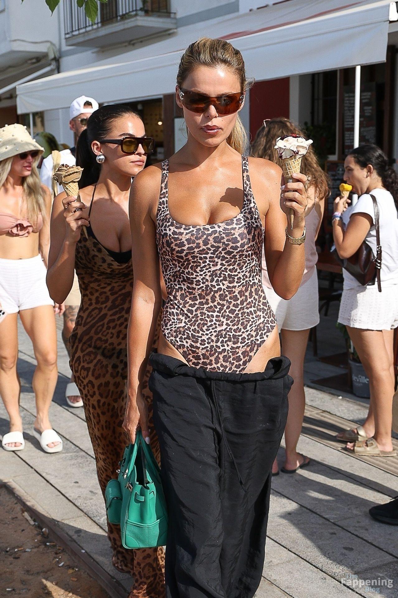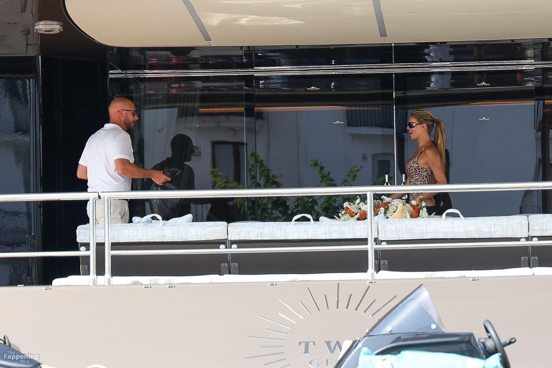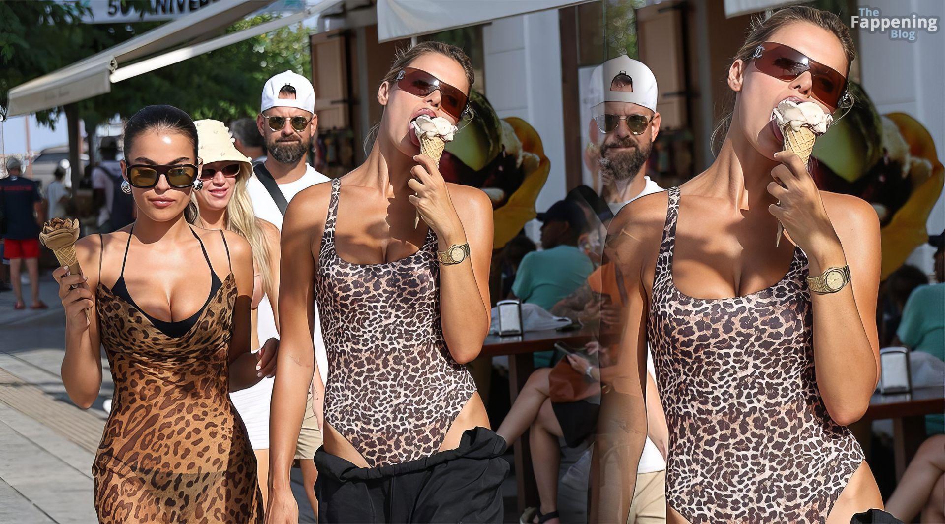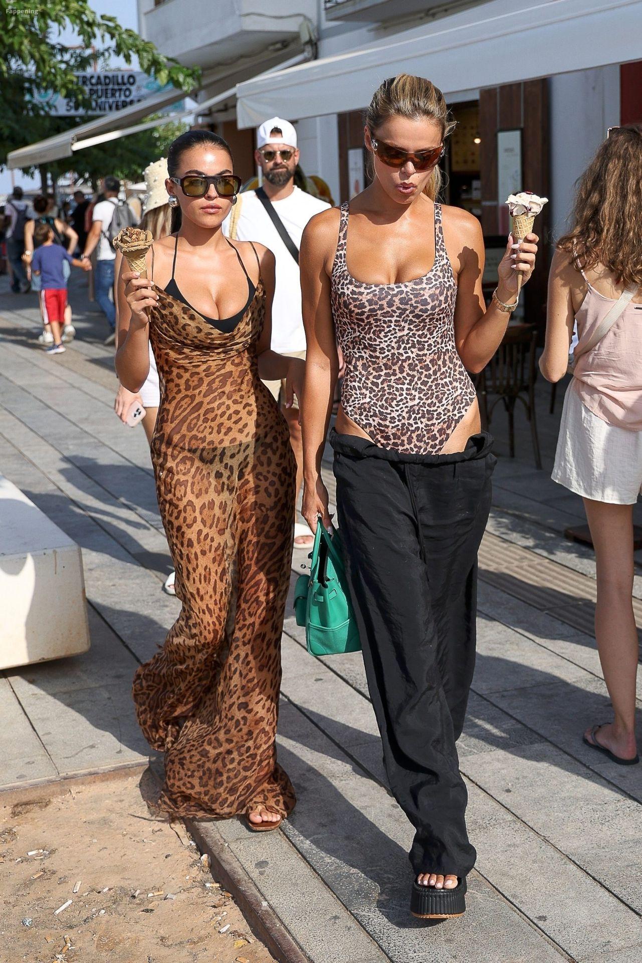 Brooks Nader y su hermana Sarah Jane Nader están relajándose en su superyate Twilight Georgetown de €10.9M en Ibiza, tomando el sol. Brooks lleva un traje de baño enterizo de leopardo con pantalones deportivos, mostrando su trasero y curvas mientras lleva un bolso Hermès Birkin. También están paseando por la ciudad, comiendo helado.
