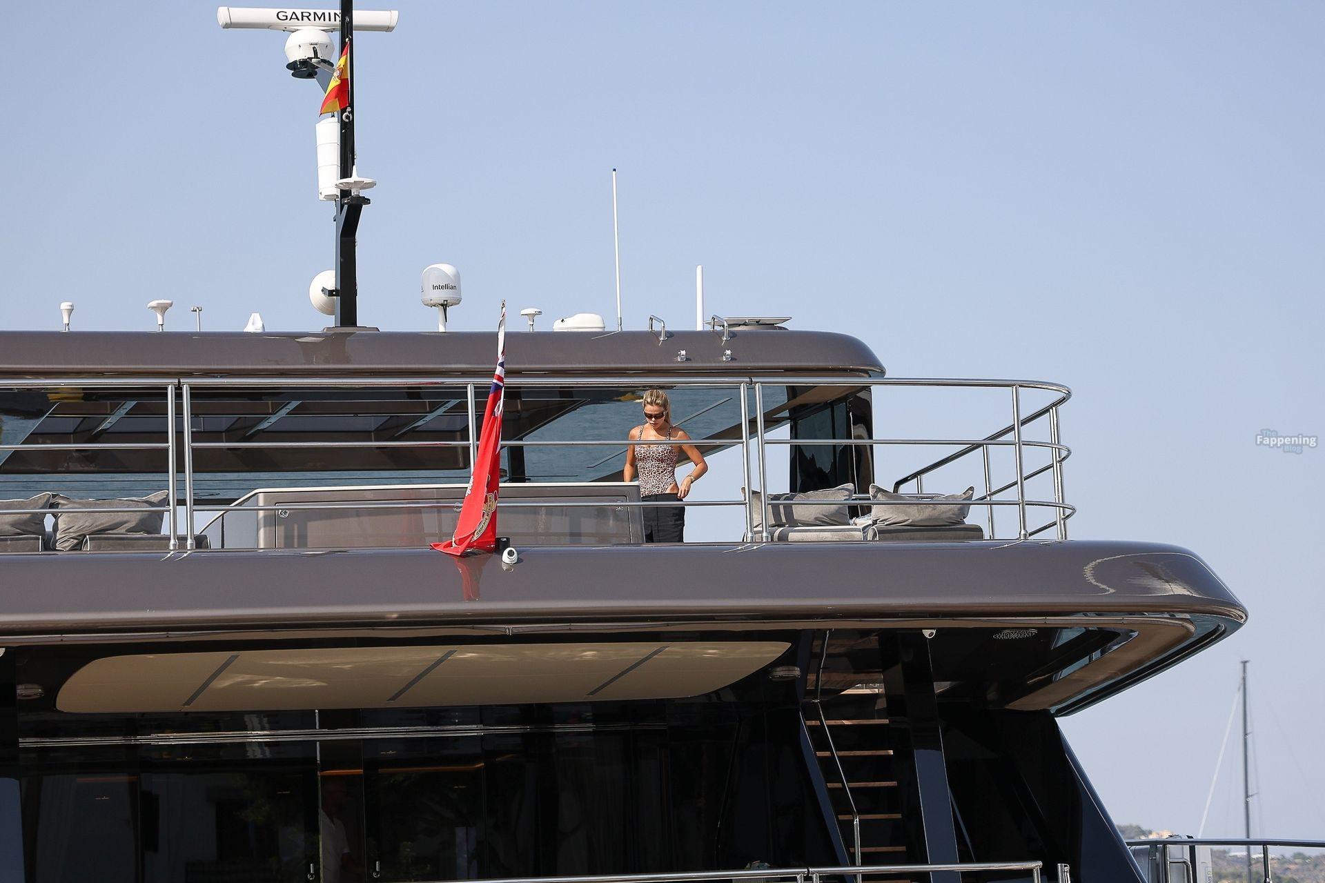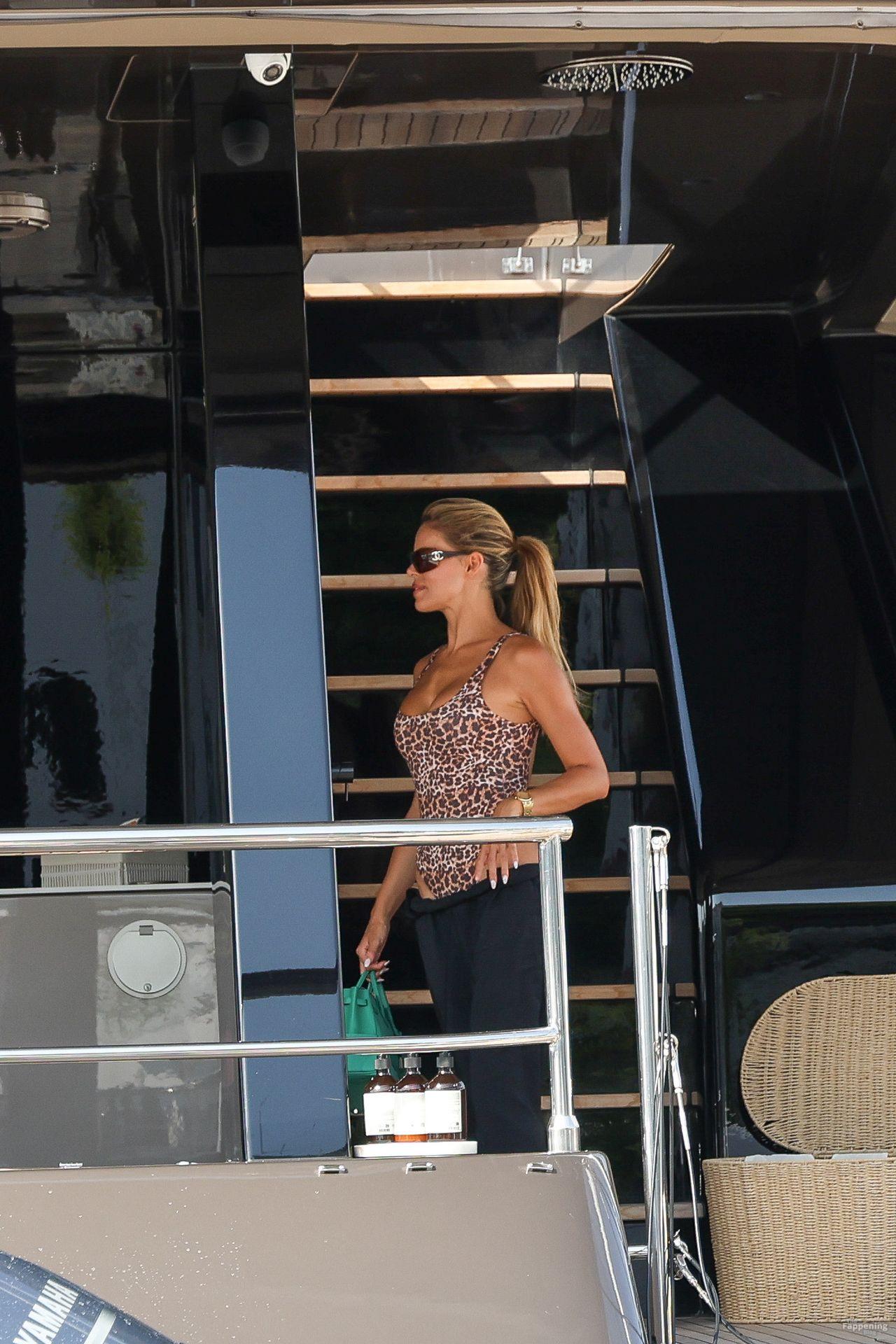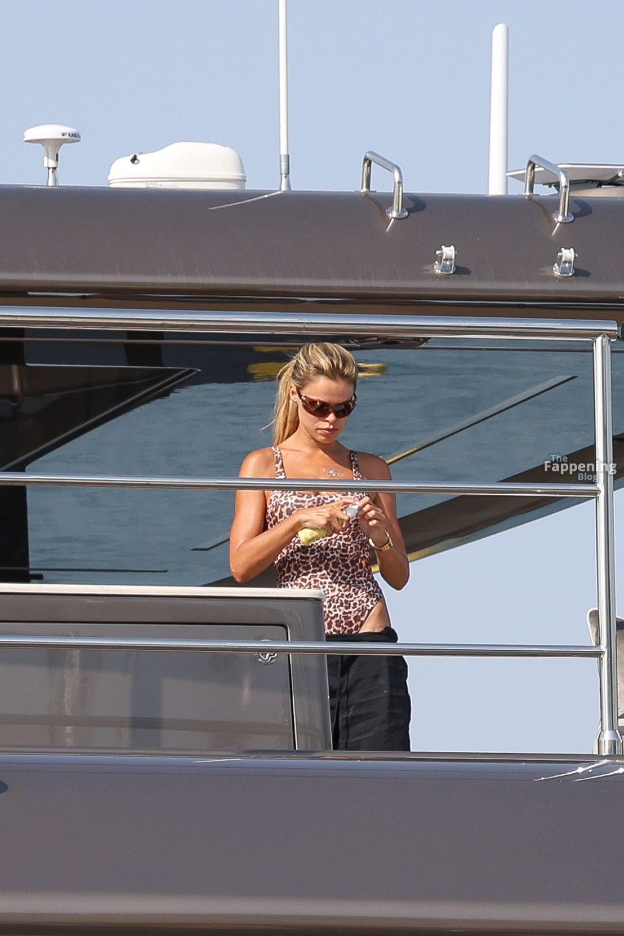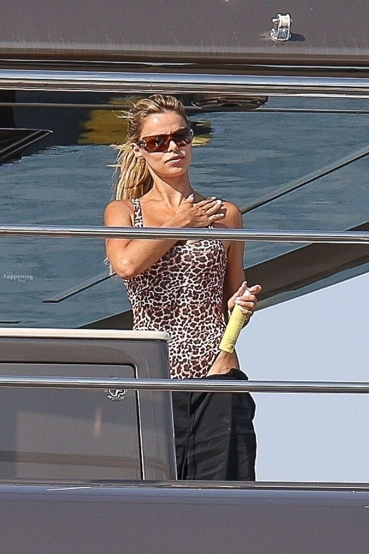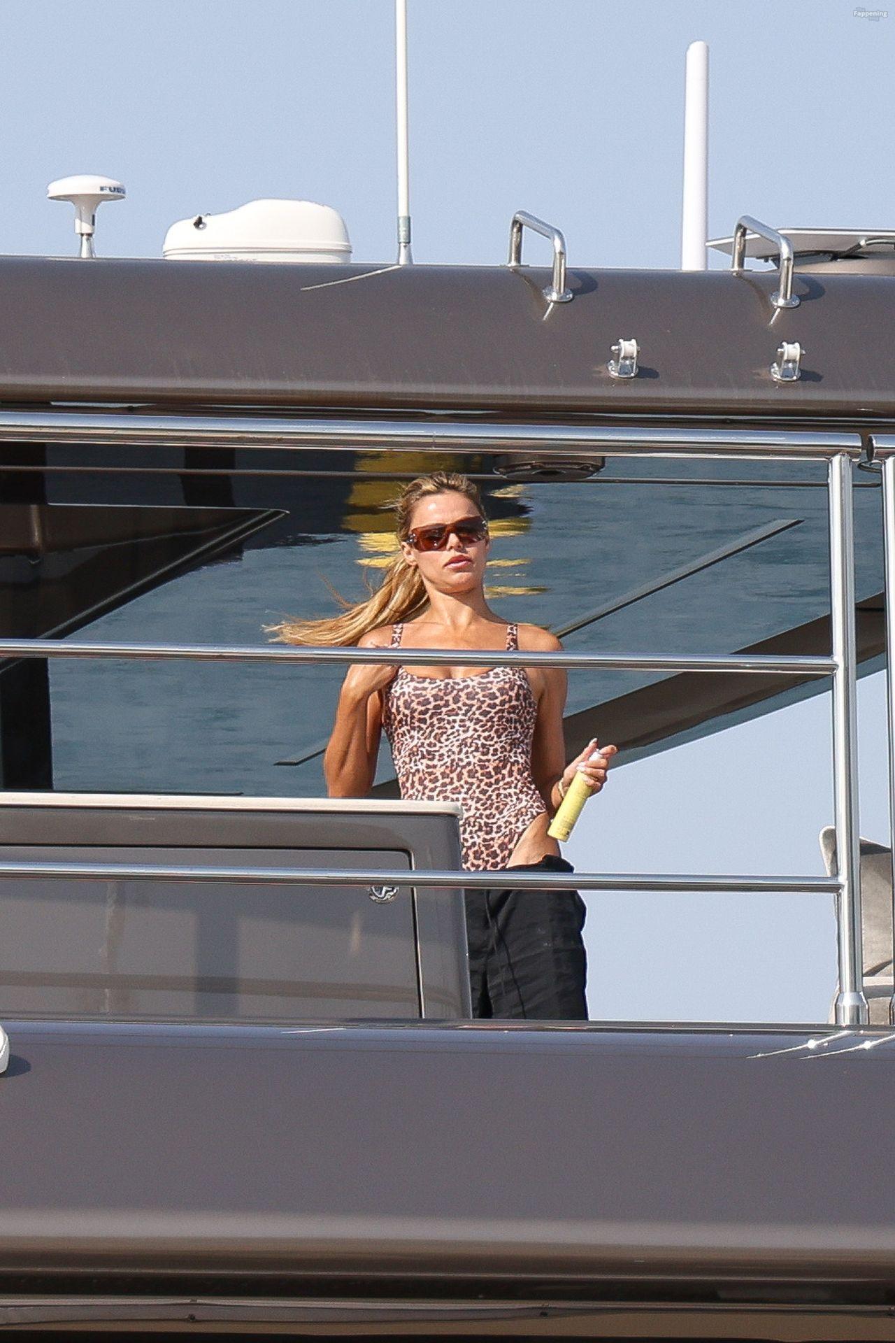 Brooks Nader y su hermana Sarah Jane Nader están relajándose en su superyate Twilight Georgetown de €10.9M en Ibiza, tomando el sol. Brooks lleva un traje de baño enterizo de leopardo con pantalones deportivos, mostrando su trasero y curvas mientras lleva un bolso Hermès Birkin. También están paseando por la ciudad, comiendo helado.