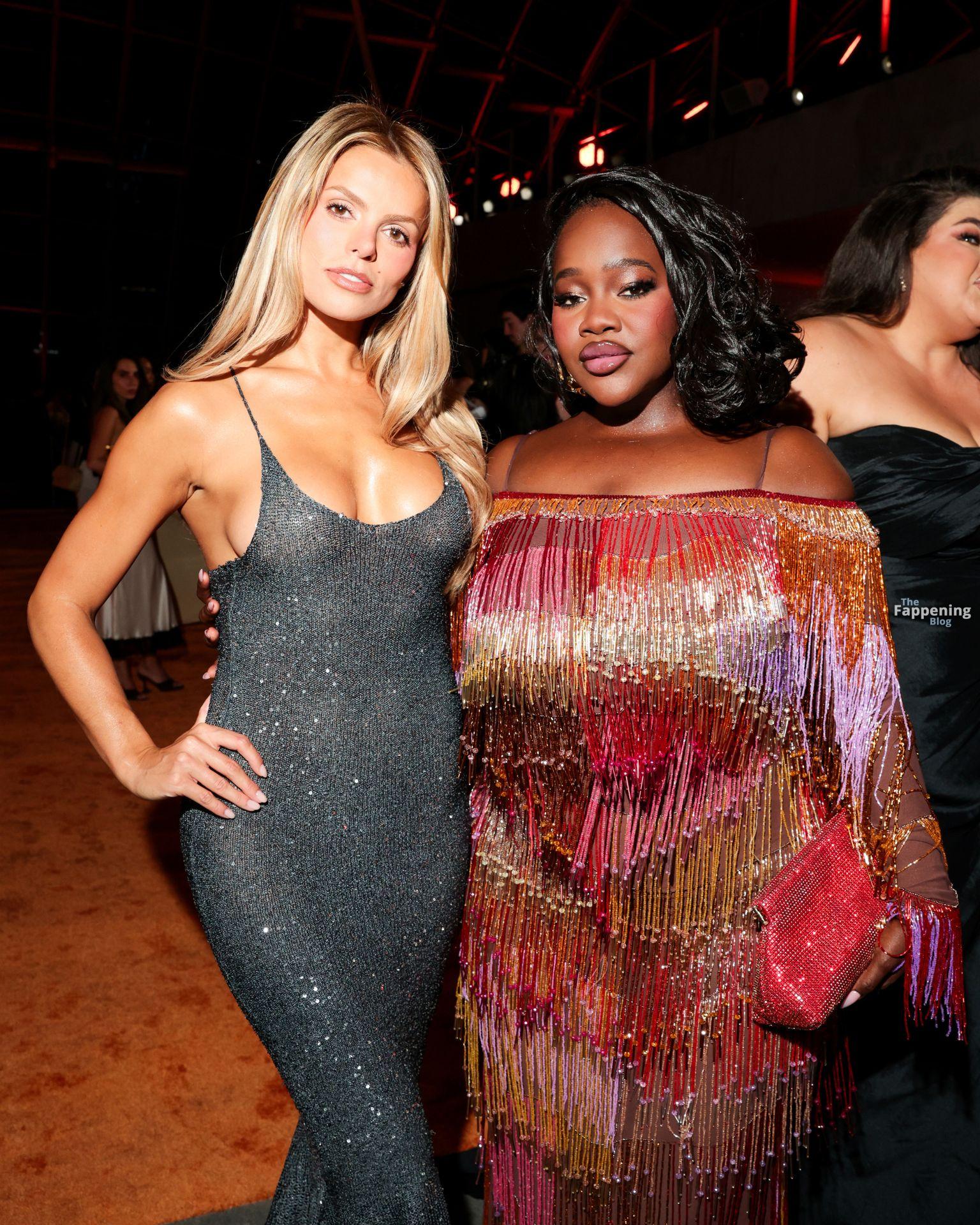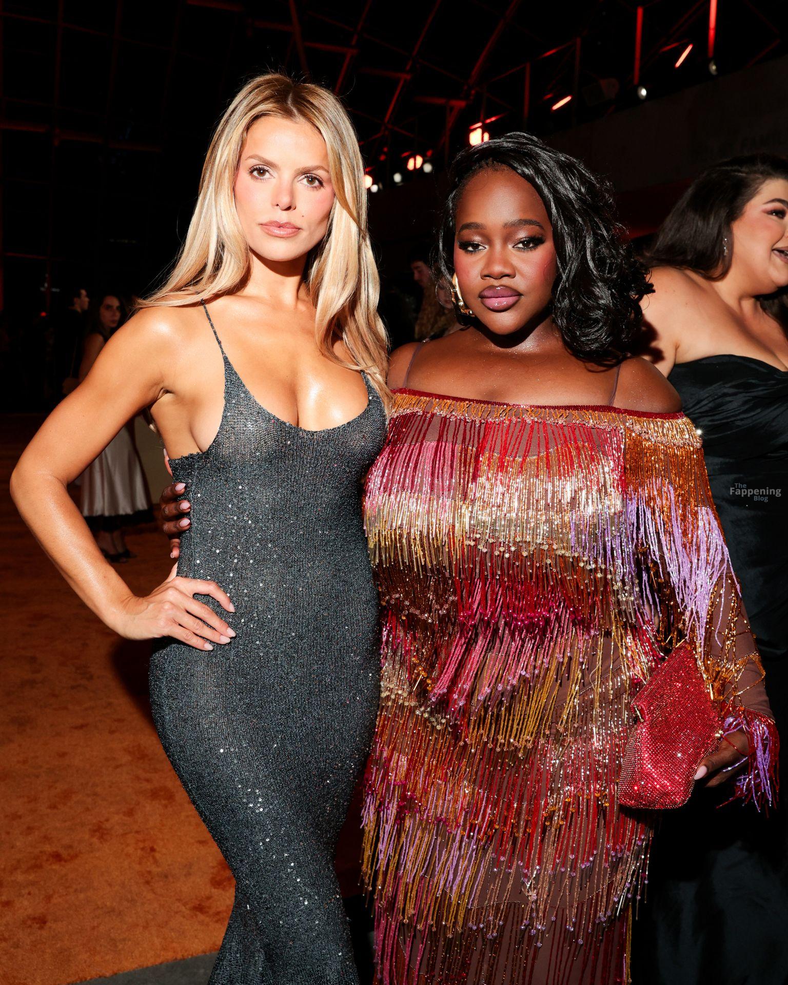 Brooks Nader va sin sostén con un vestido de punto ajustado mientras asiste a Clarins Celebrates Extra-Firming Energy con The Night Of Extra en Dolby Terrace en el Academy Museum of Motion Pictures en Los Ángeles, California.