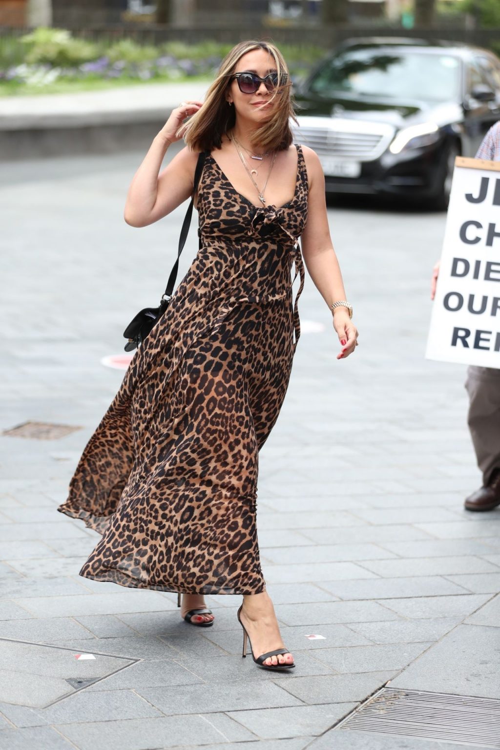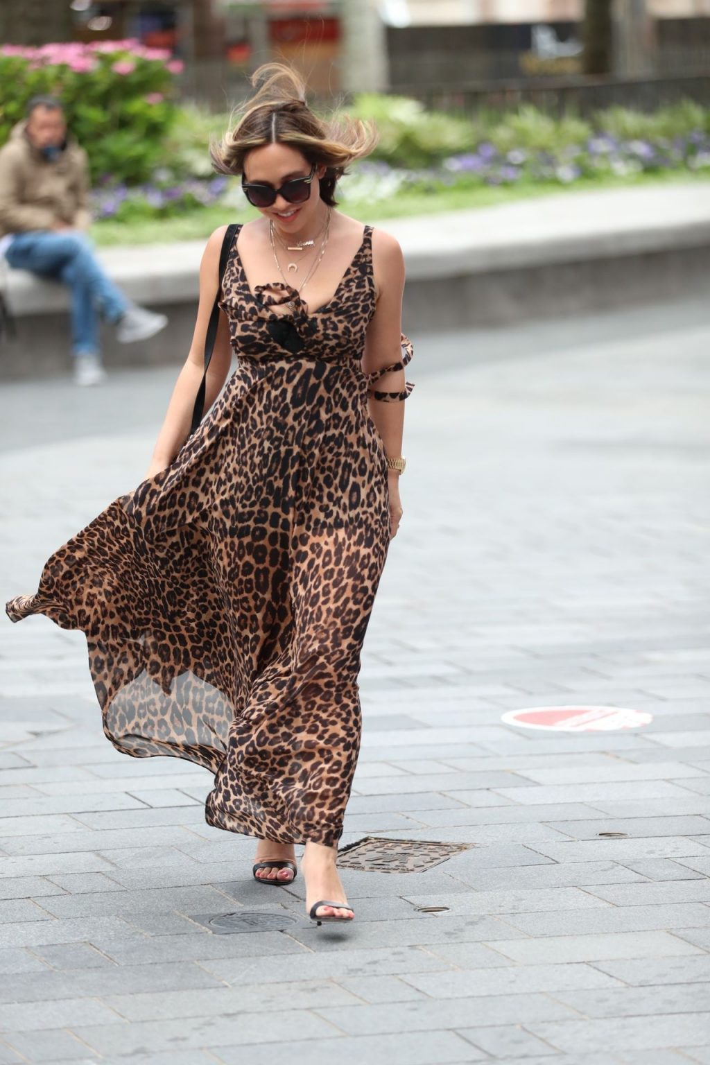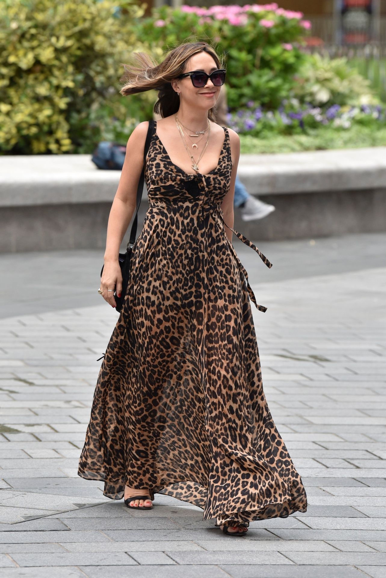 Myleene Klass llega a Smooth Radio con nuevo cabello rubio y vestido de leopardo con escote pronunciado en Londres, 07/06/2020.