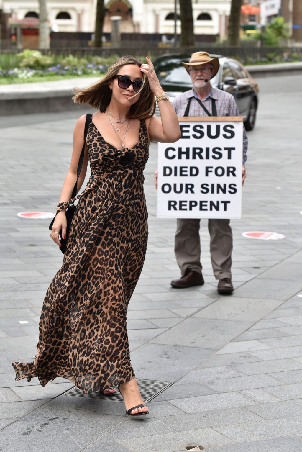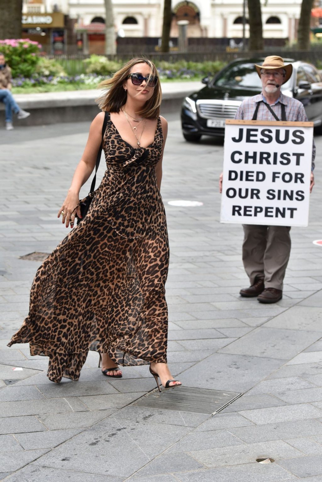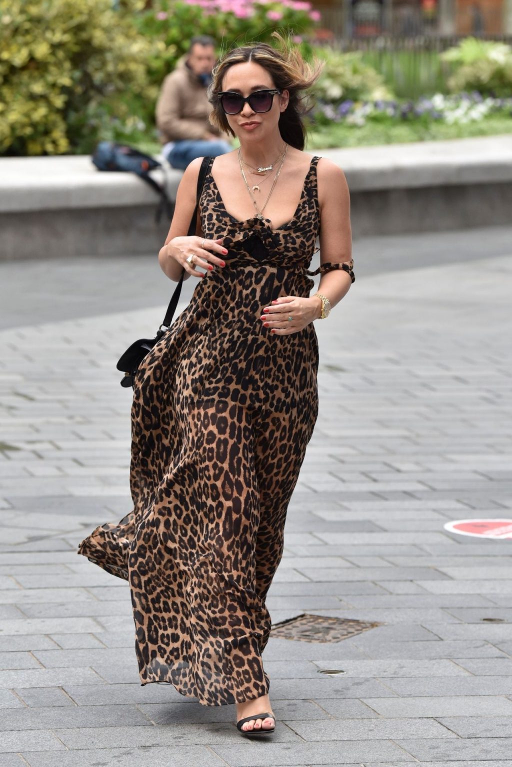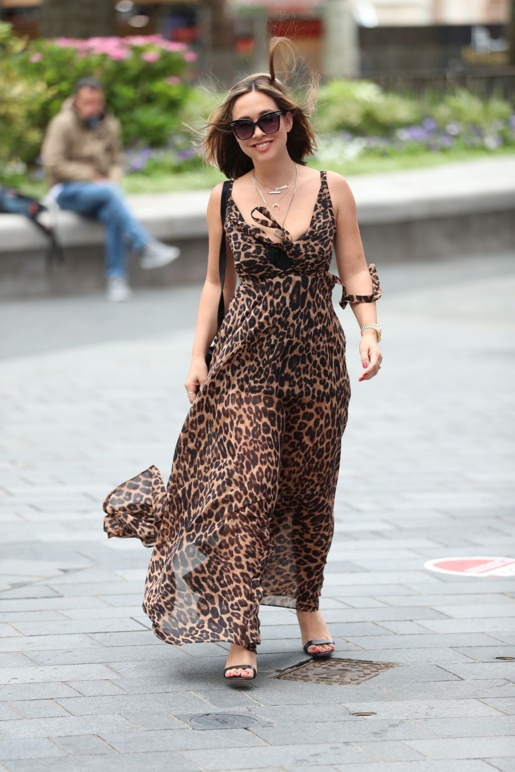 Myleene Klass llega a Smooth Radio con nuevo cabello rubio y vestido de leopardo con escote pronunciado en Londres, 07/06/2020.