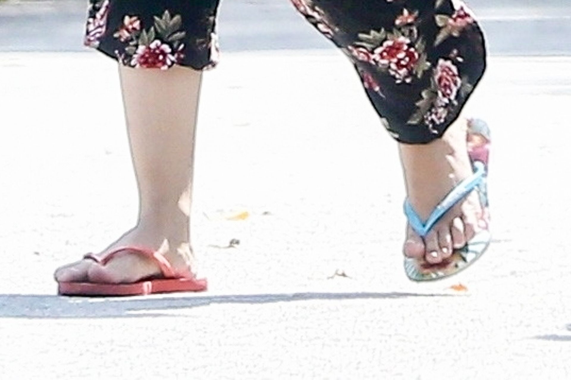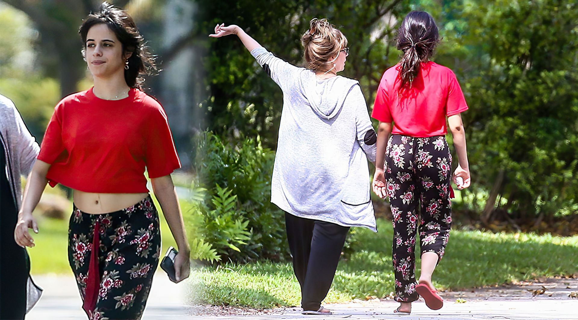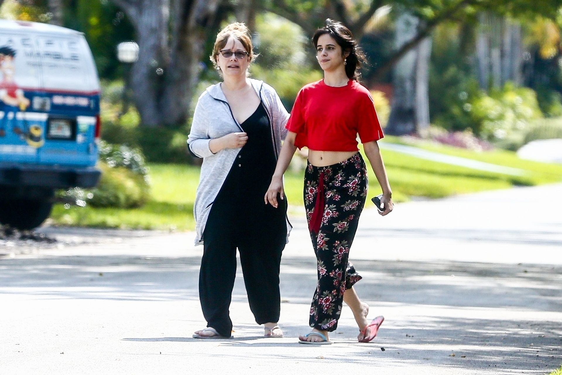 La cantante Camila Cabello y su mamá Sinuhe Estrabao disfrutan del aire fresco durante un paseo matutino en Florida, 20/04/2020. Camila salió con un top rojo corto y pantalones sueltos con estampado floral y sandalias de diferentes colores.