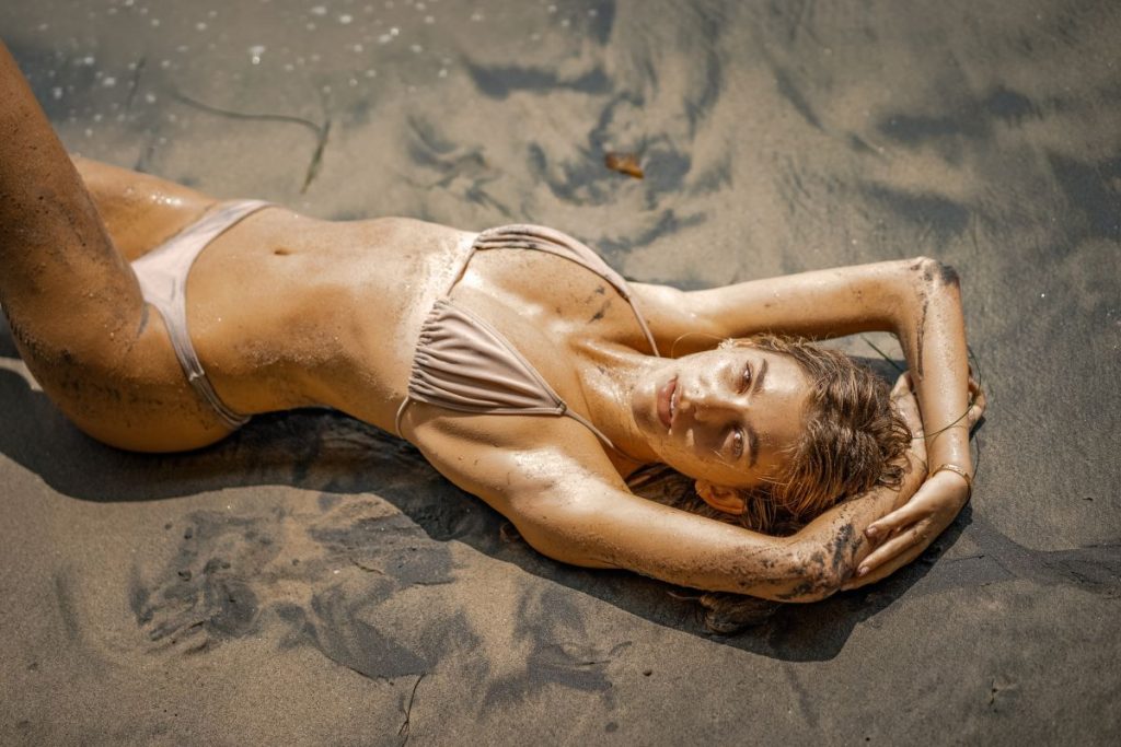 Modelo/actriz Camila (Cami) Morrone muestra su cuerpo sensual y sus magníficos pechos posando con un bikini diminuto en la playa de Malibu para una antigua sesión de fotos de Kesler Tran (2016).