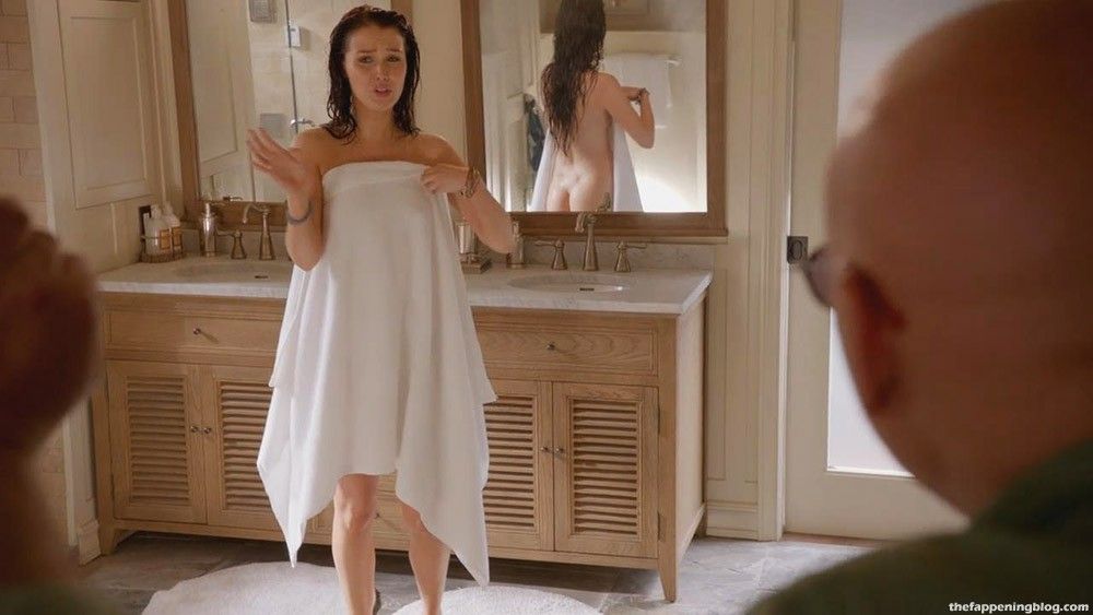 The third scene contains nude Camilla Luddington, her naked ass, and her tits in a bathroom. She is standing in front of a guy with a towel around her. In one moment, she reveals her nude boobs and round butt: Luddington’s naked boobs and big butt in a nude scene.
