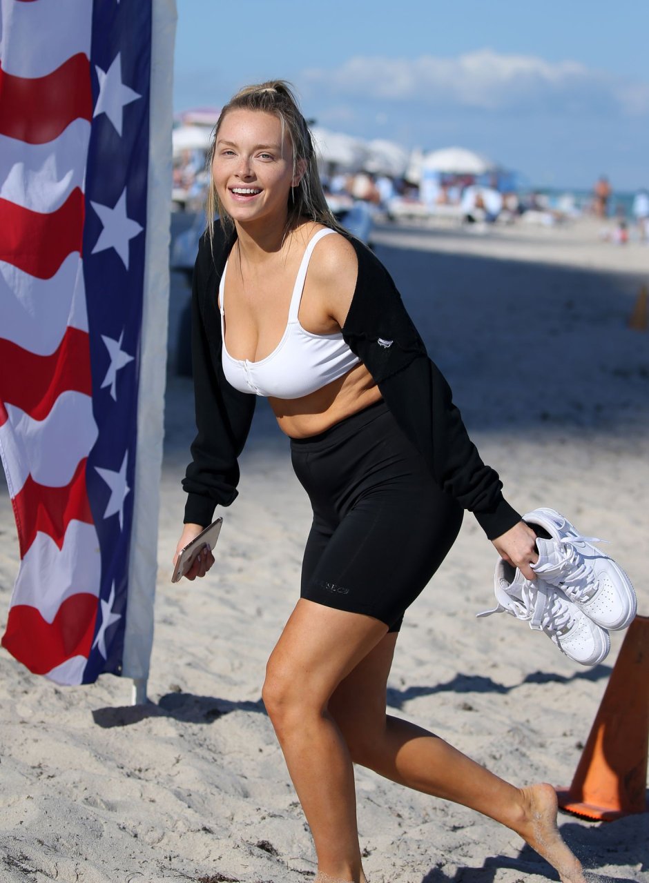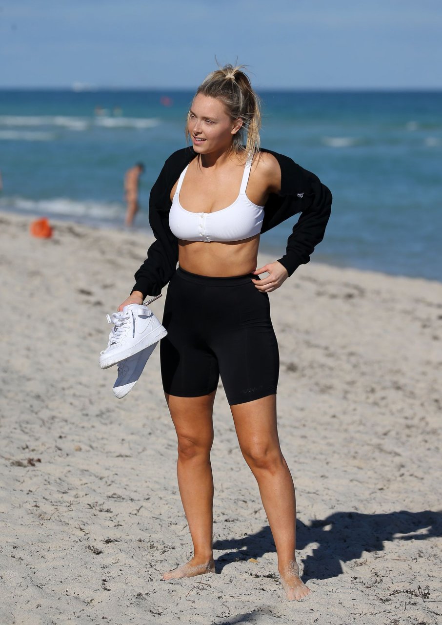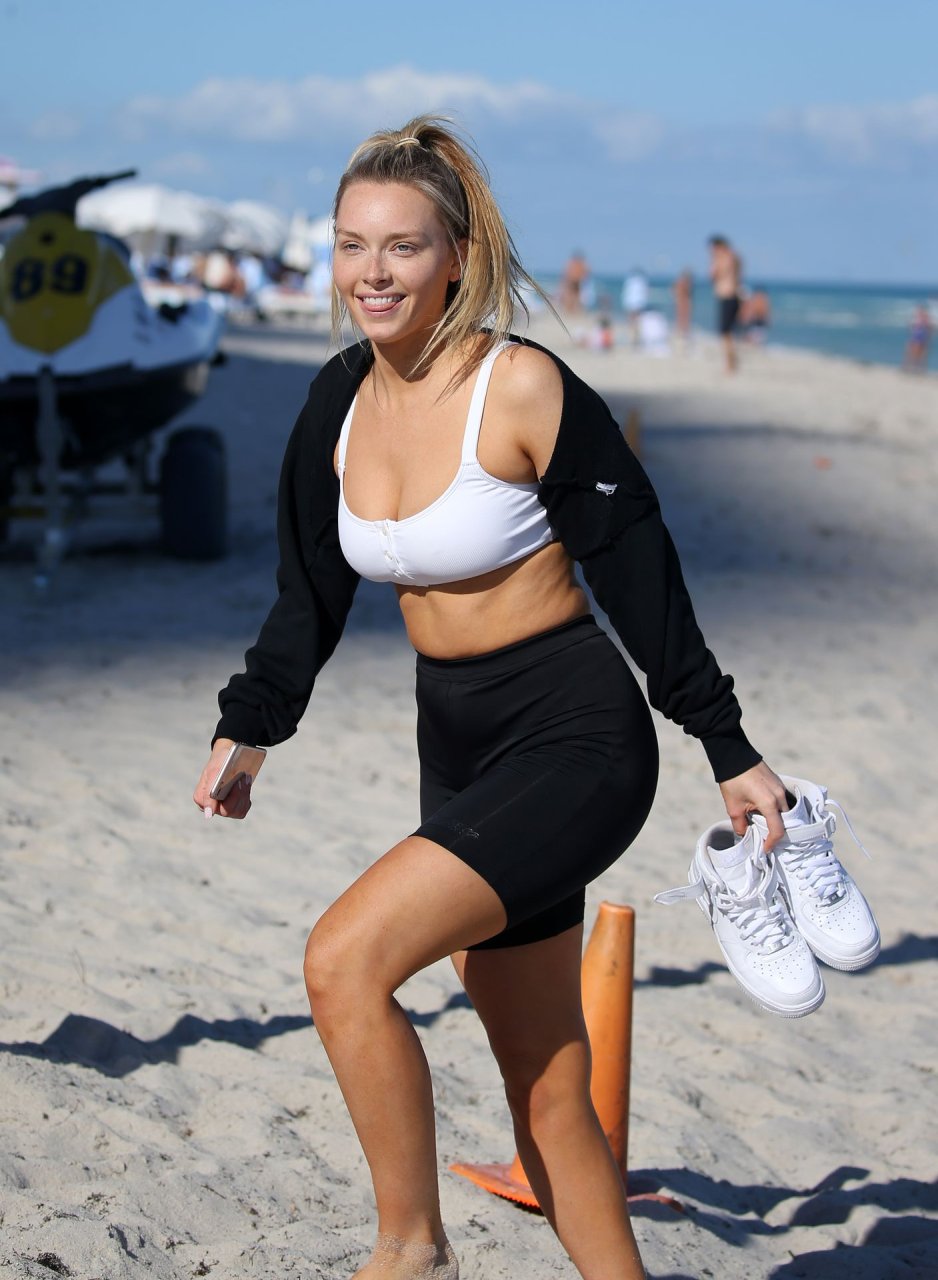 La modelo de Sports Illustrated Camille Kostek (26) lleva un top de bikini blanco mientras monta una moto acuática en Miami, 01/06/2019. Su novio, la leyenda de la NFL Rob Gronkowski, no se vio por ningún lado.