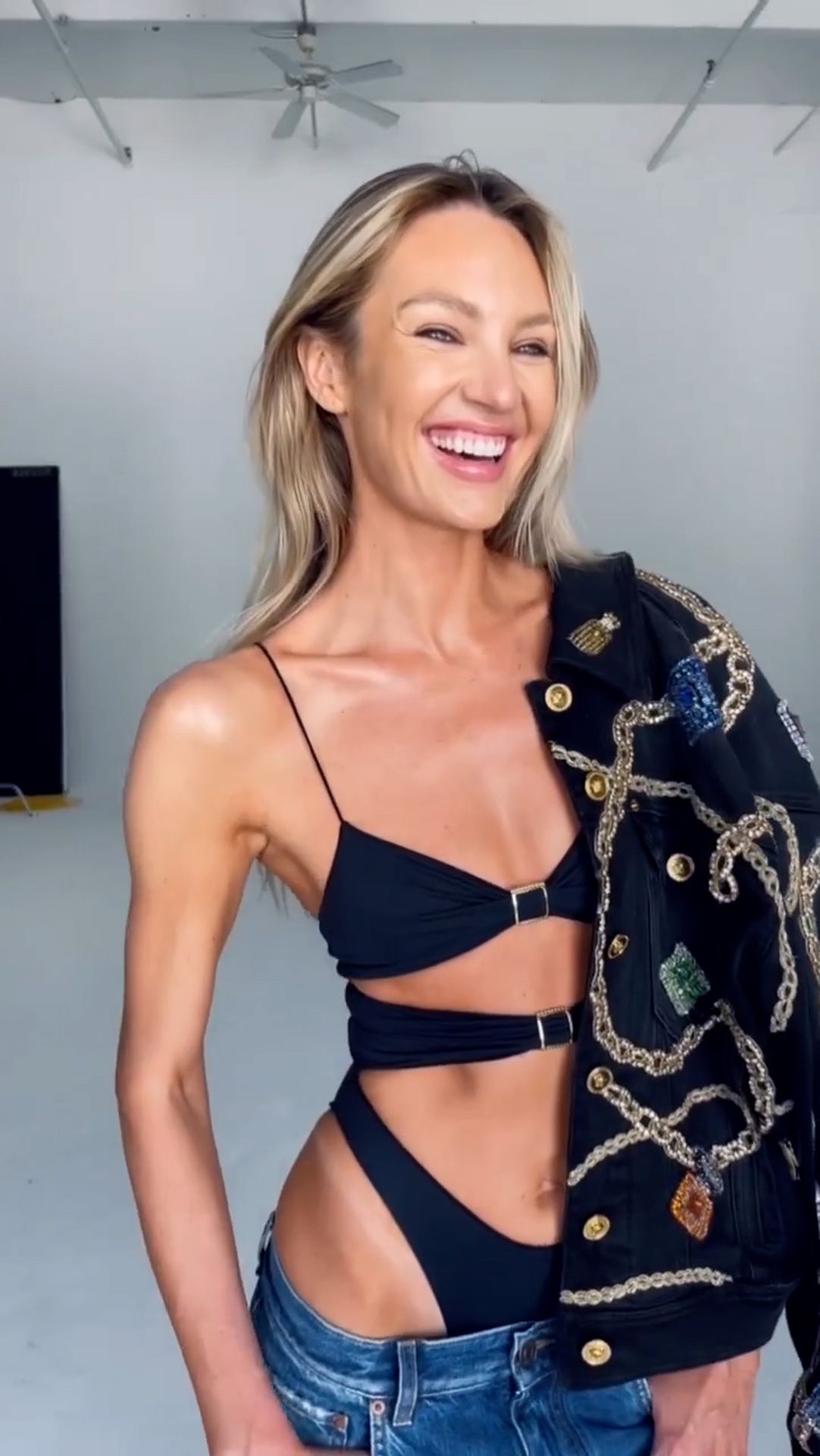 La modelo también posa con unos elegantes jeans de tiro bajo que muestran sus bragas altas y un pequeño top negro. Esta foto demuestra que Candice puede combinar sexualidad y elegancia de manera totalmente natural en una sola imagen. Sin duda, este material BTS será adorado por los fans de la modelo.