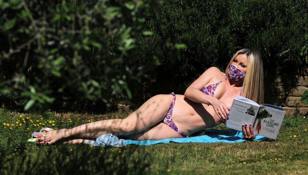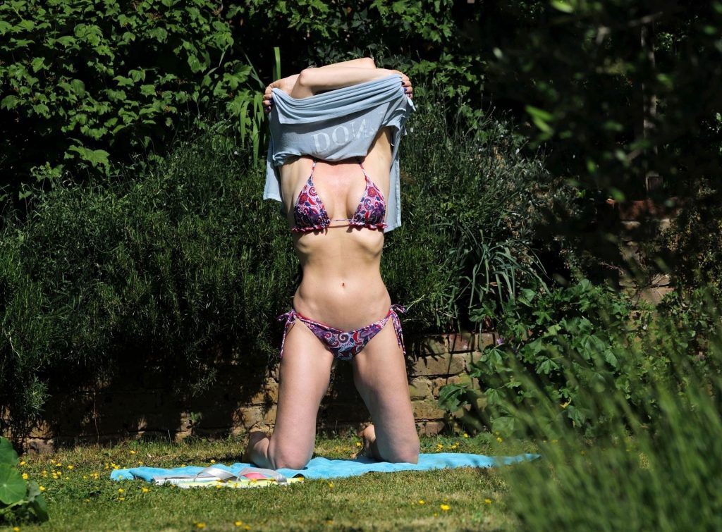La modelo estadounidense de 48 años Caprice Bourret muestra su físico tonificado mientras toma el sol con un sexy trikini de tres piezas a juego en un parque de Londres, disfrutando del reciente clima cálido de verano, 31/05/2020.